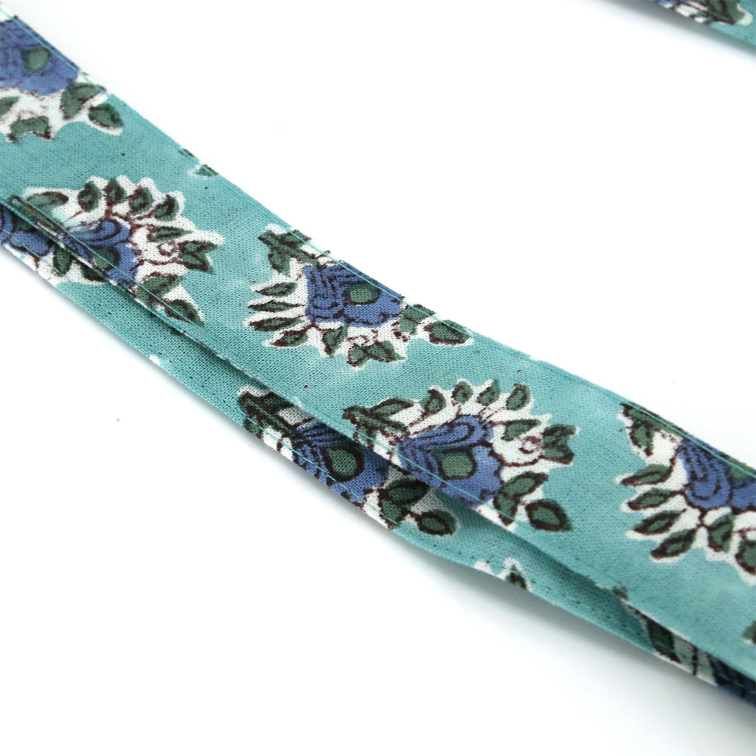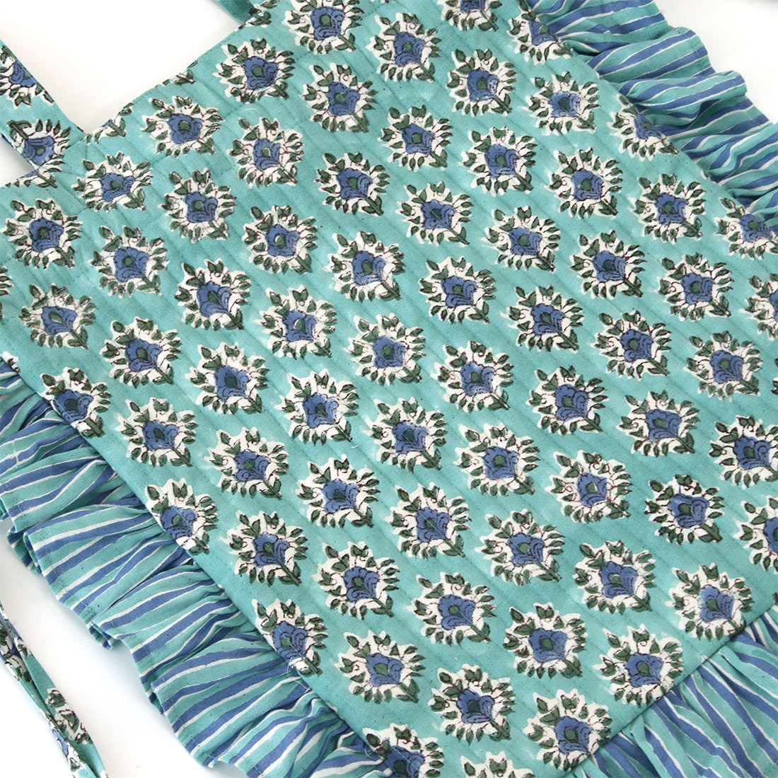 ブロックプリントのキルティング生地とフリルがが可愛いトートバッグ。口を絞って小ぶりなバッグとして、絞らずに使えばA4サイズがすっぽりと収まります。