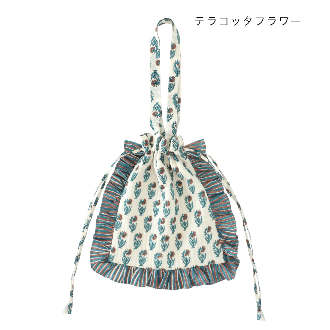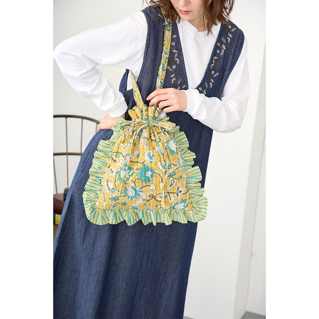 ブロックプリントのキルティング生地とフリルがが可愛いトートバッグ。口を絞って小ぶりなバッグとして、絞らずに使えばA4サイズがすっぽりと収まります。