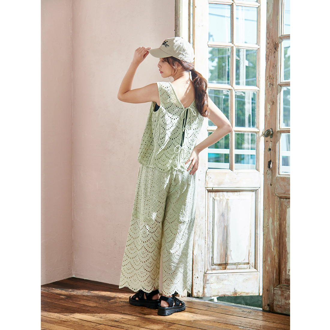 透かしのある刺しゅう生地を使ったトレンド感のあるシリーズです。シフリーの透け感が夏の日差しにピッタリ。トップスは前後2WAYで着られます。Tシャツに合わせてベストとして着用しても、パンツとセットアップコーデを組んでも◎