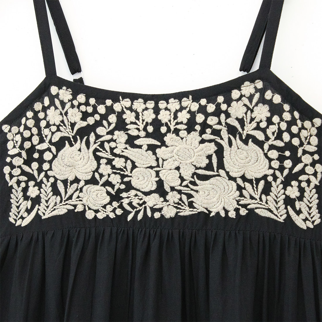 シンプルなキャミワンピースの胸元に入った刺しゅうがポイント。これ一枚でさっぱりと着られます。丈は肩紐で調節可能です。両ポケット付き。