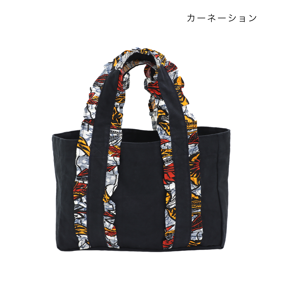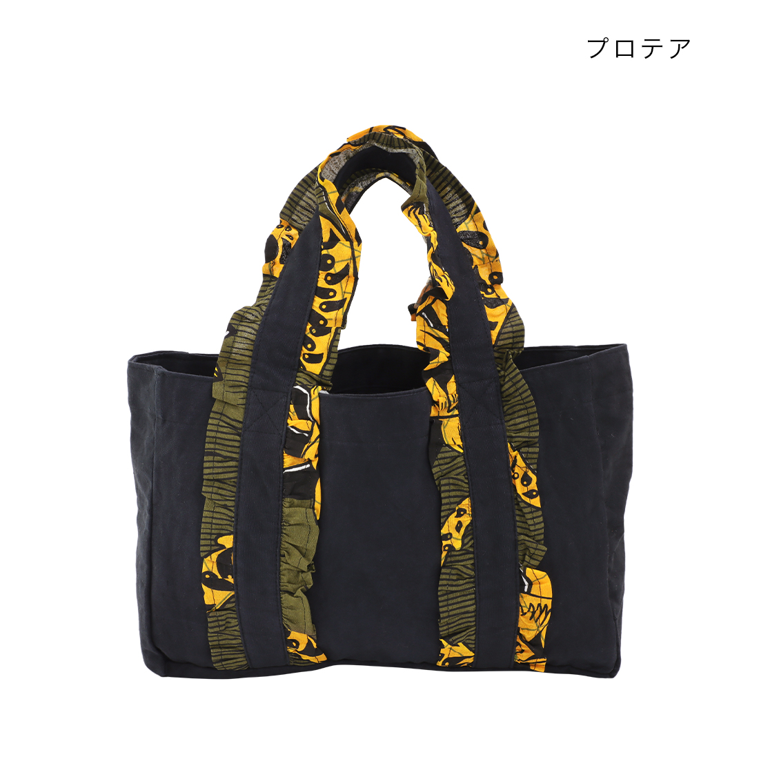 シンプルなキャンバスバッグに、アフリカンプリント柄のフリルををプラス。さり気ないアフリカンプリントでコーディネートしやすいバッグです。