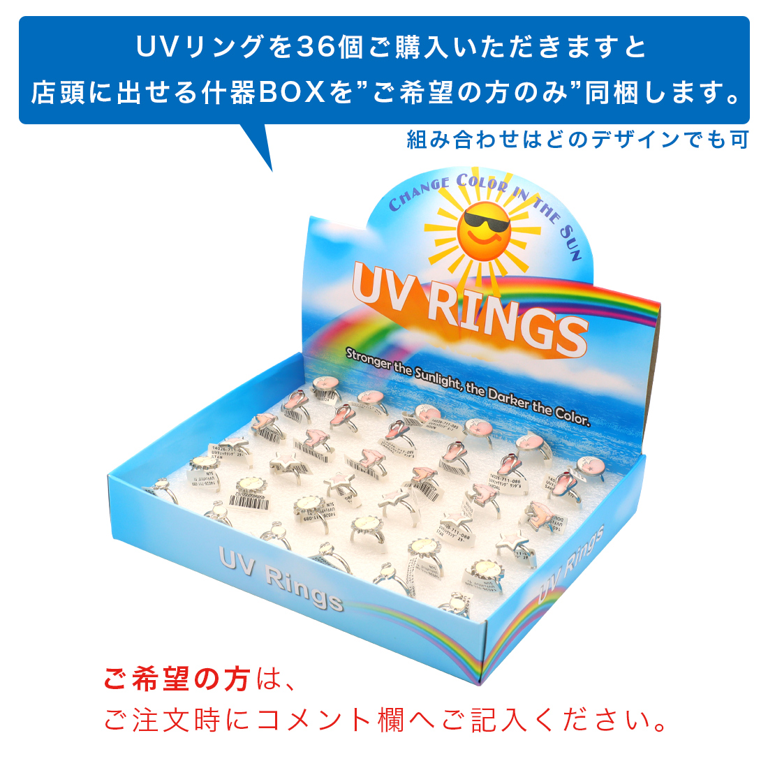 UVリングを36個ご購入いただきますと店頭に出せる什器BOXを”ご希望の方のみ”同梱します。