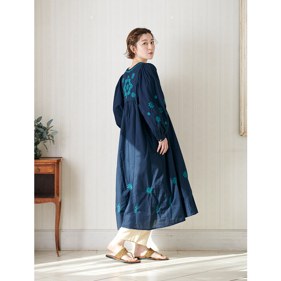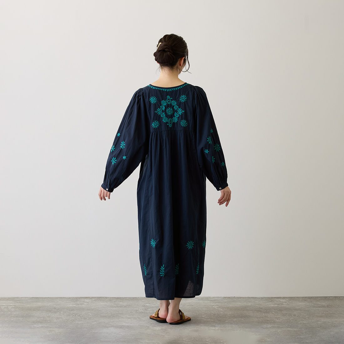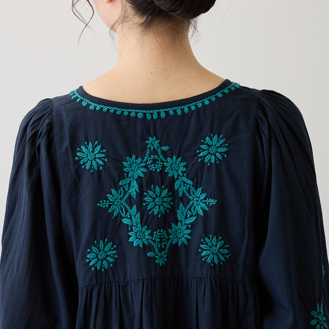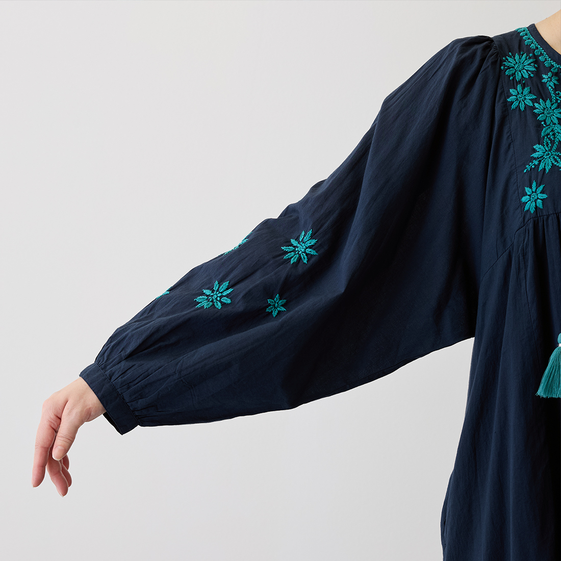 胸元、背中、そして袖と裾にも美しい刺しゅうがたっぷりと散りばめられています。
