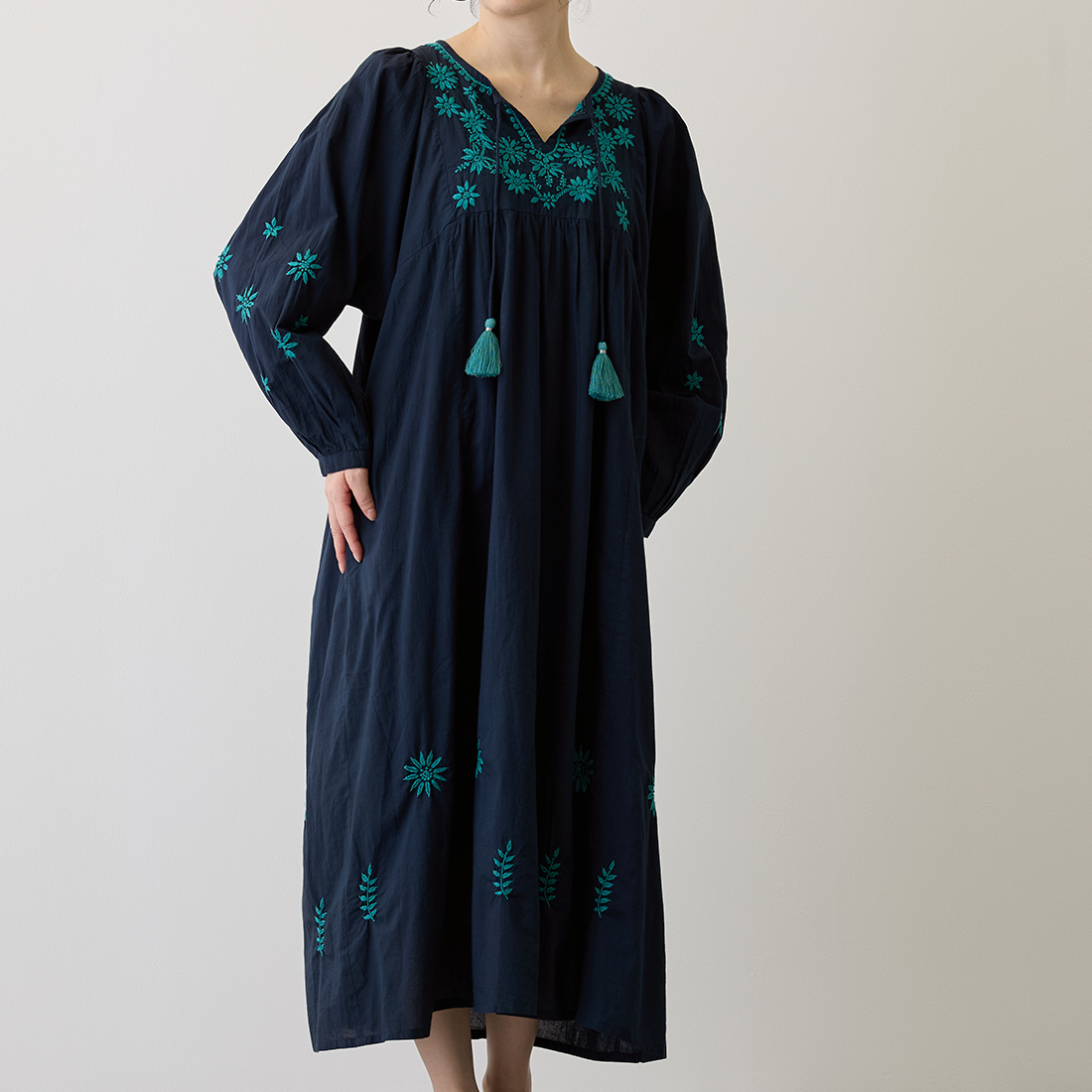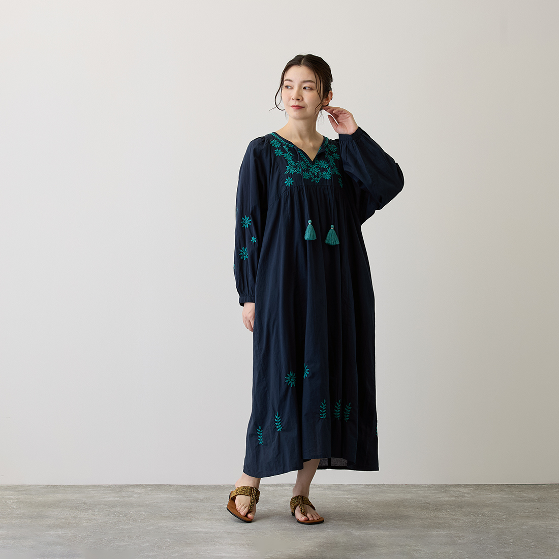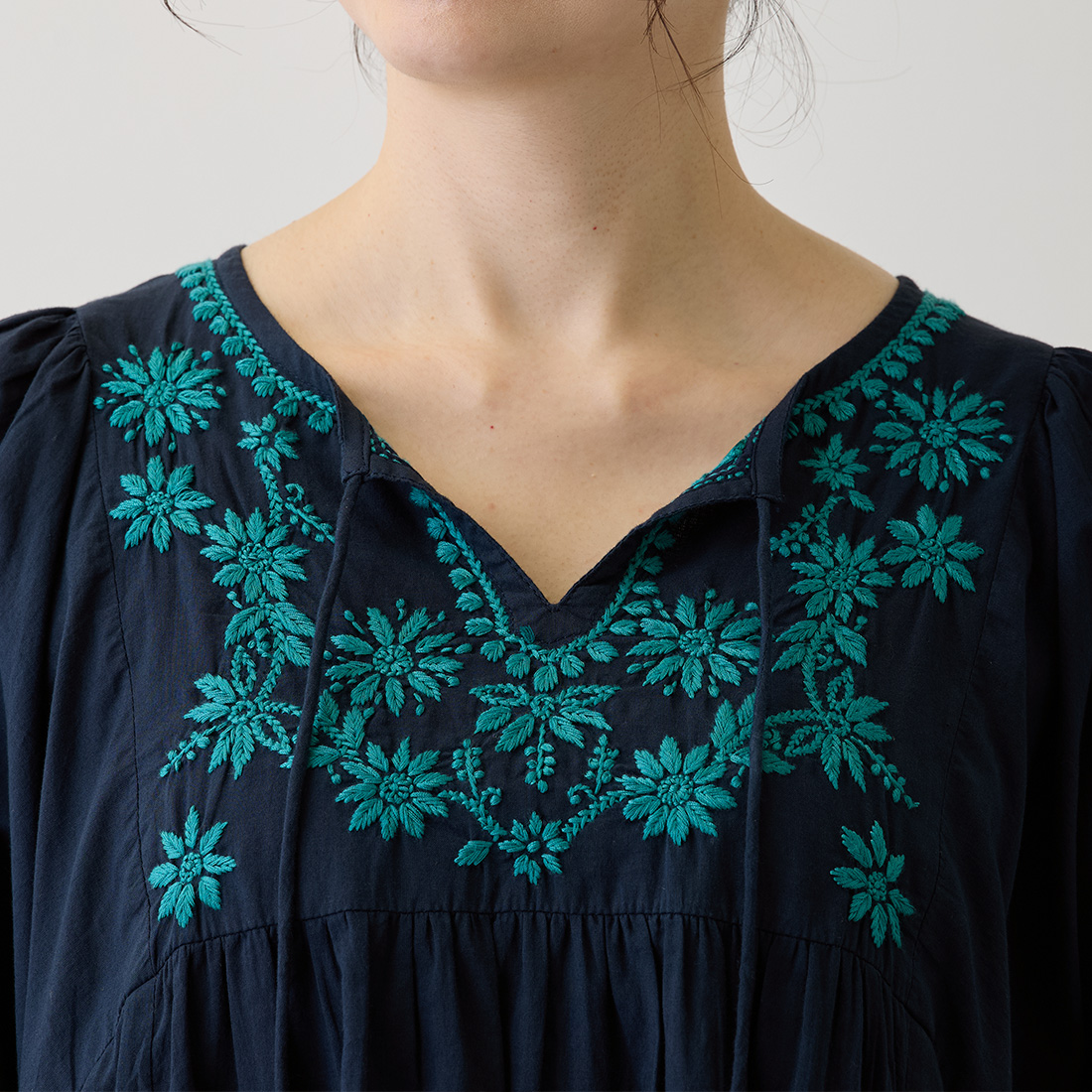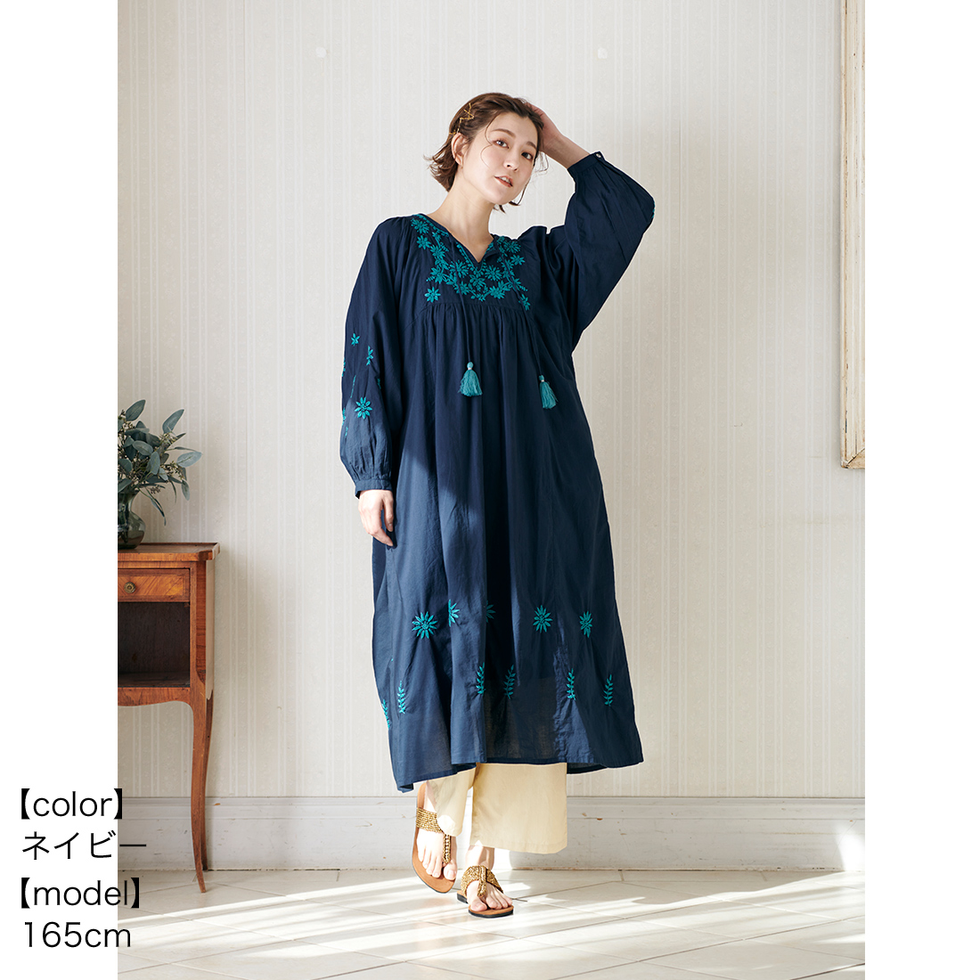 胸元、背中、そして袖と裾にも美しい刺しゅうがたっぷりと散りばめられています。