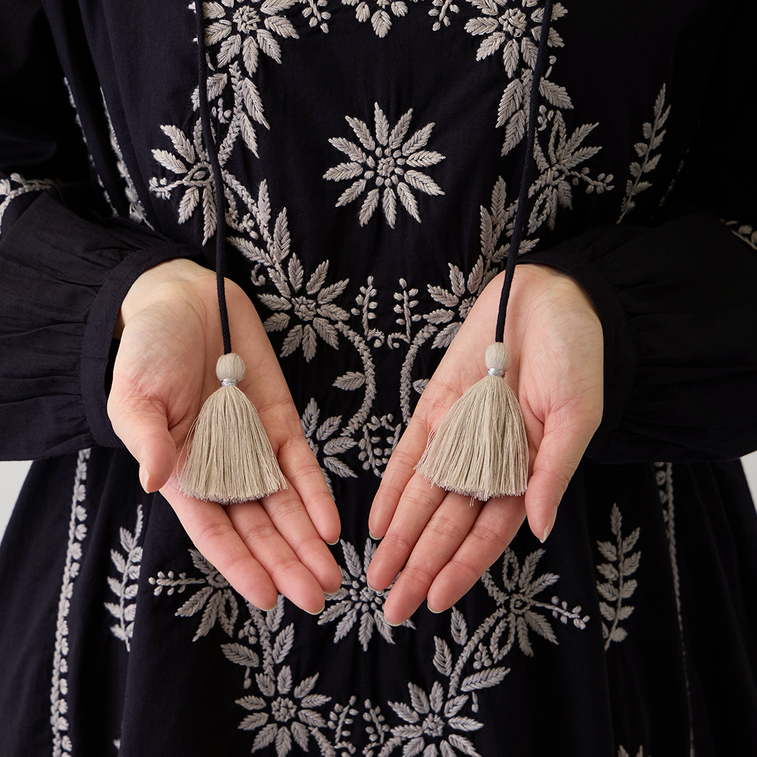 刺しゅうと同色のタッセルもアクセントになっており、背中の花柄も目を引きます。