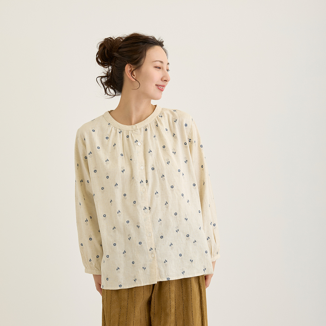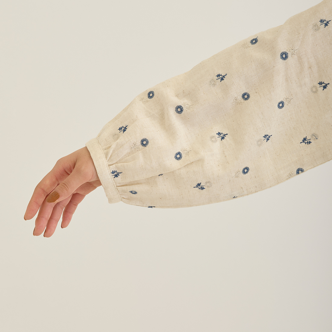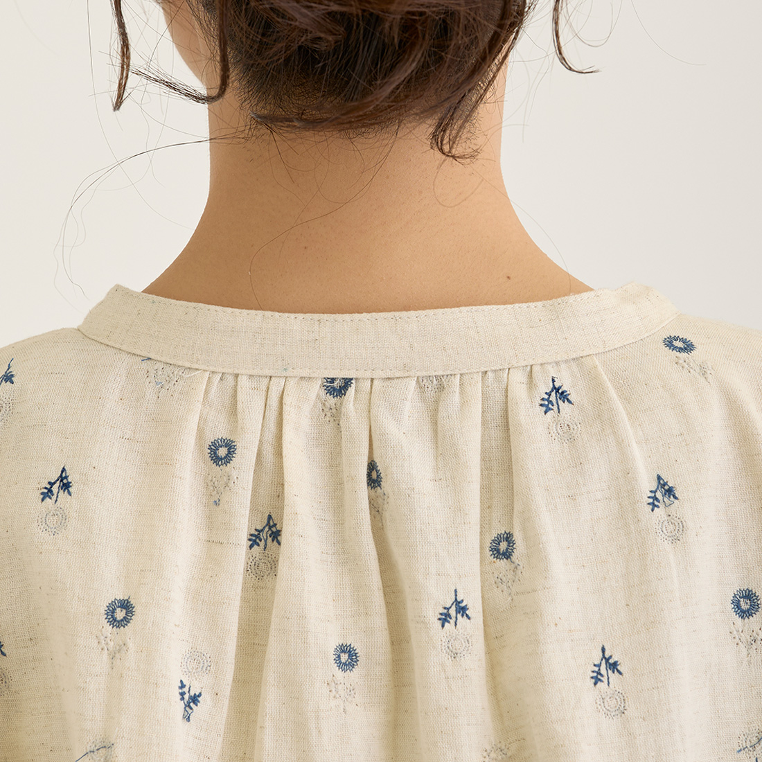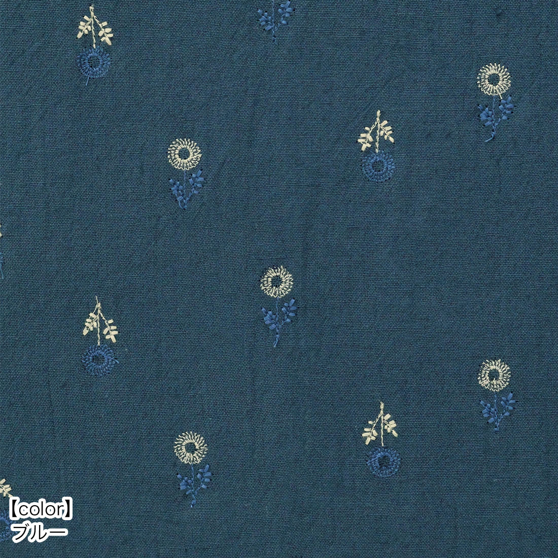 ナチュラルな麻混の生地にシンプルな花柄刺繍。ブルー系のカラーが合わせやすく、夏まで使える大人可愛いシリーズです。