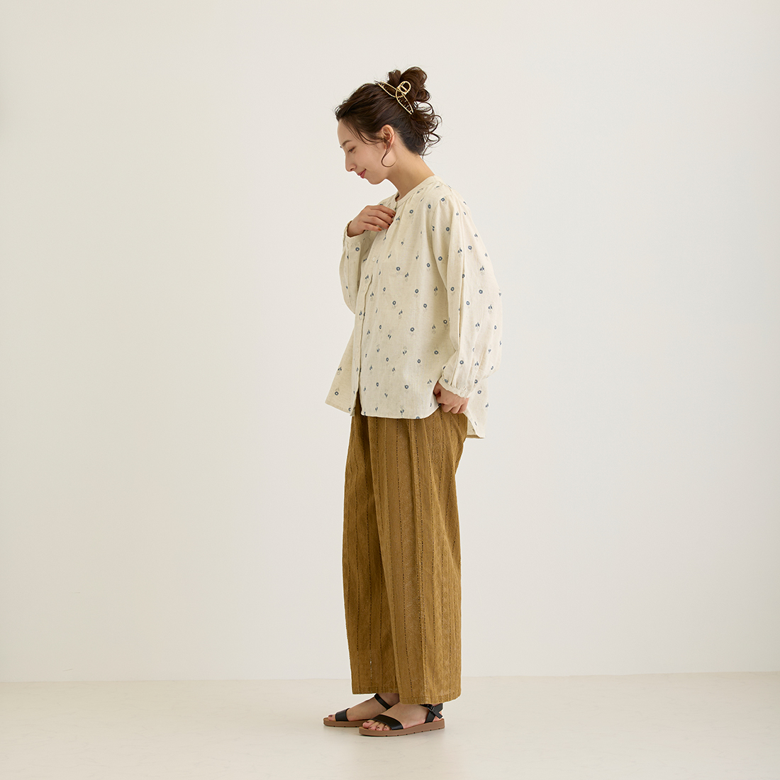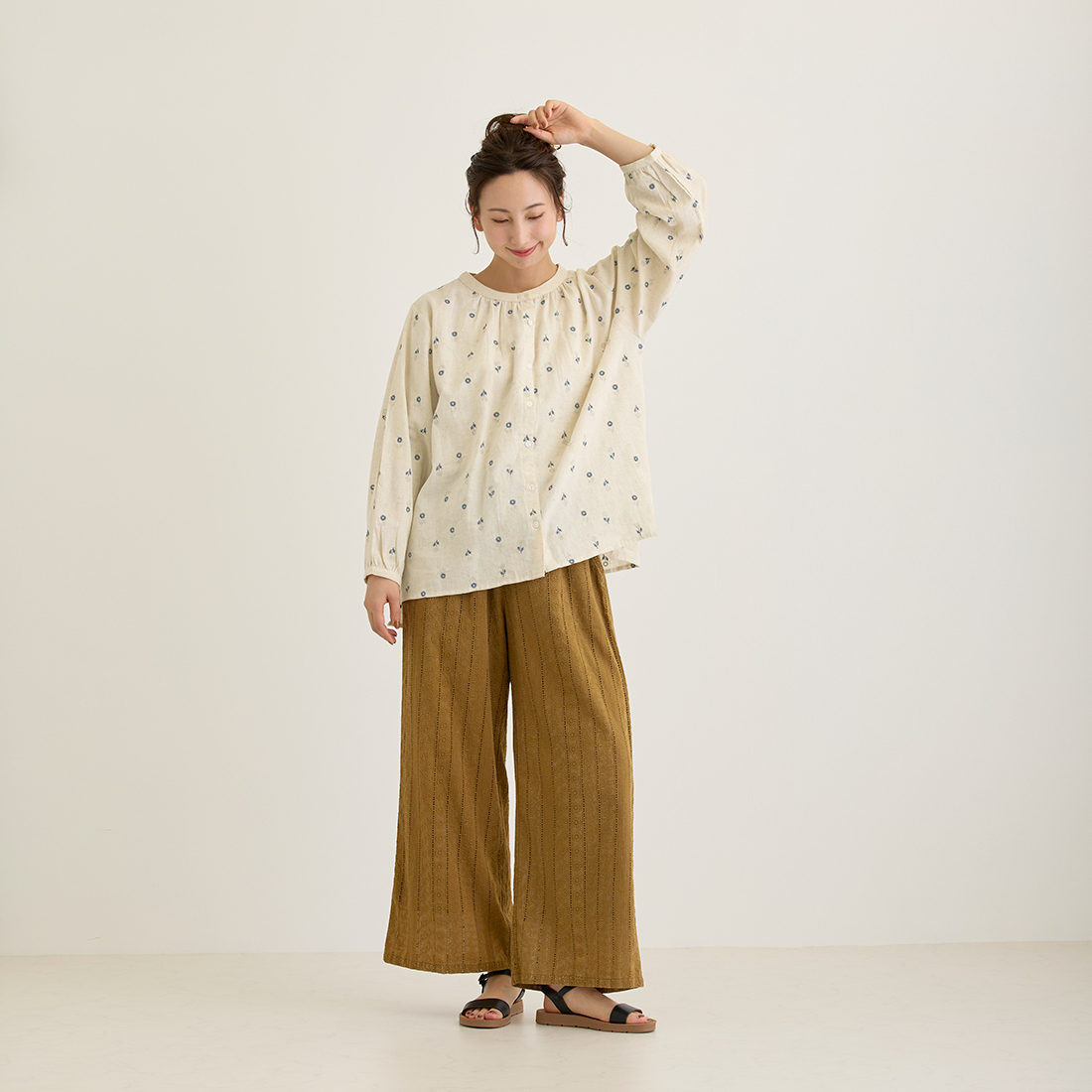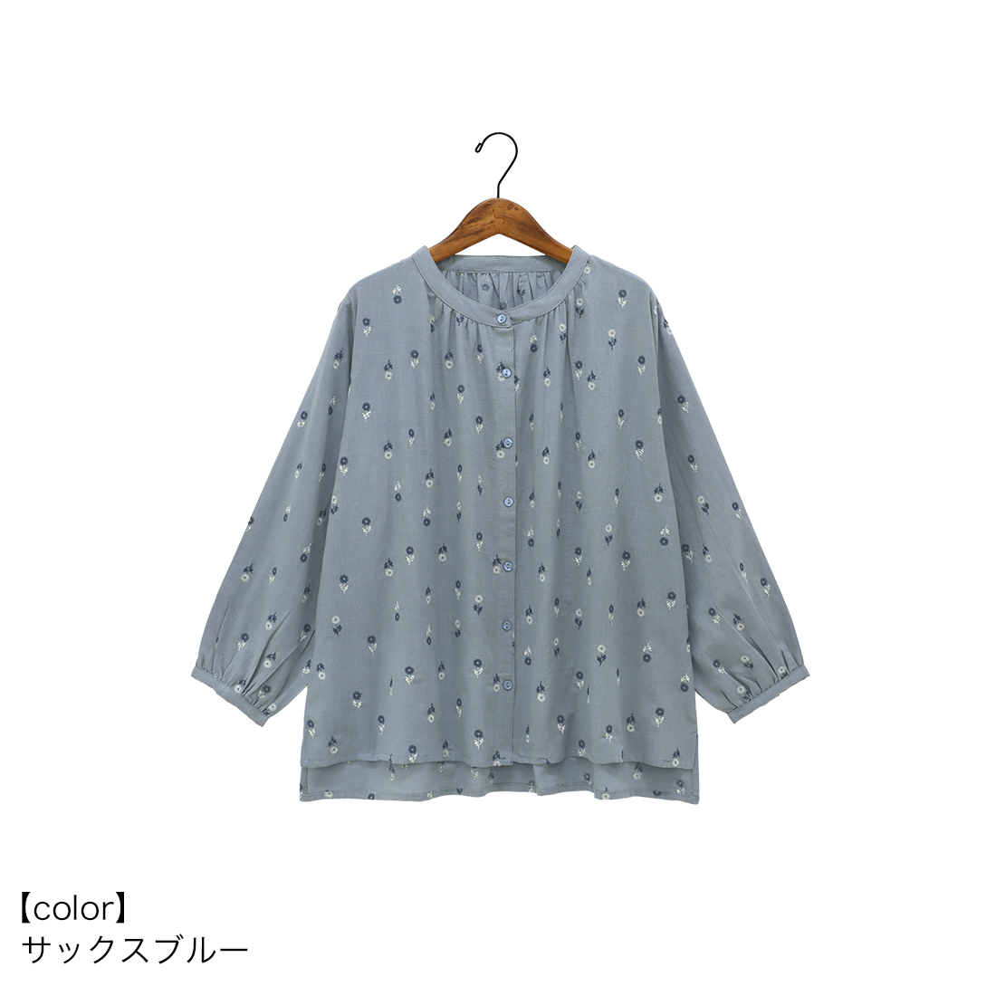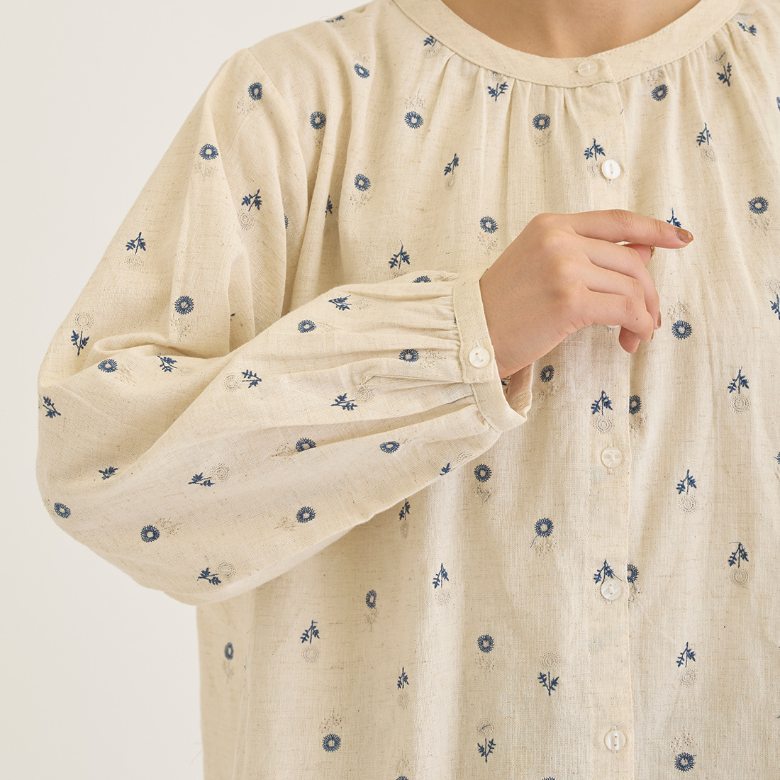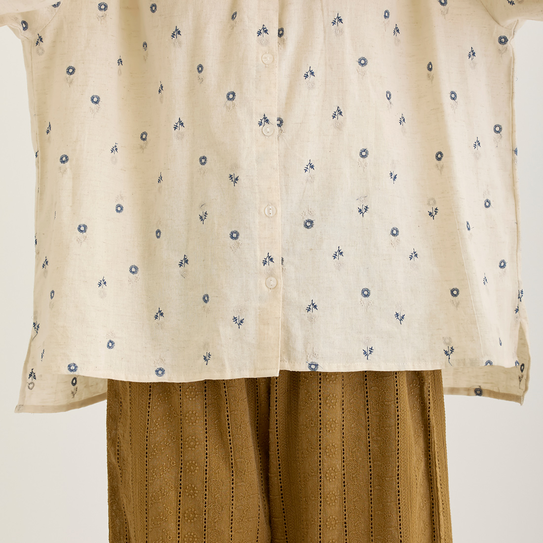 ナチュラルな麻混の生地にシンプルな花柄刺繍。ブルー系のカラーが合わせやすく、夏まで使える大人可愛いシリーズです。