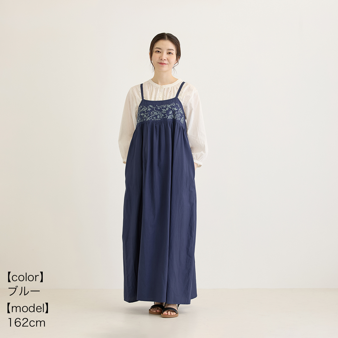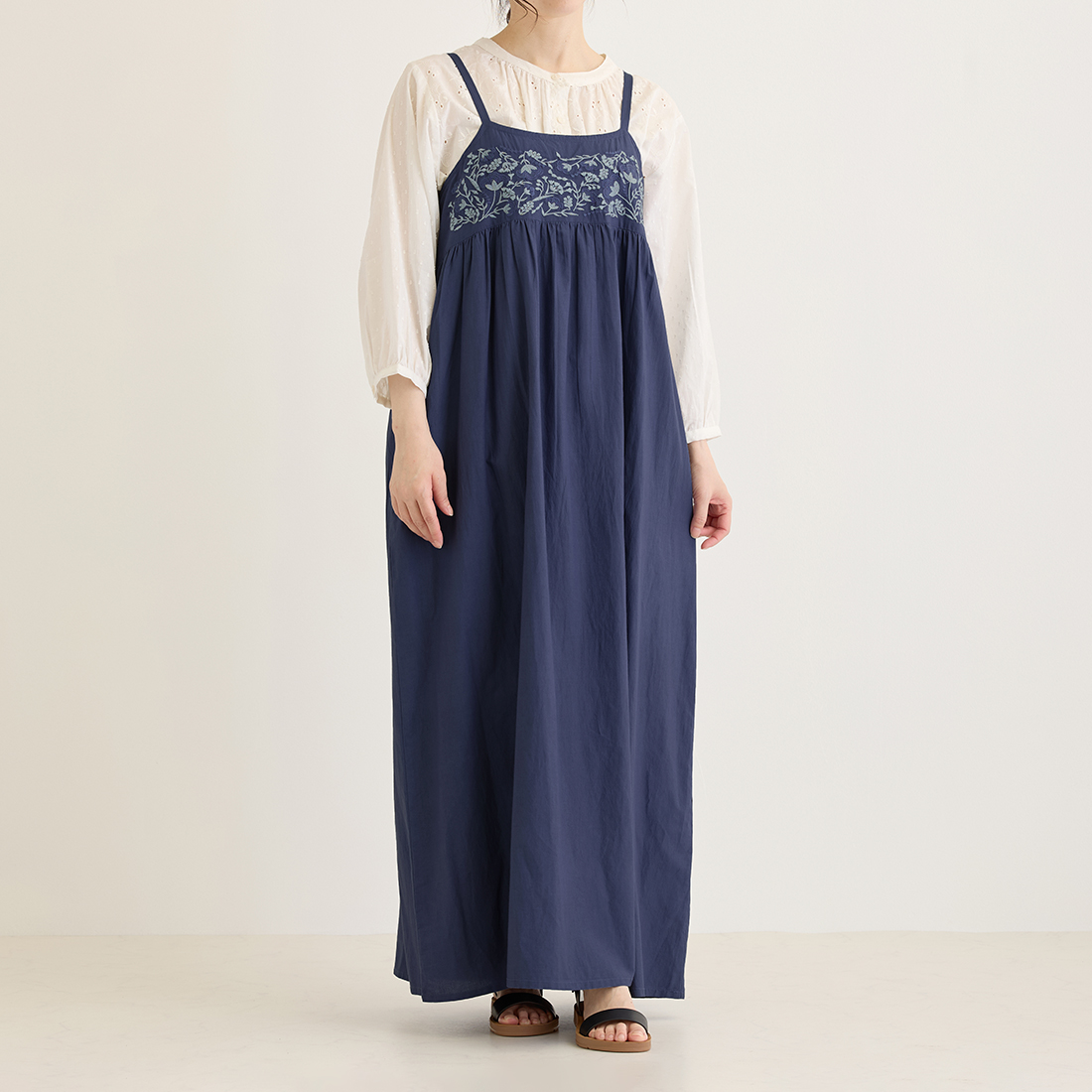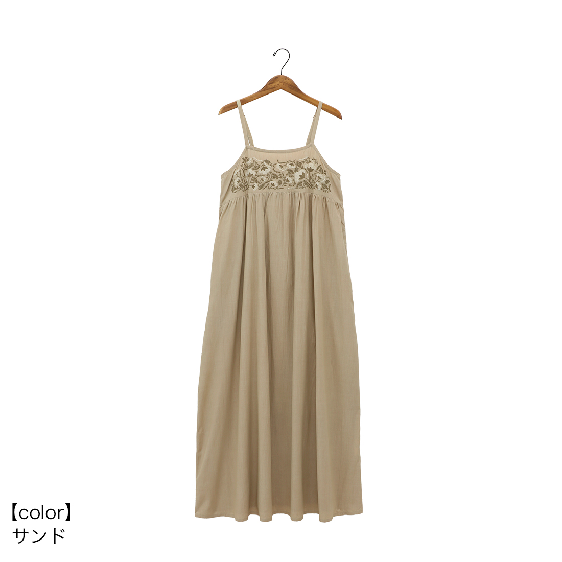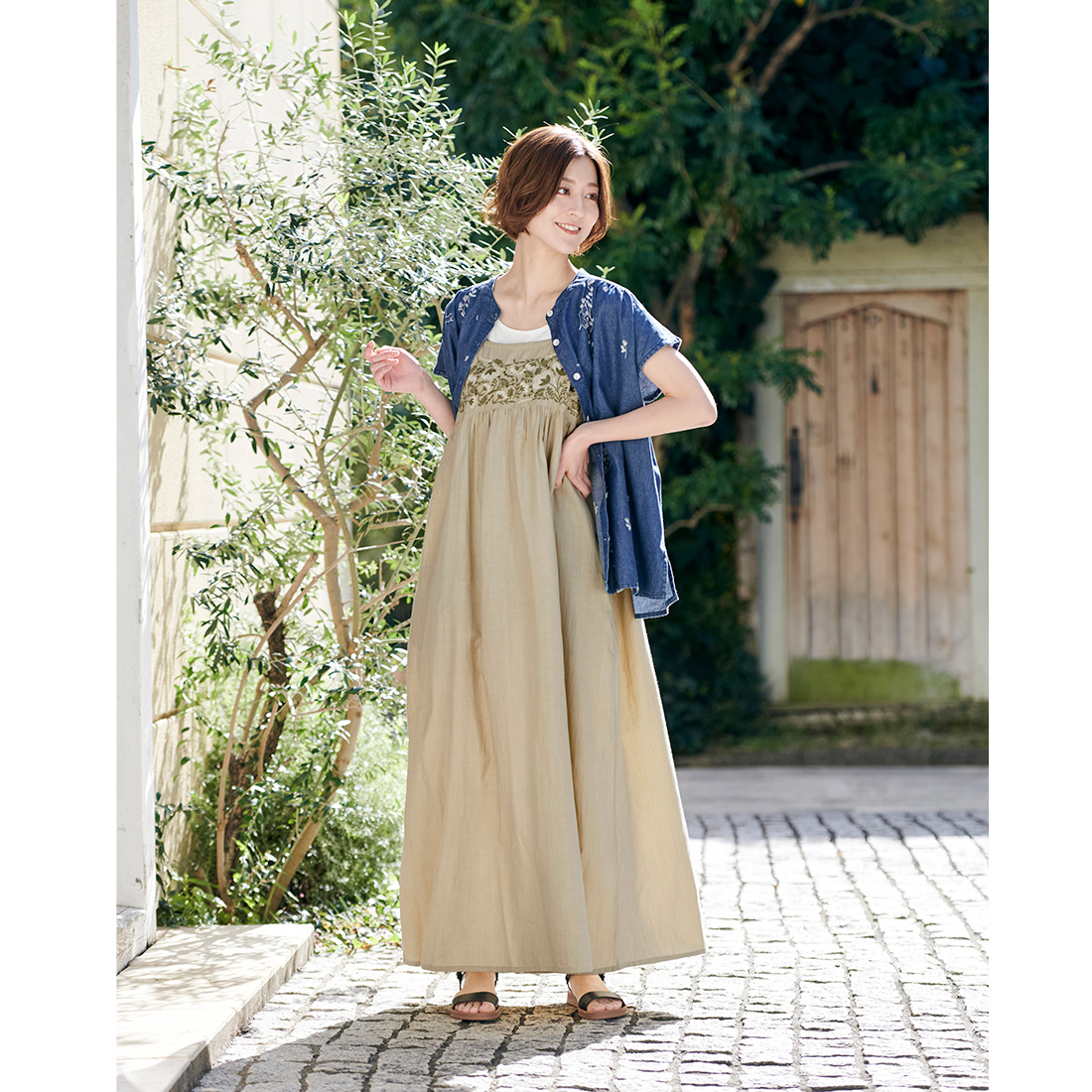 キャミワンピースはシンプルなデザインの胸元に入った刺繍がポイント。これ一枚でさっぱりと着られます。