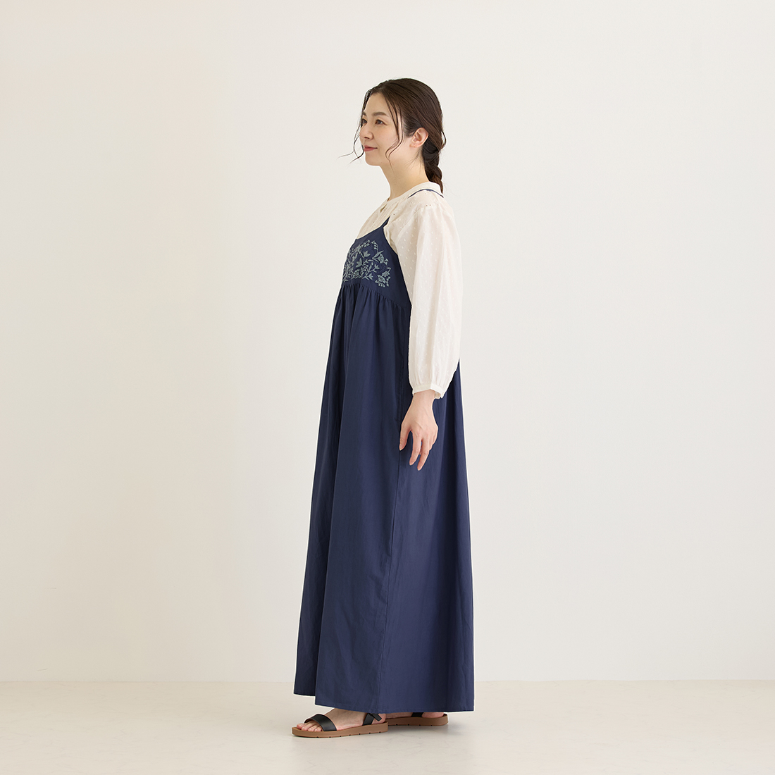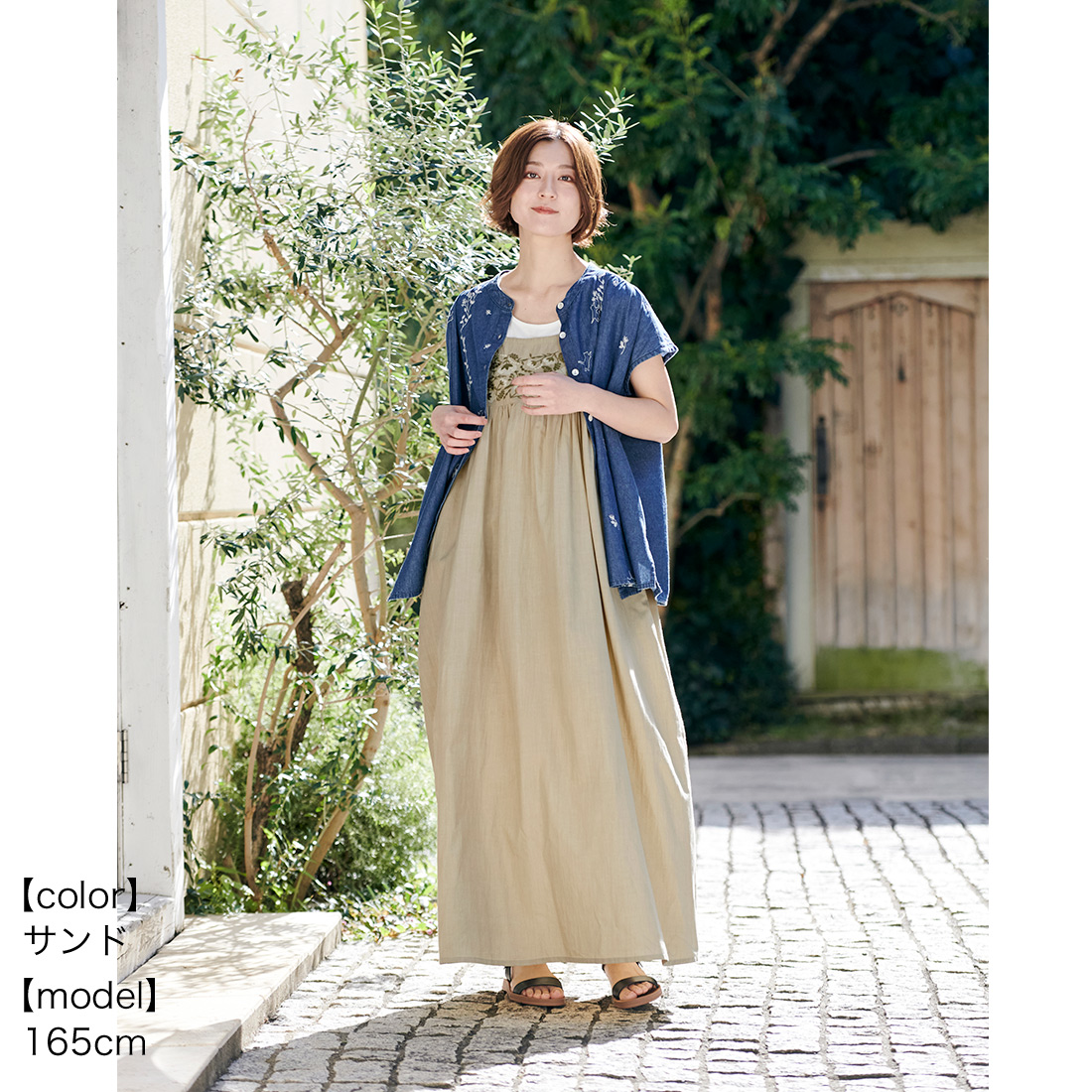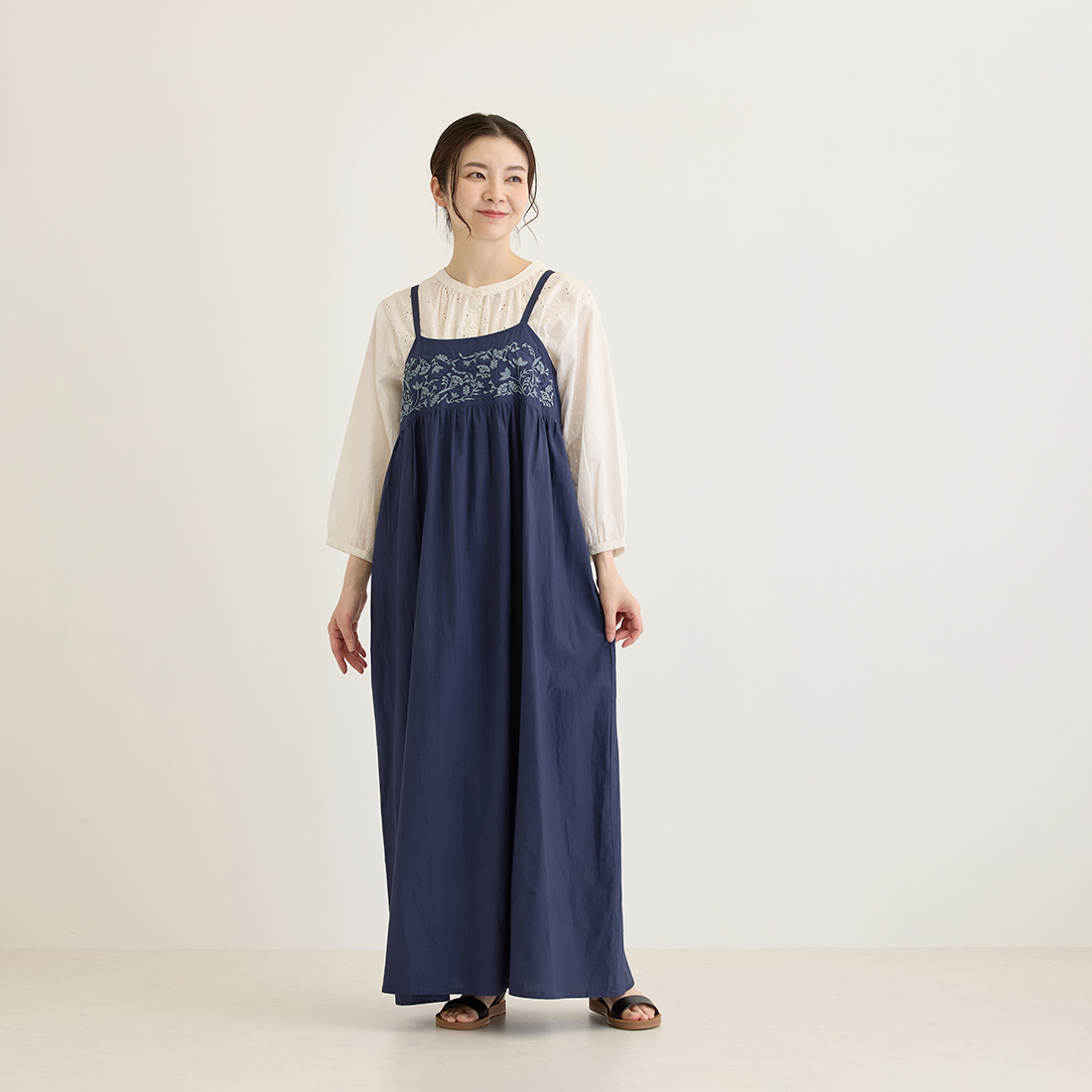 キャミワンピースはシンプルなデザインの胸元に入った刺繍がポイント。これ一枚でさっぱりと着られます。