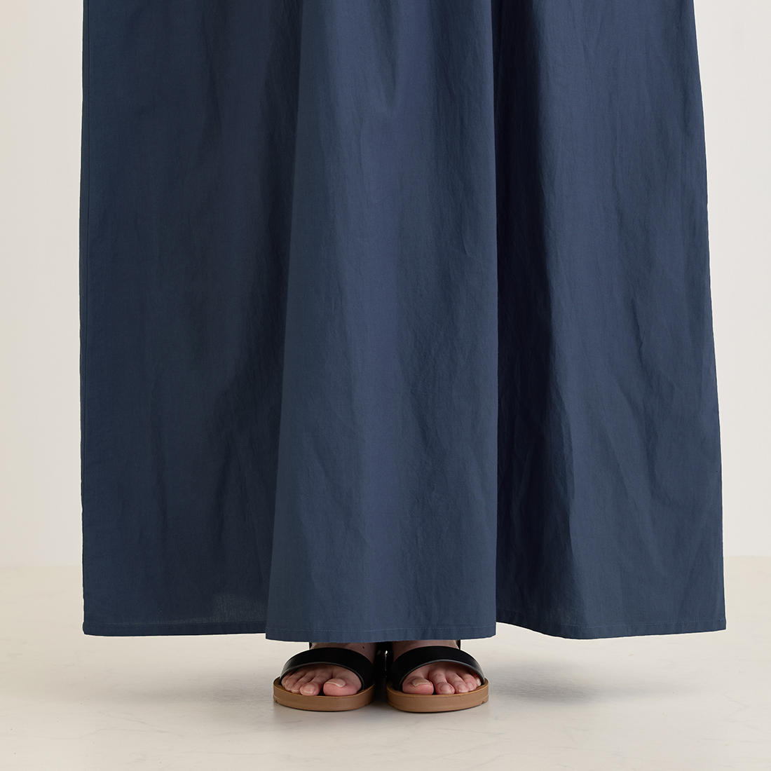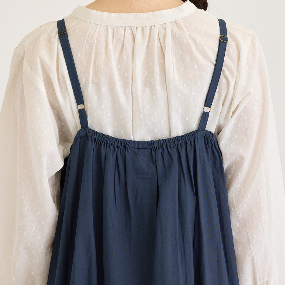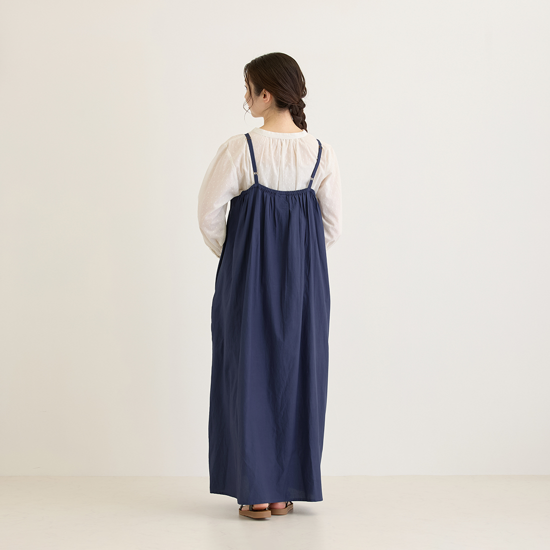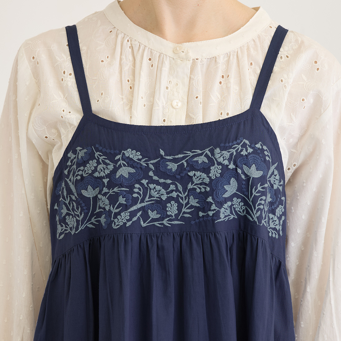 キャミワンピースはシンプルなデザインの胸元に入った刺繍がポイント。これ一枚でさっぱりと着られます。