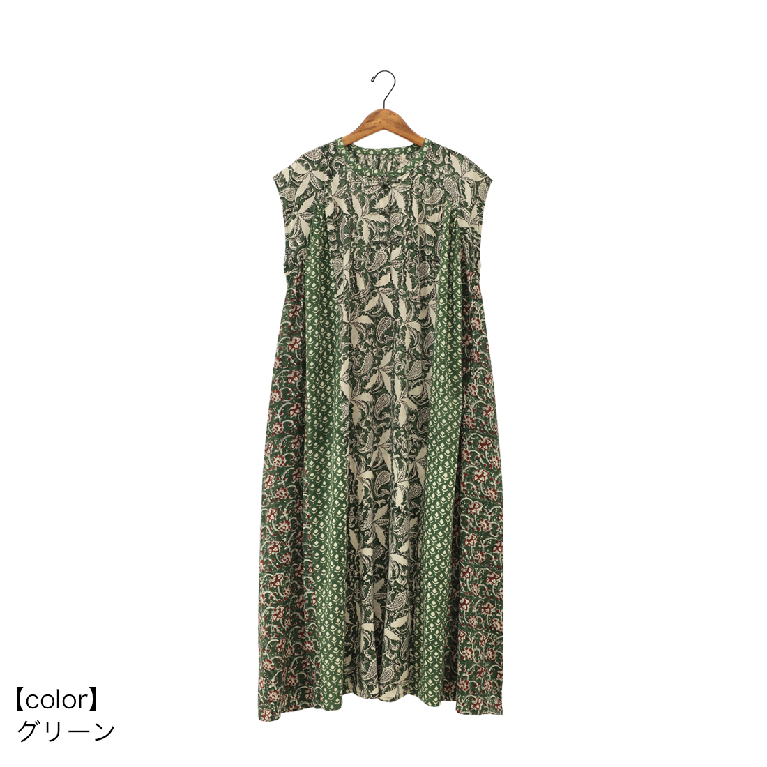多色柄の組み合わせがゴージャスなフレンチワンピースにグリーンカラーが登場!チャイナボタンがおしゃれな組み合わせです。