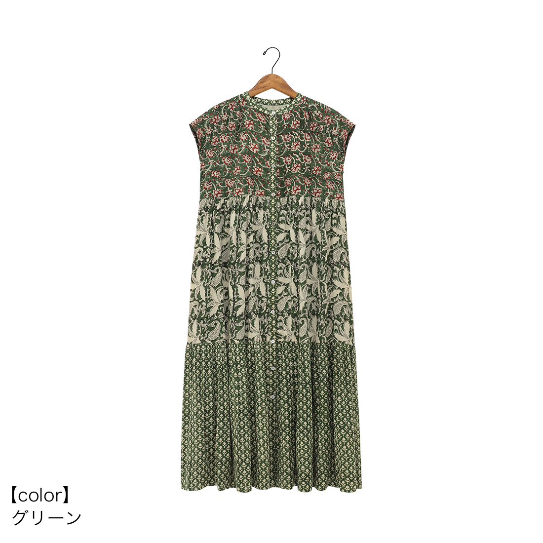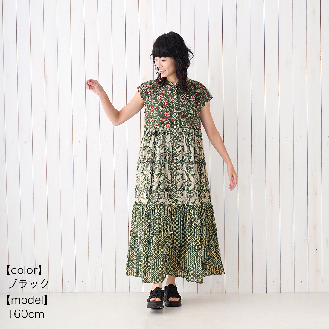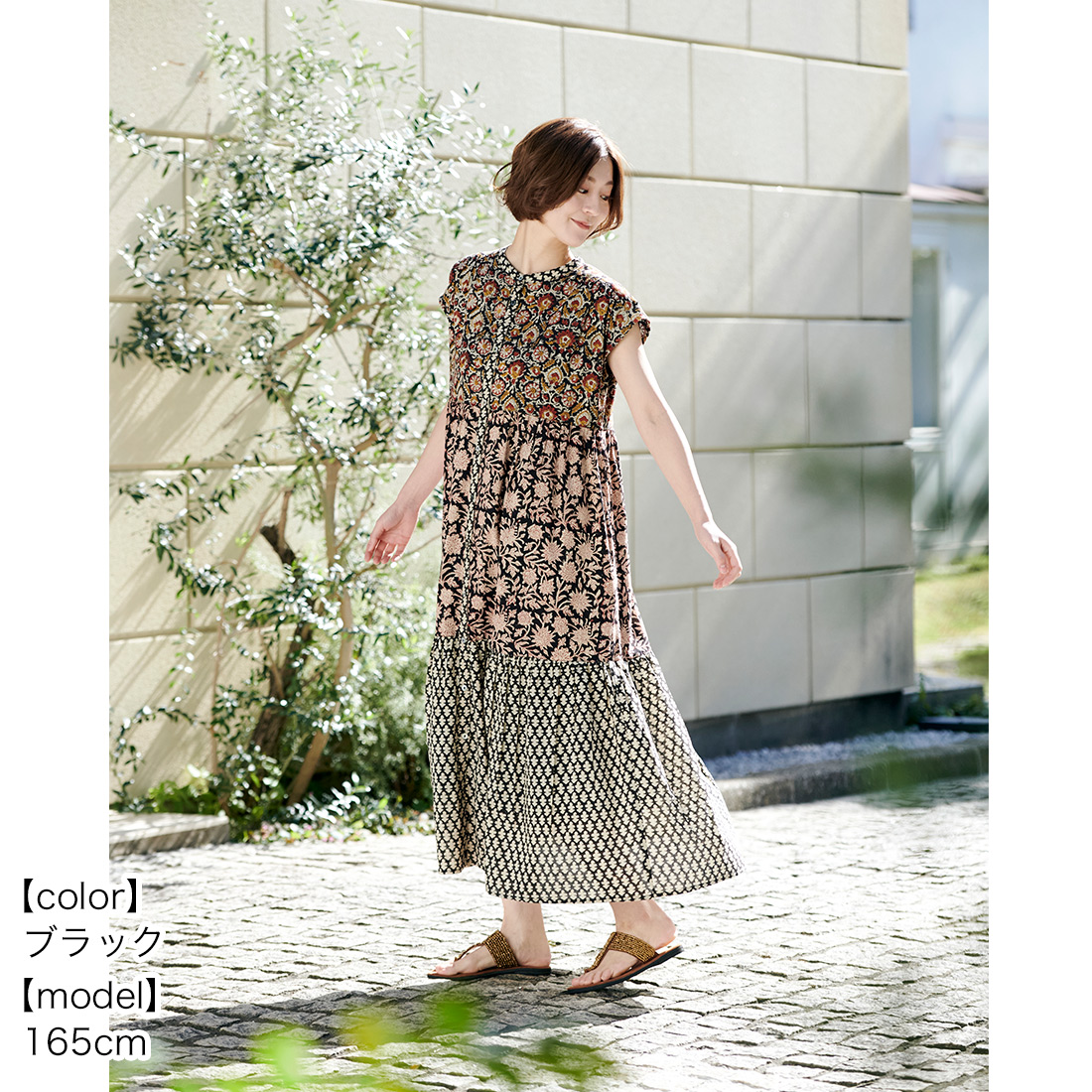 3つのモチーフが切り替えとともにきれいに映えるティアードワンピースです。ノースリーブで夏でも涼しく着ていただけます。