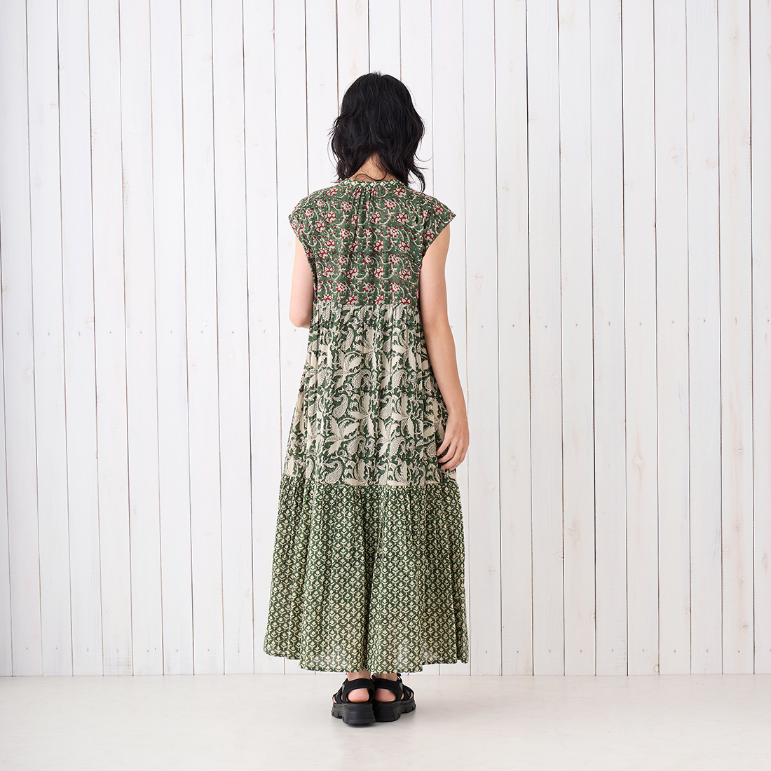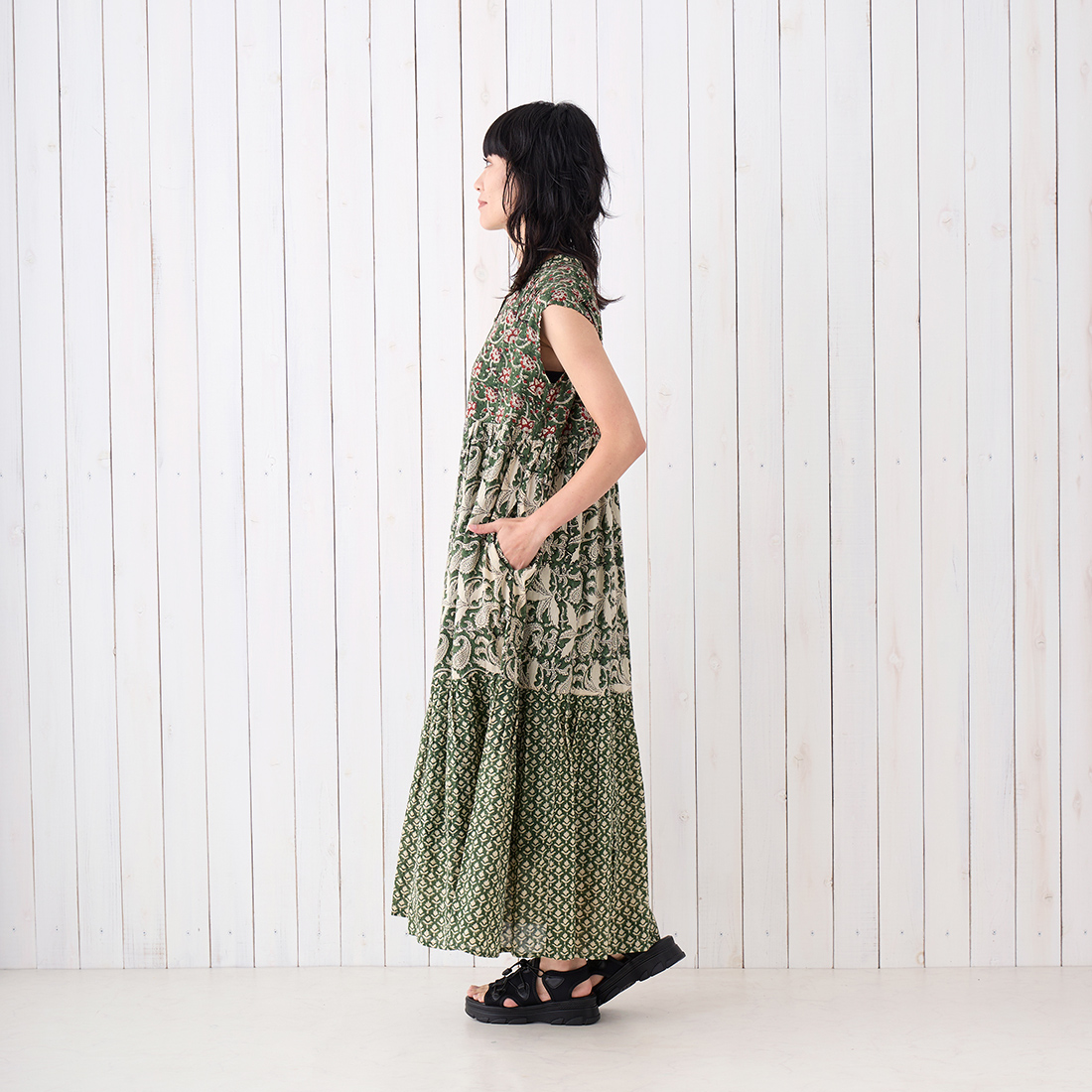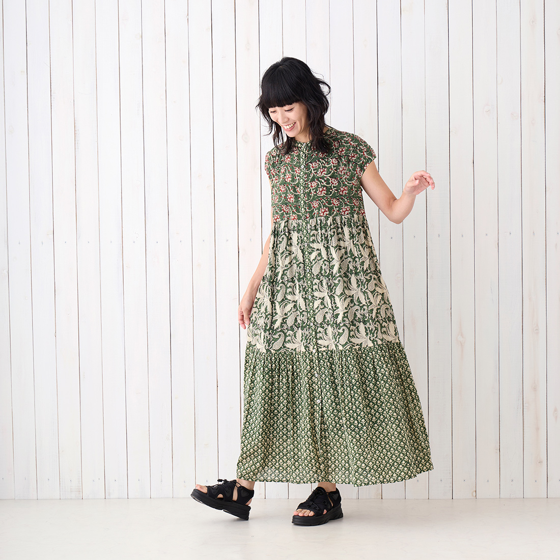 3つのモチーフが切り替えとともにきれいに映えるティアードワンピースです。ノースリーブで夏でも涼しく着ていただけます。