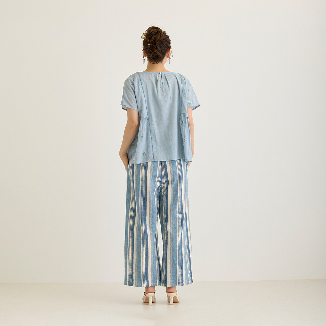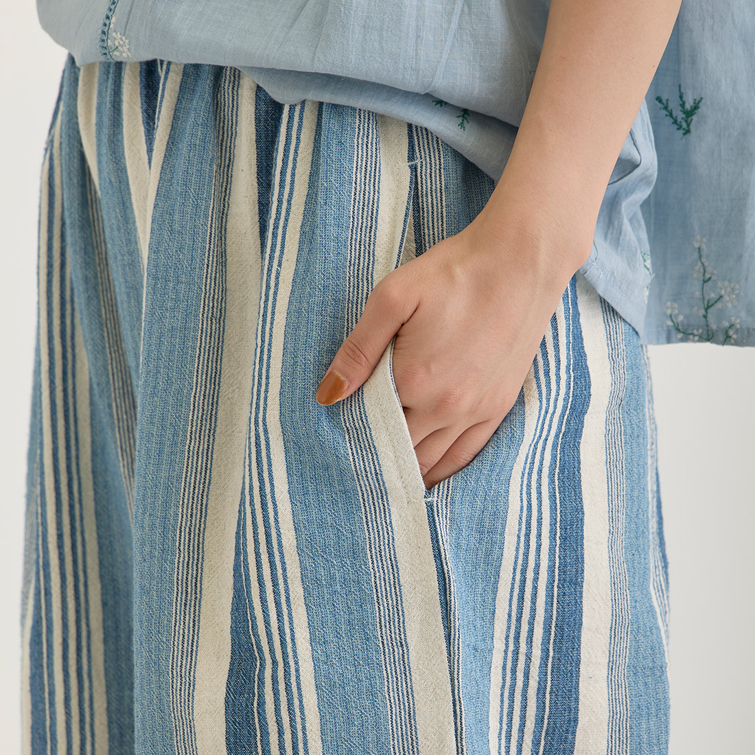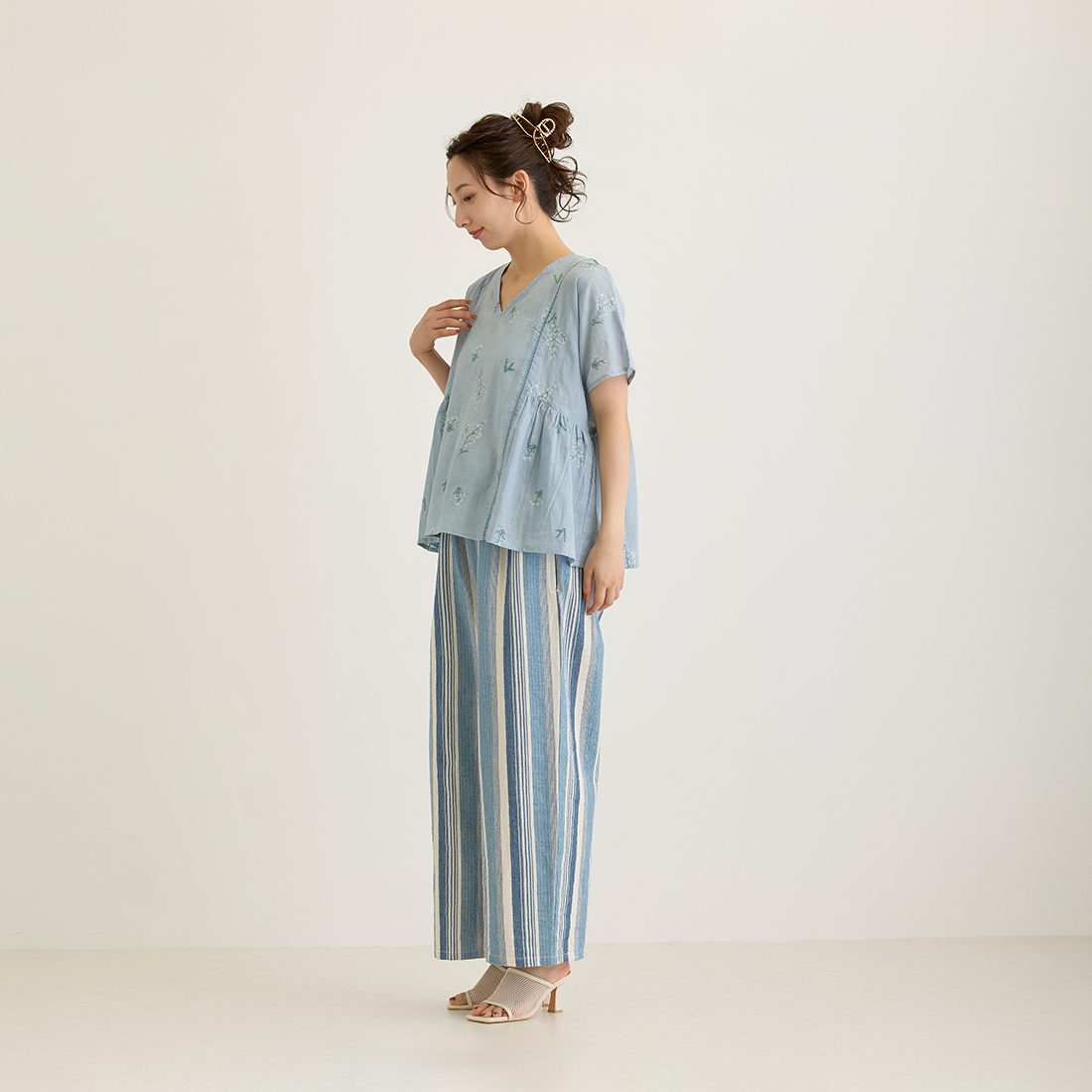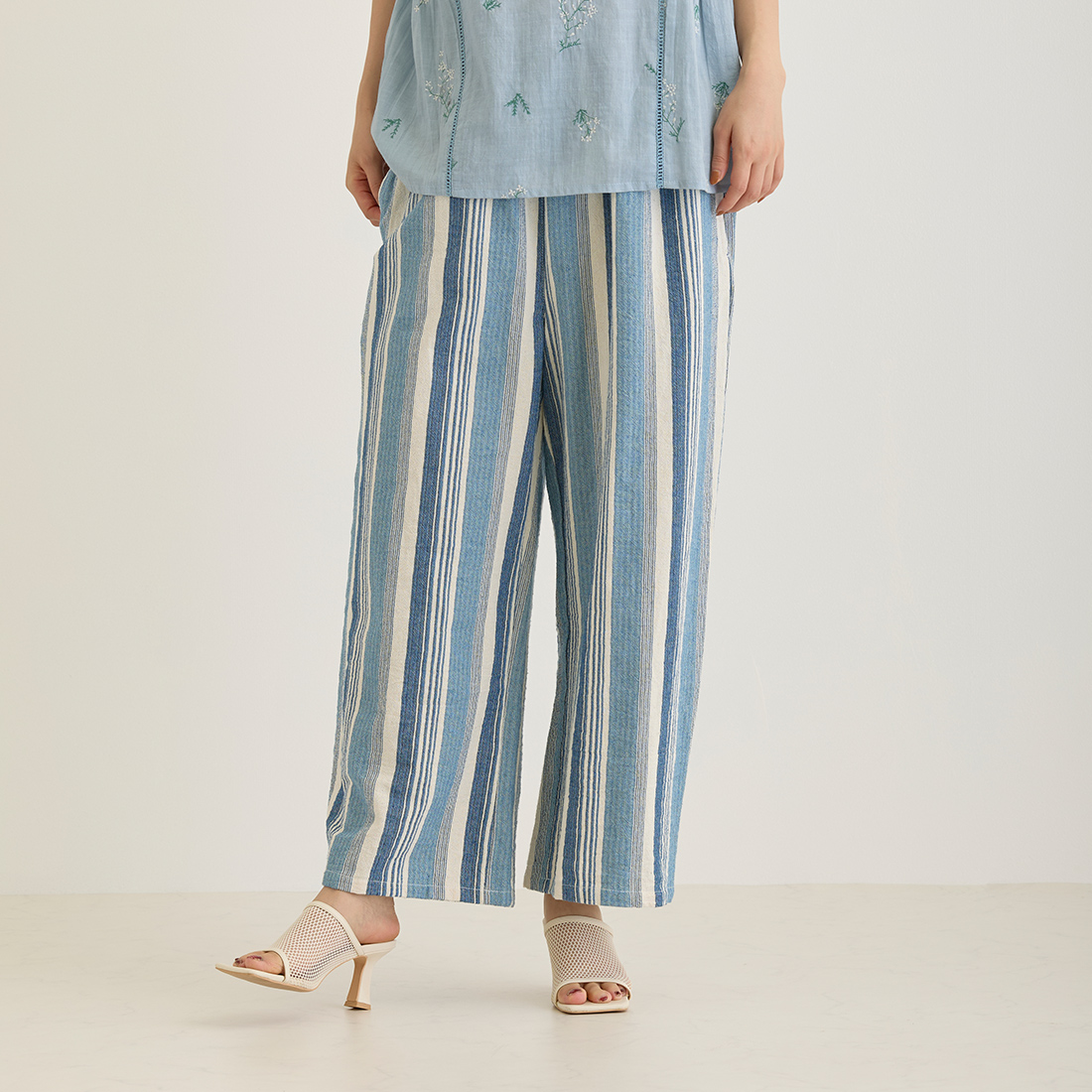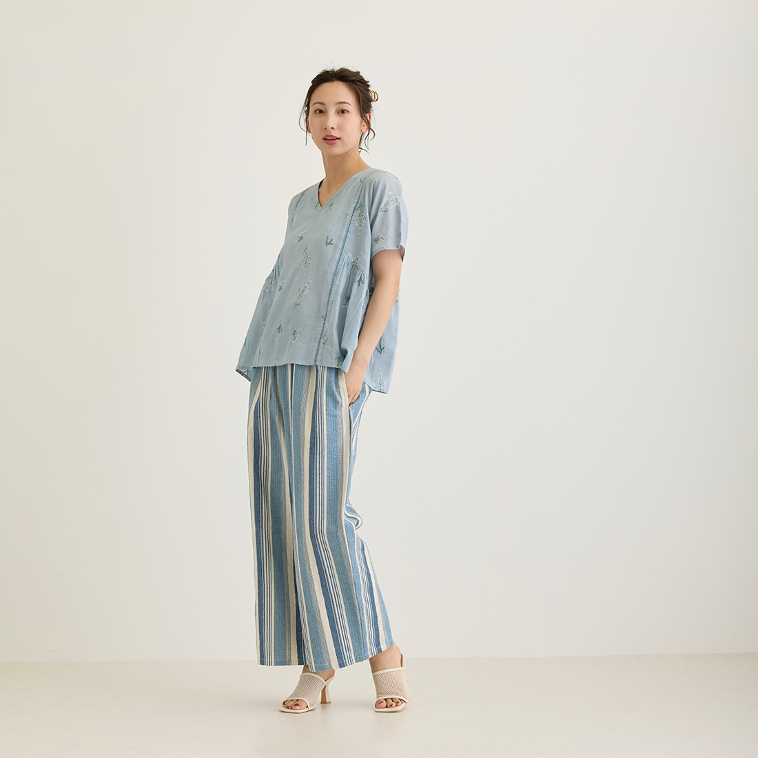 繊細なブルーのストライプを織り込んだ生地を使用し、着心地の良さと温かみを感じられるシリーズです。爽やかなブルーがシンプルなトップスによく映えます。