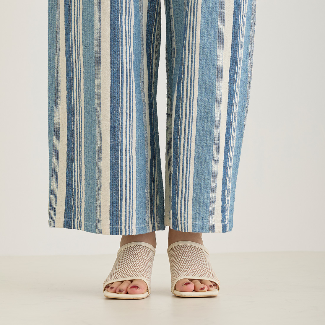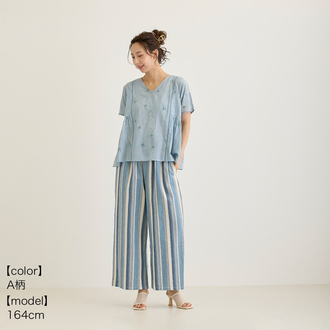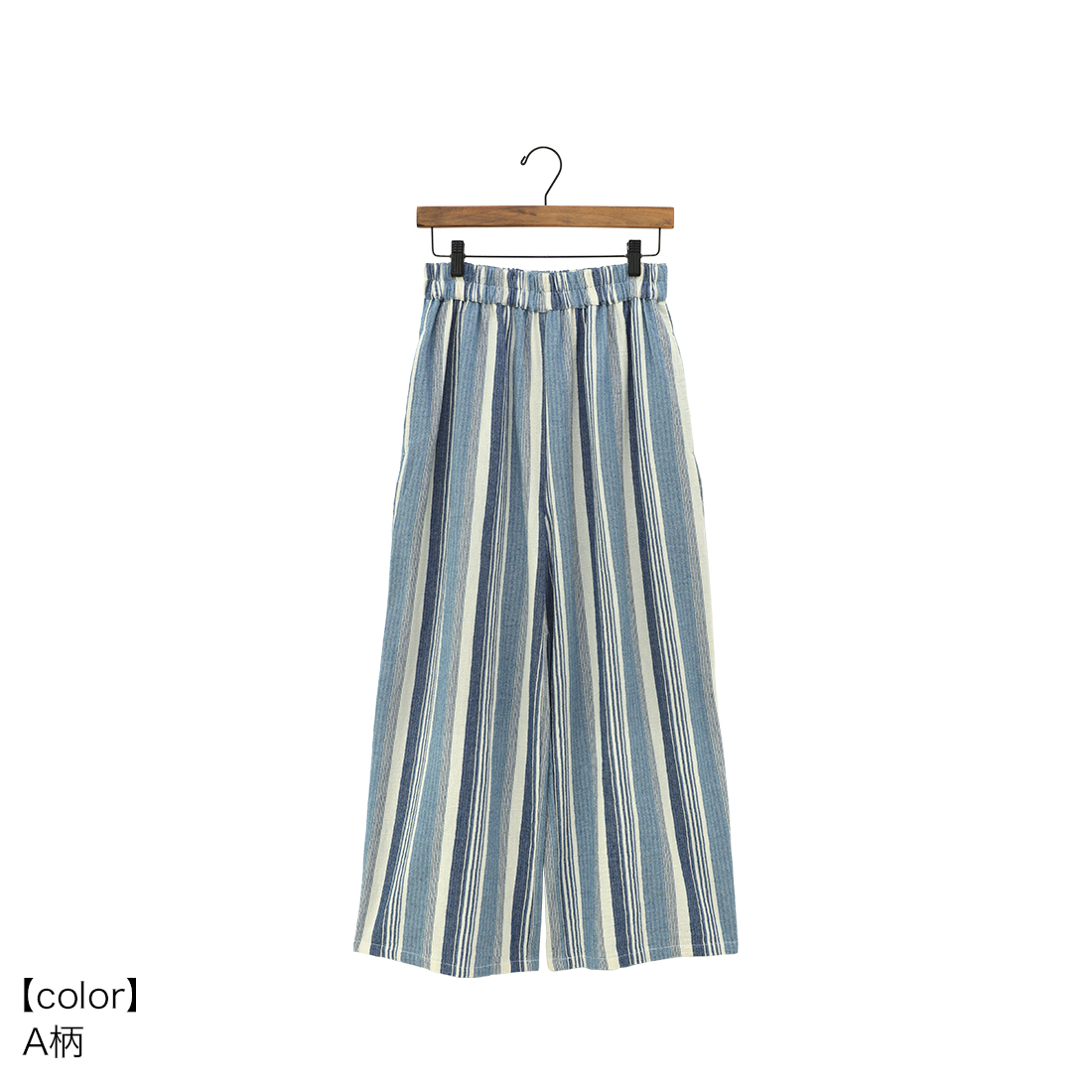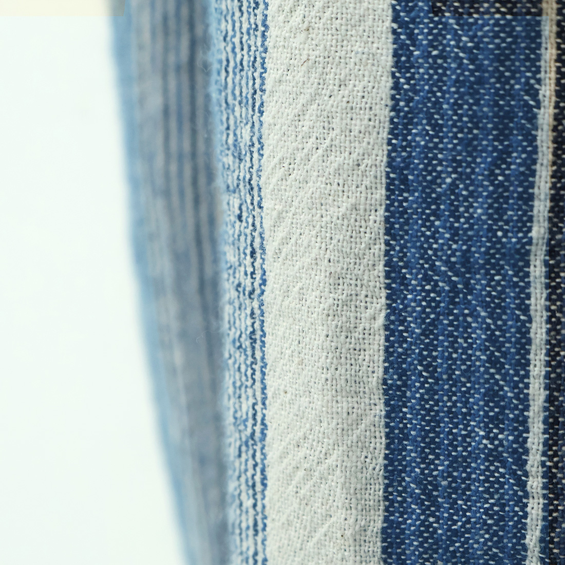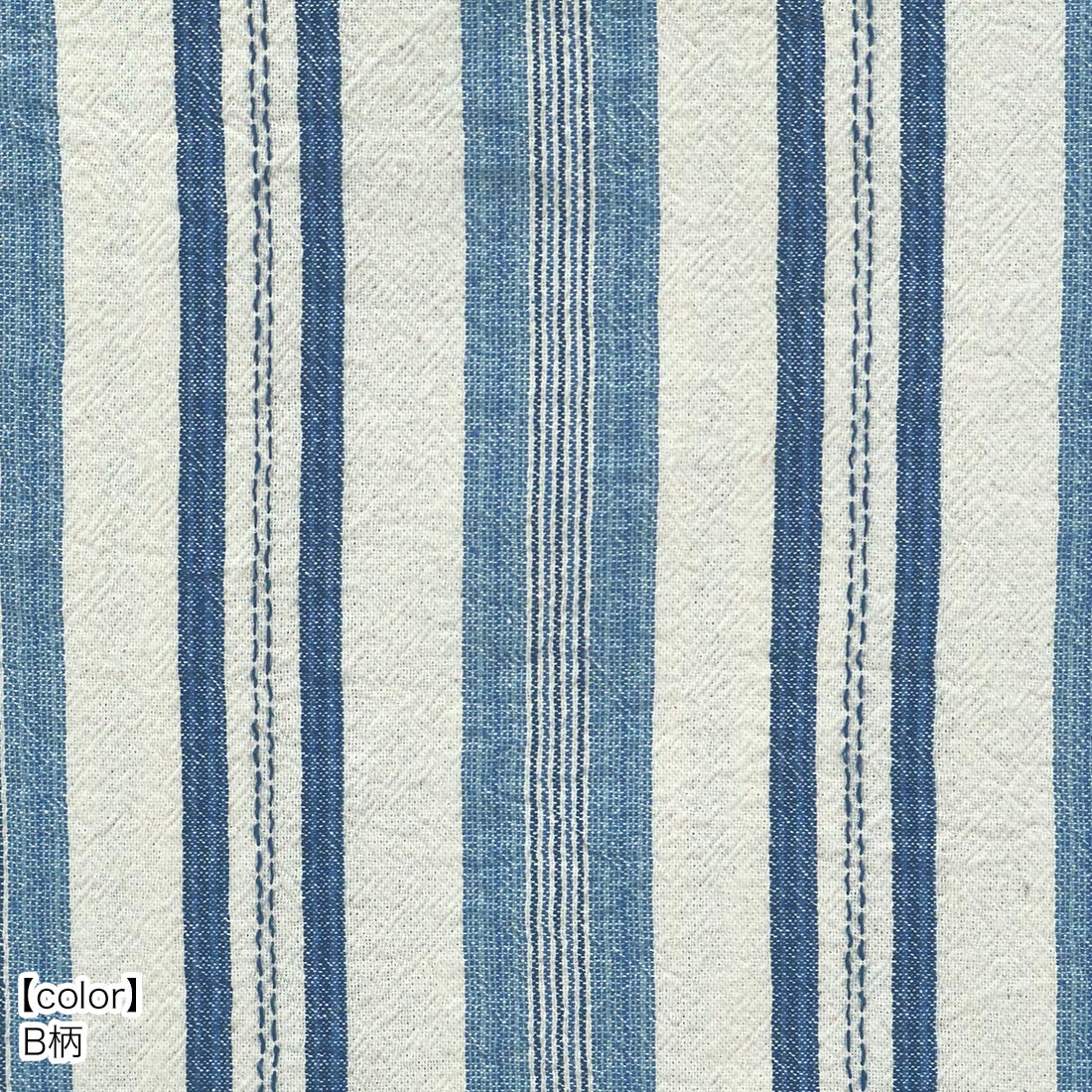 繊細なブルーのストライプを織り込んだ生地を使用し、着心地の良さと温かみを感じられるシリーズです。爽やかなブルーがシンプルなトップスによく映えます。
