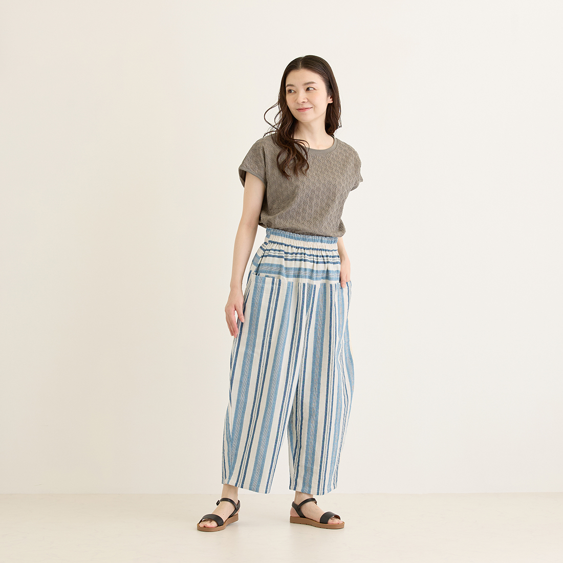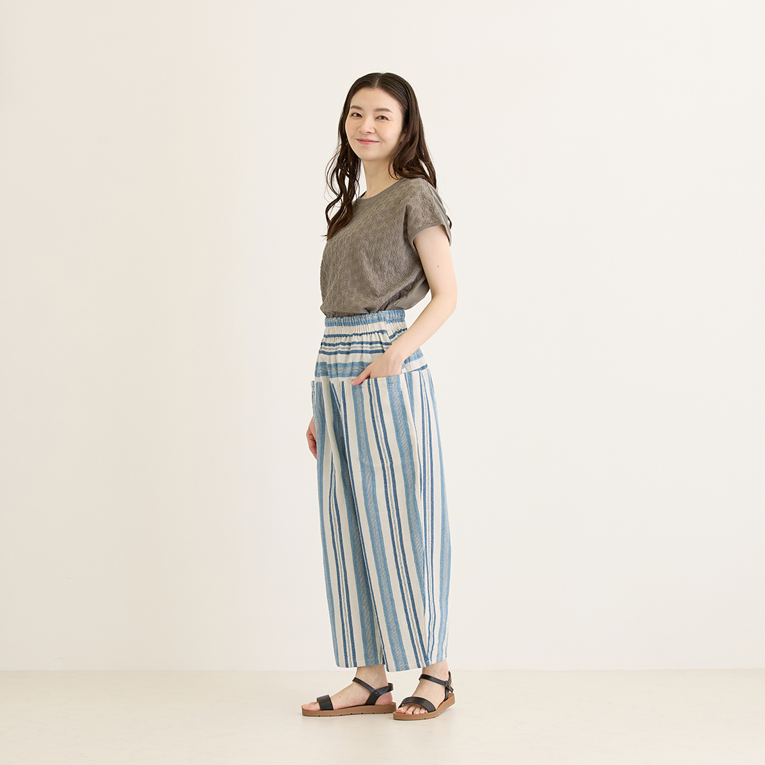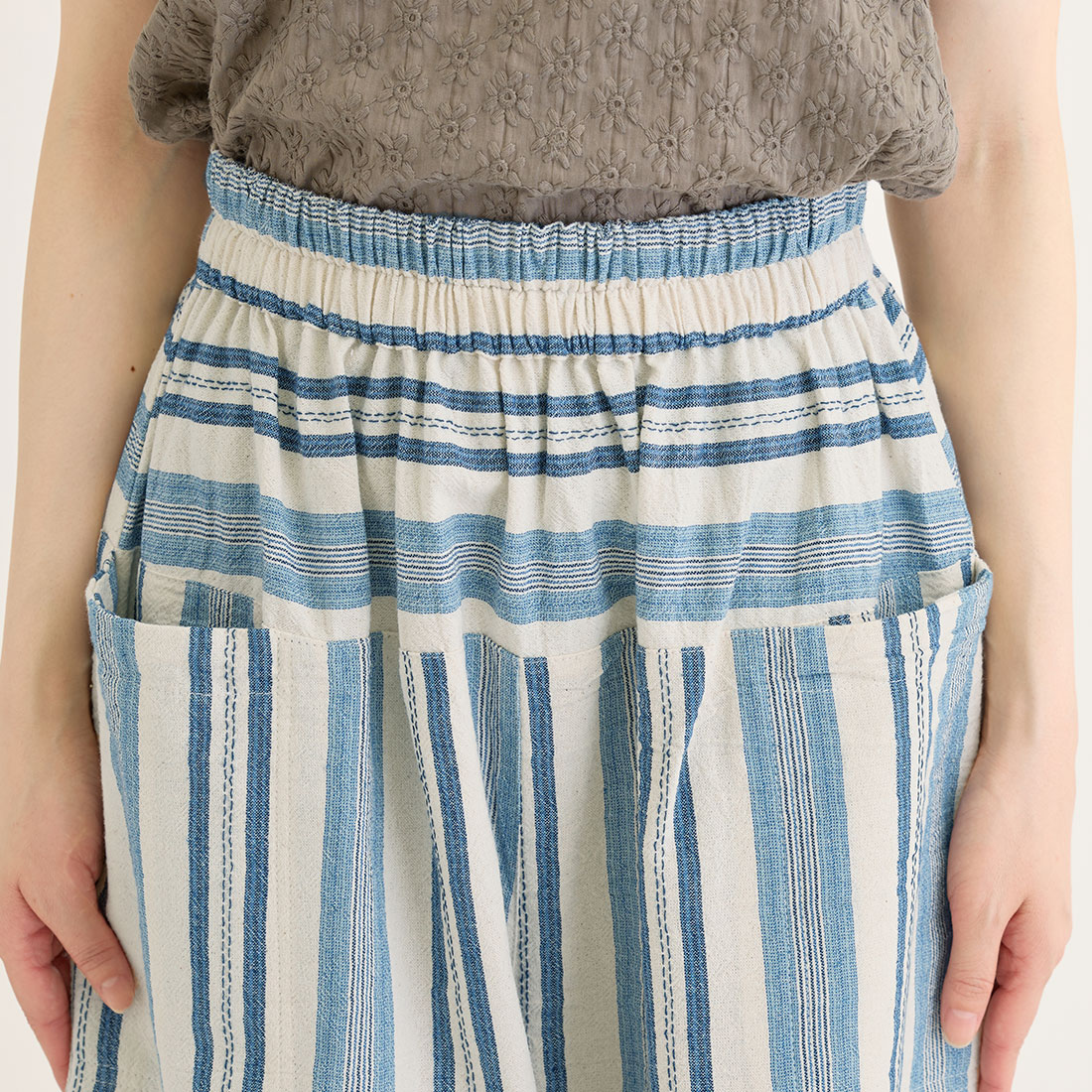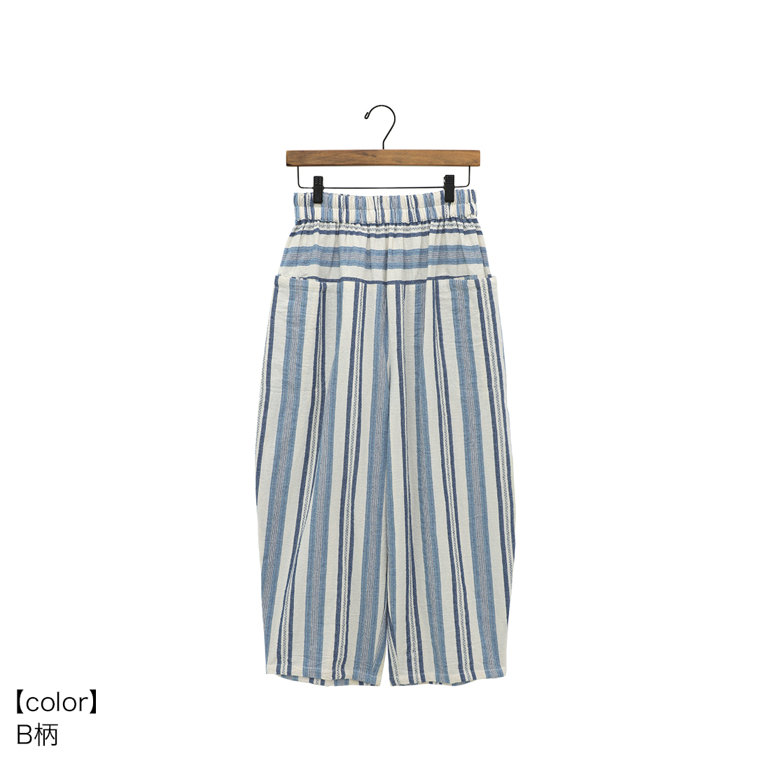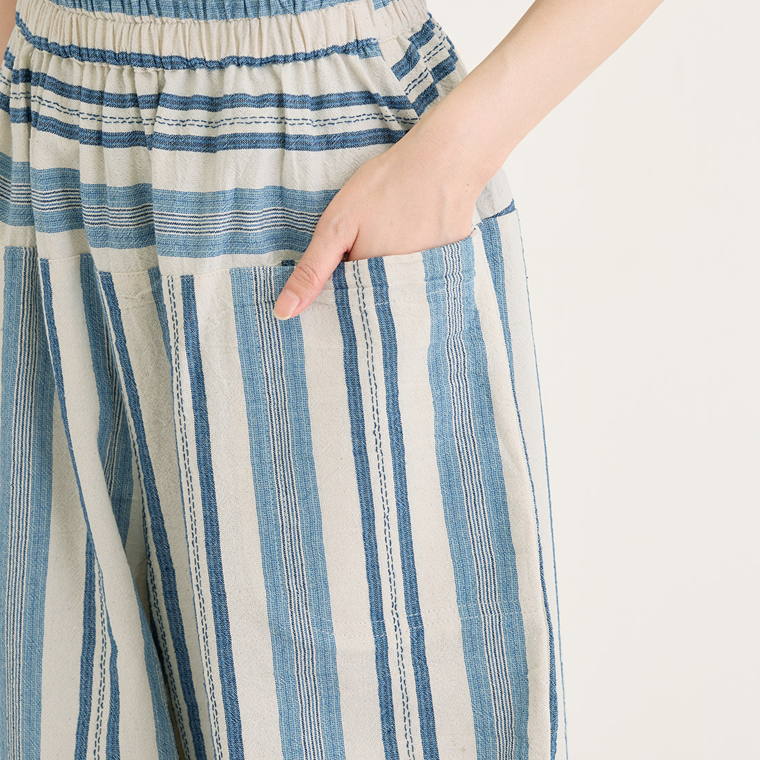 繊細なブルーのストライプを織り込んだ生地を使用し、着心地の良さと温かみを感じられるシリーズです。爽やかなブルーがシンプルなトップスによく映えます。