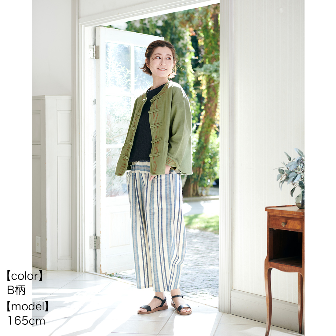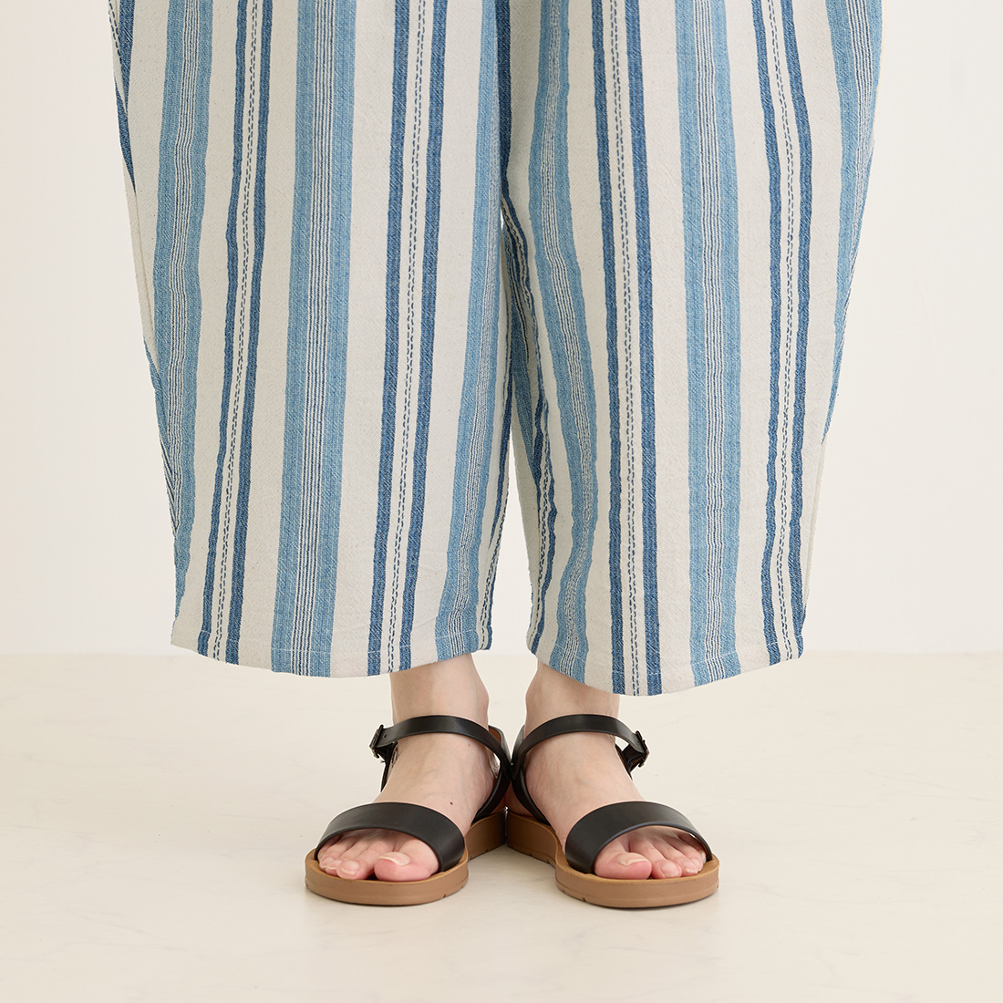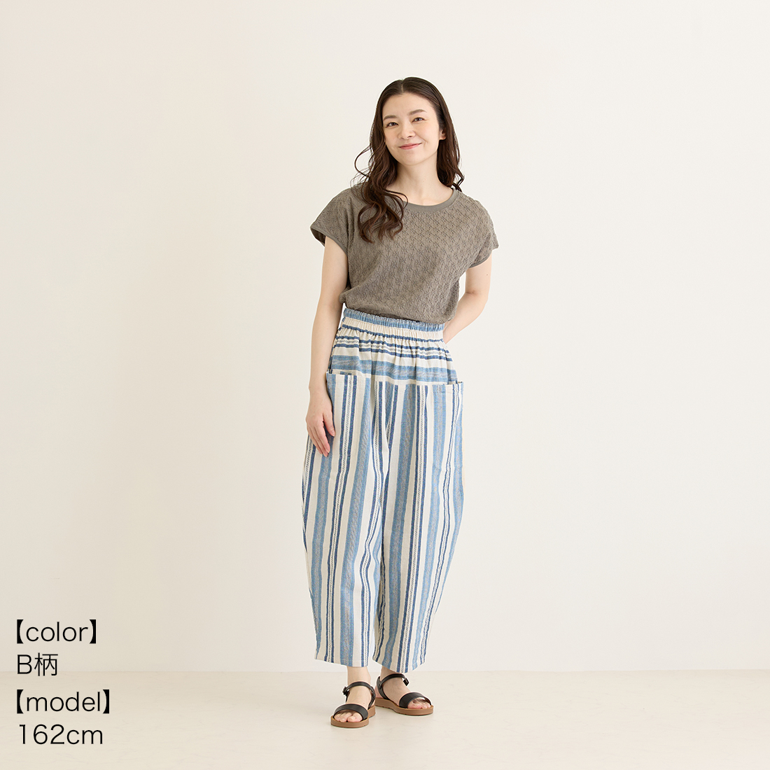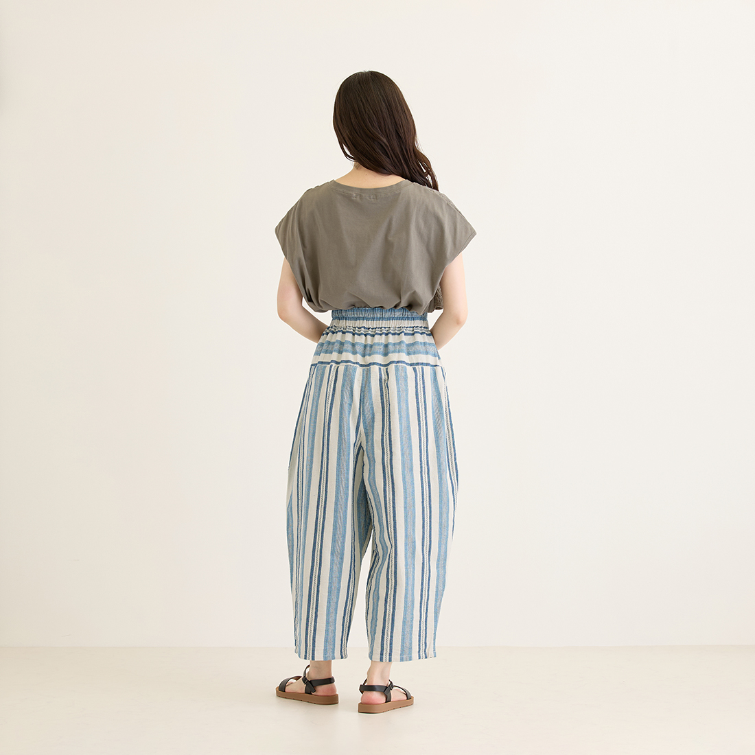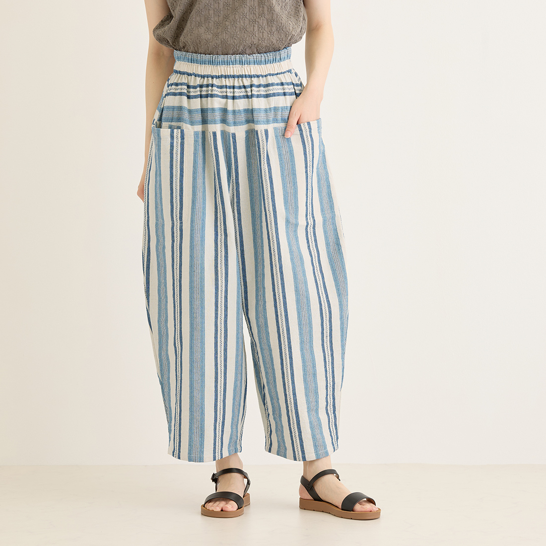 繊細なブルーのストライプを織り込んだ生地を使用し、着心地の良さと温かみを感じられるシリーズです。爽やかなブルーがシンプルなトップスによく映えます。