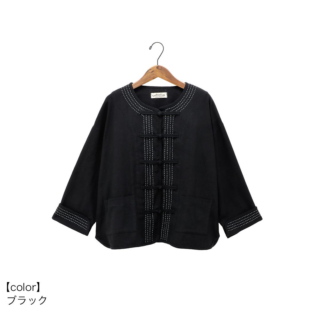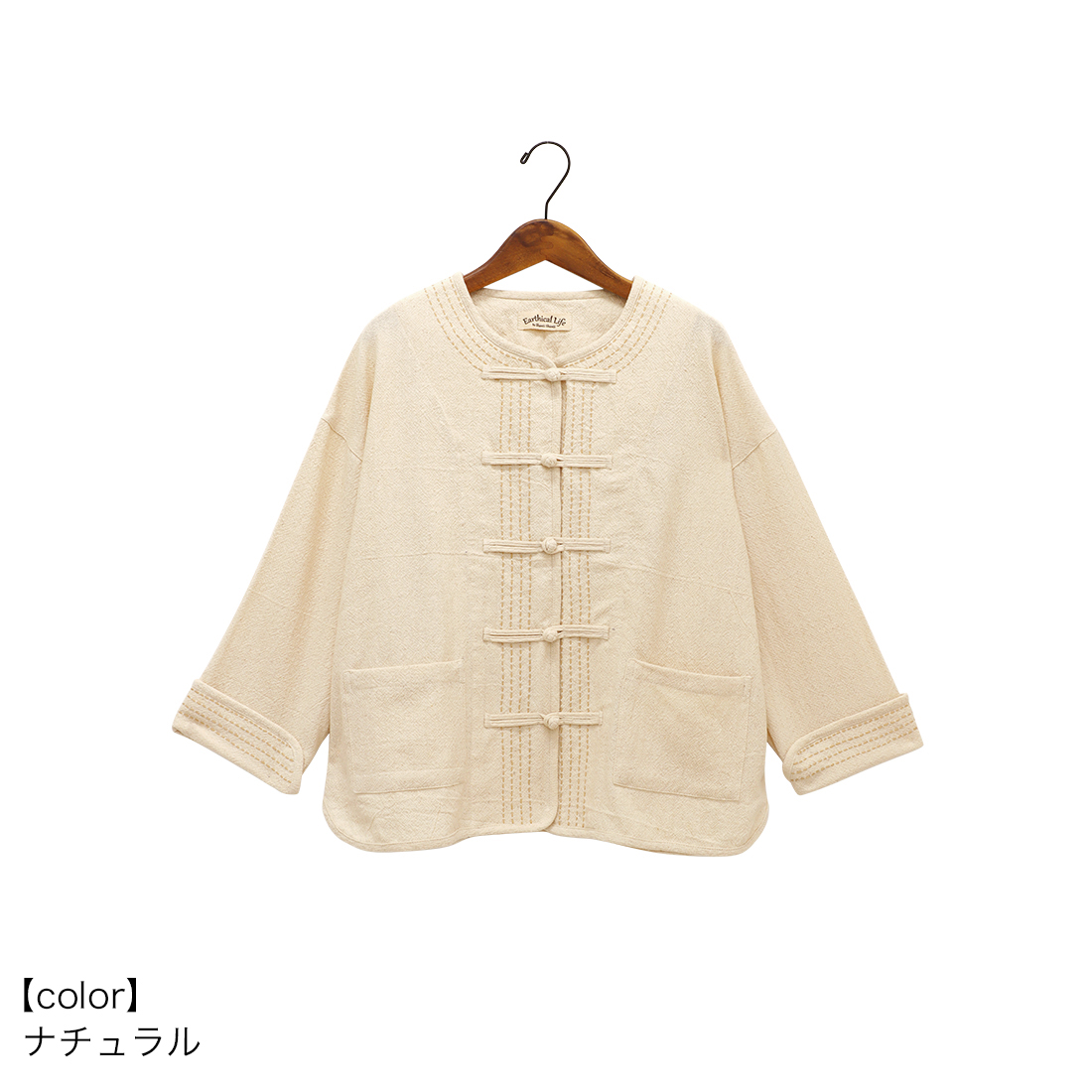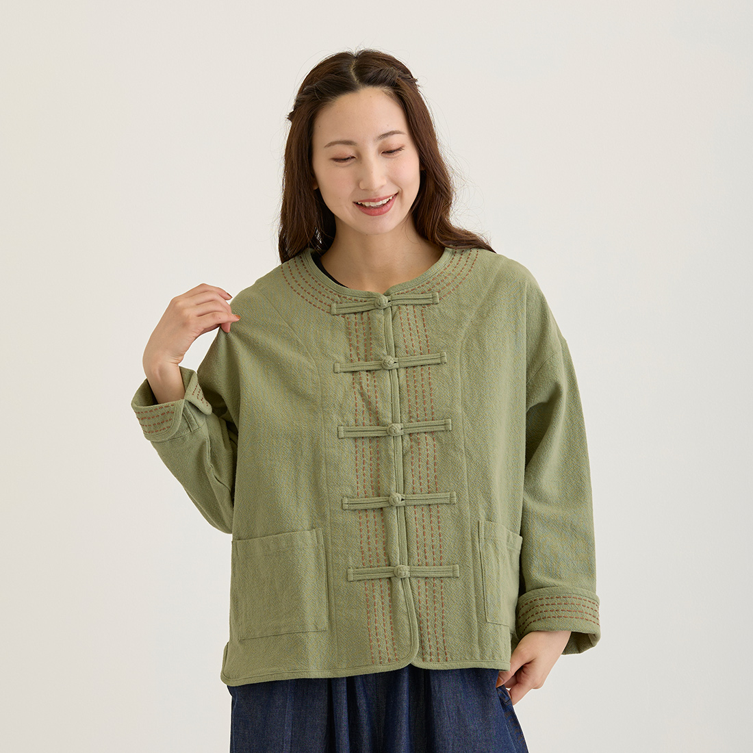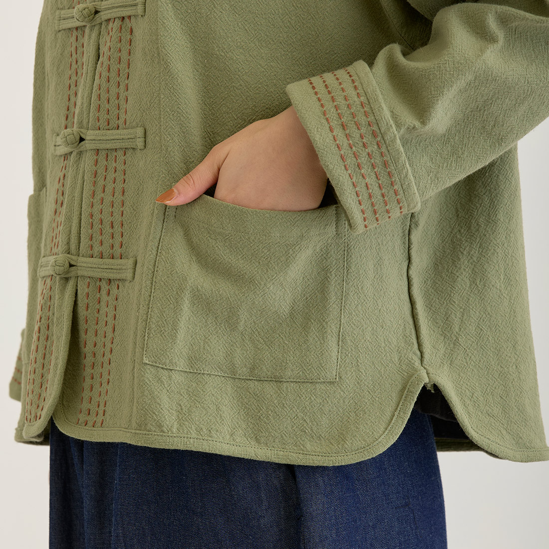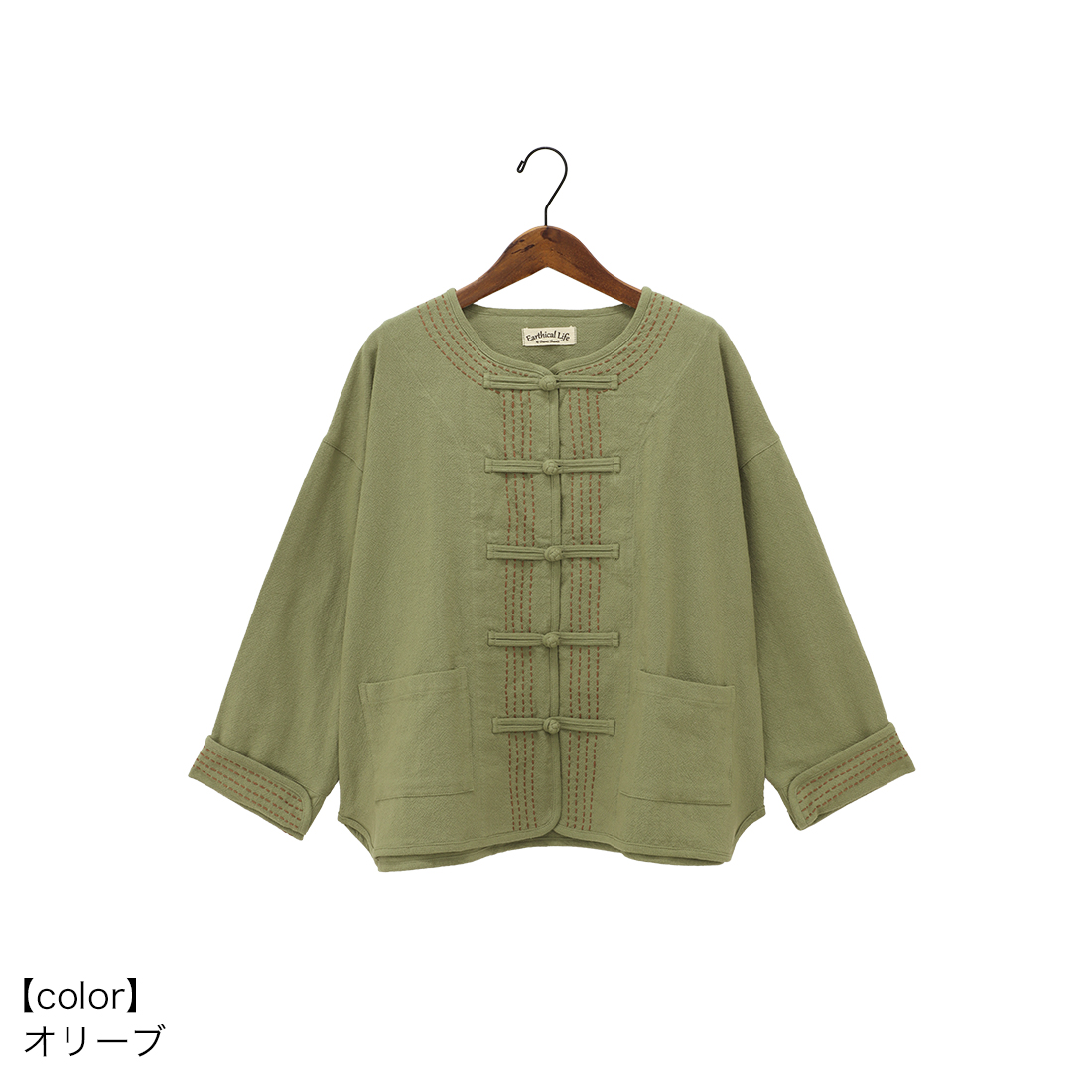 袖の折り返しと前身頃に入ったハンドステッチは全色布地に合わせて色が違うのがポイント。チャイナボタンがどんなコーデにもちょっとしたアクセントを加えてくれます。