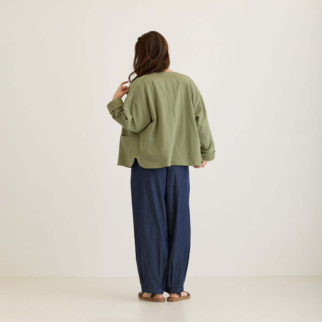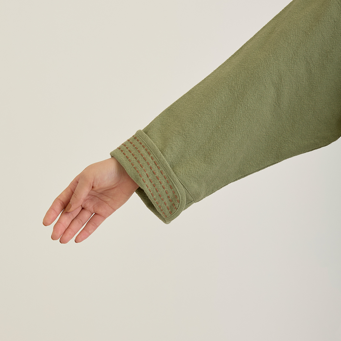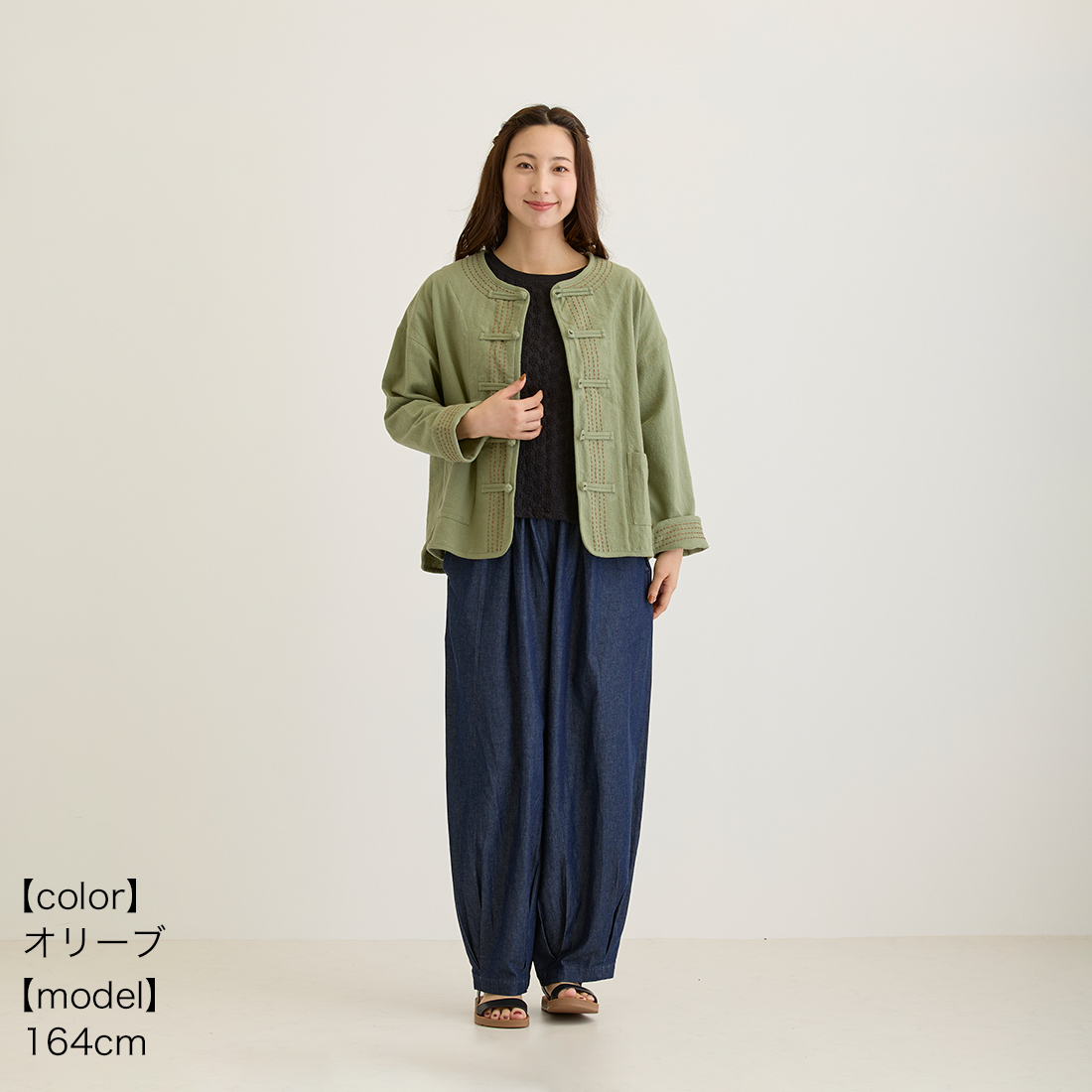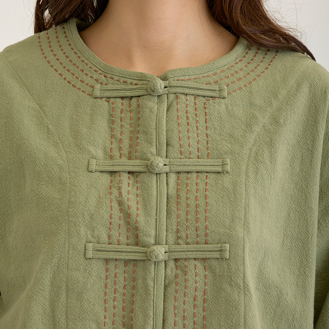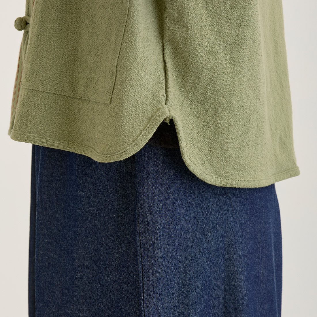 袖の折り返しと前身頃に入ったハンドステッチは全色布地に合わせて色が違うのがポイント。チャイナボタンがどんなコーデにもちょっとしたアクセントを加えてくれます。