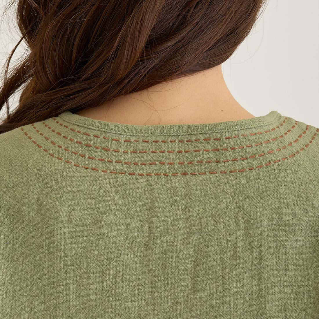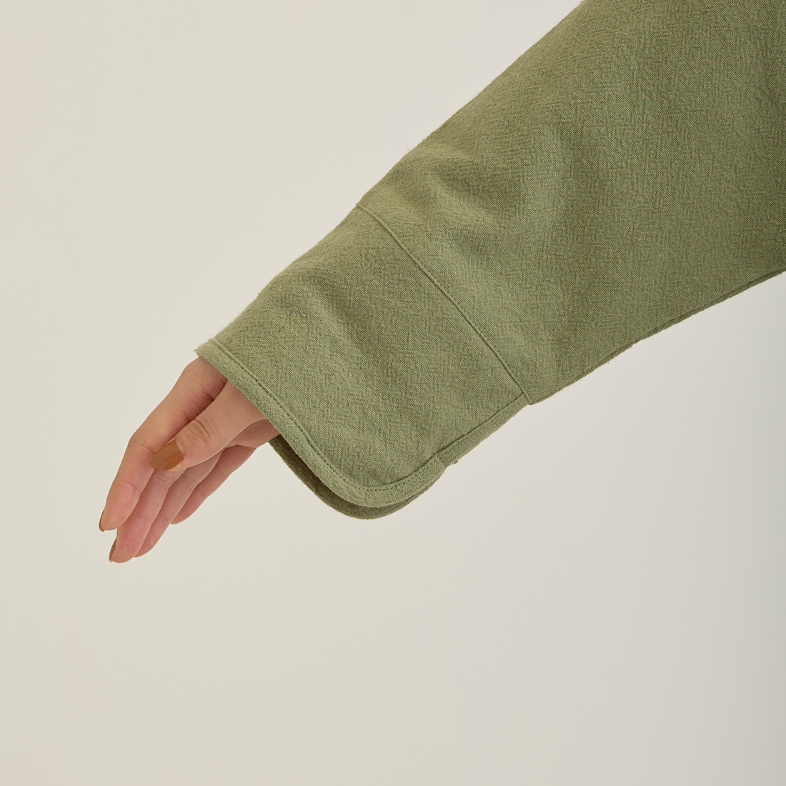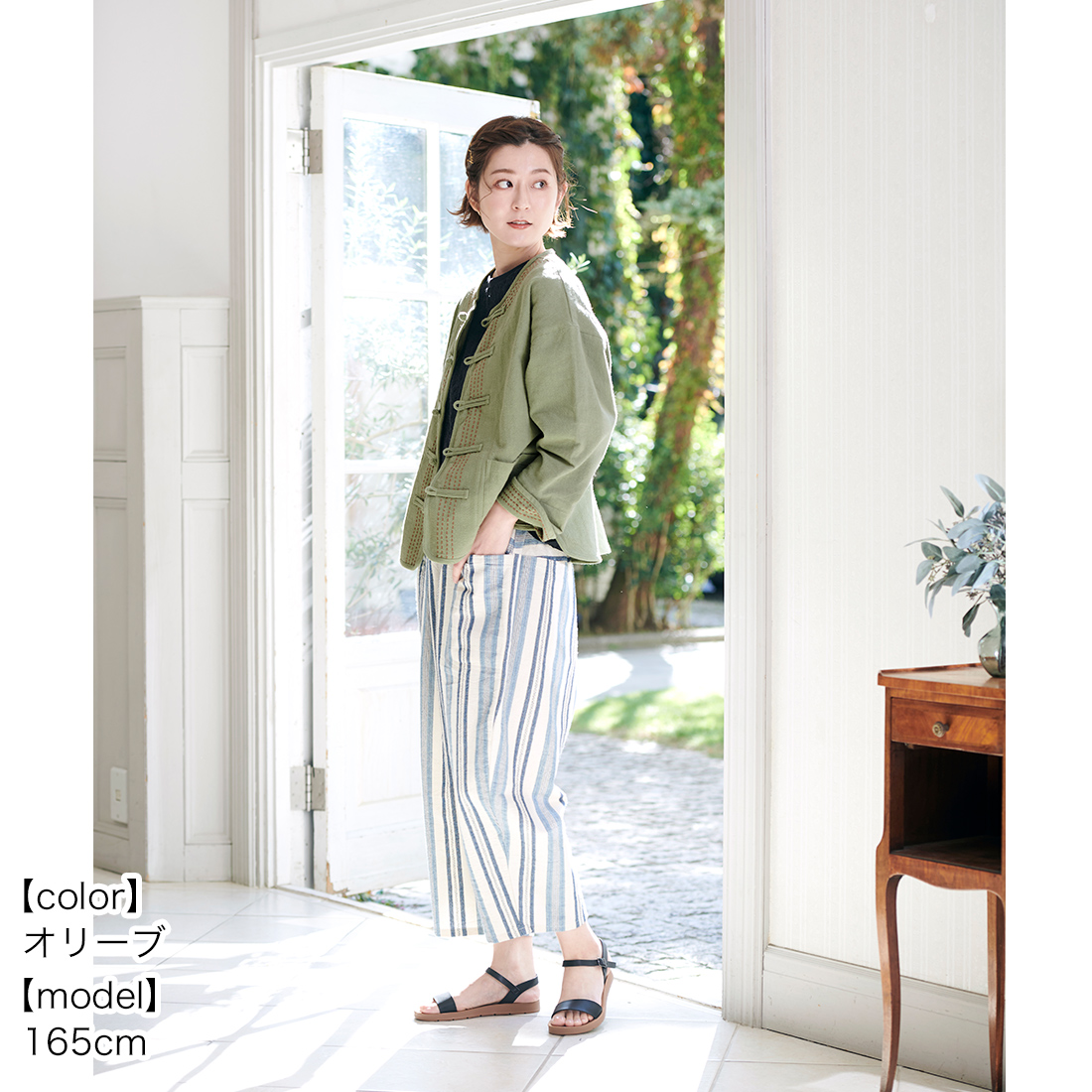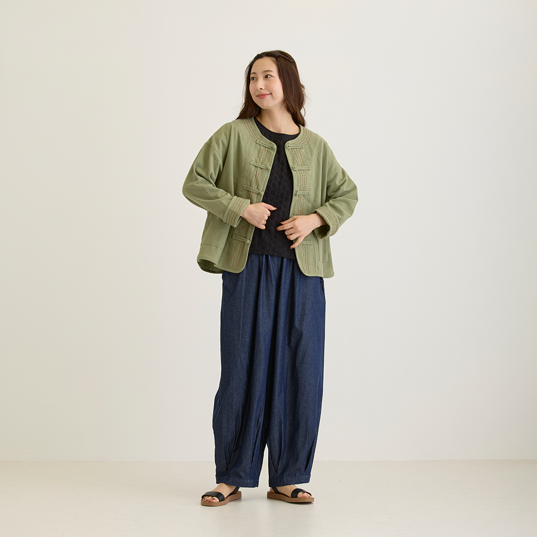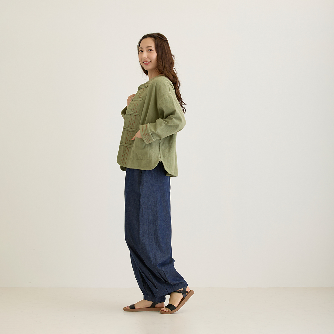袖の折り返しと前身頃に入ったハンドステッチは全色布地に合わせて色が違うのがポイント。チャイナボタンがどんなコーデにもちょっとしたアクセントを加えてくれます。