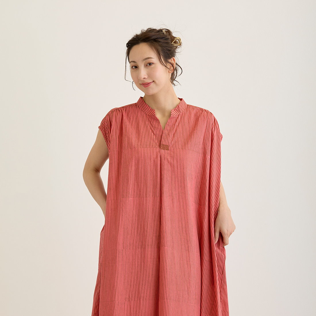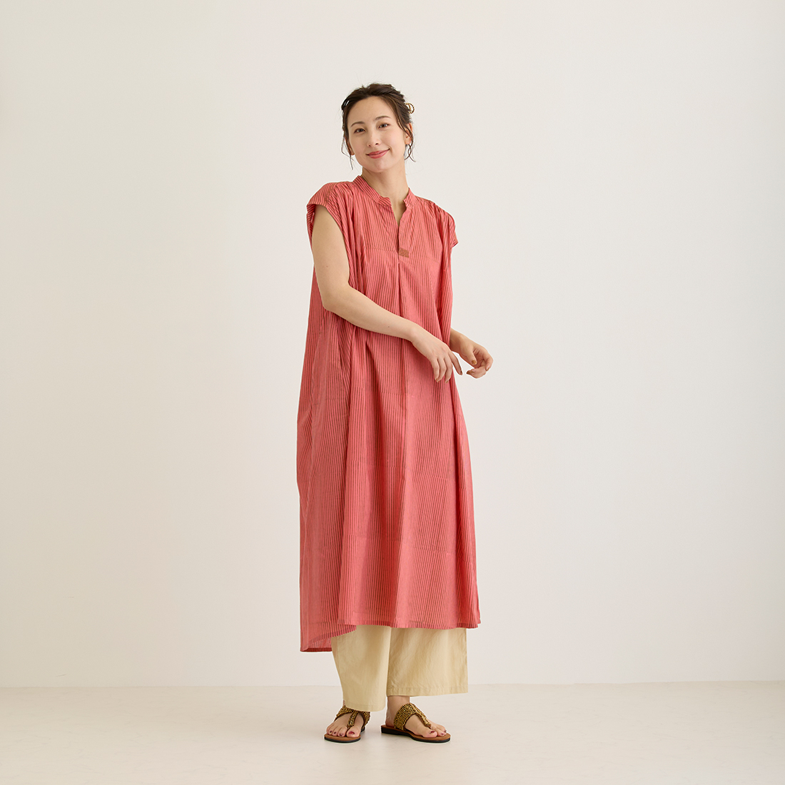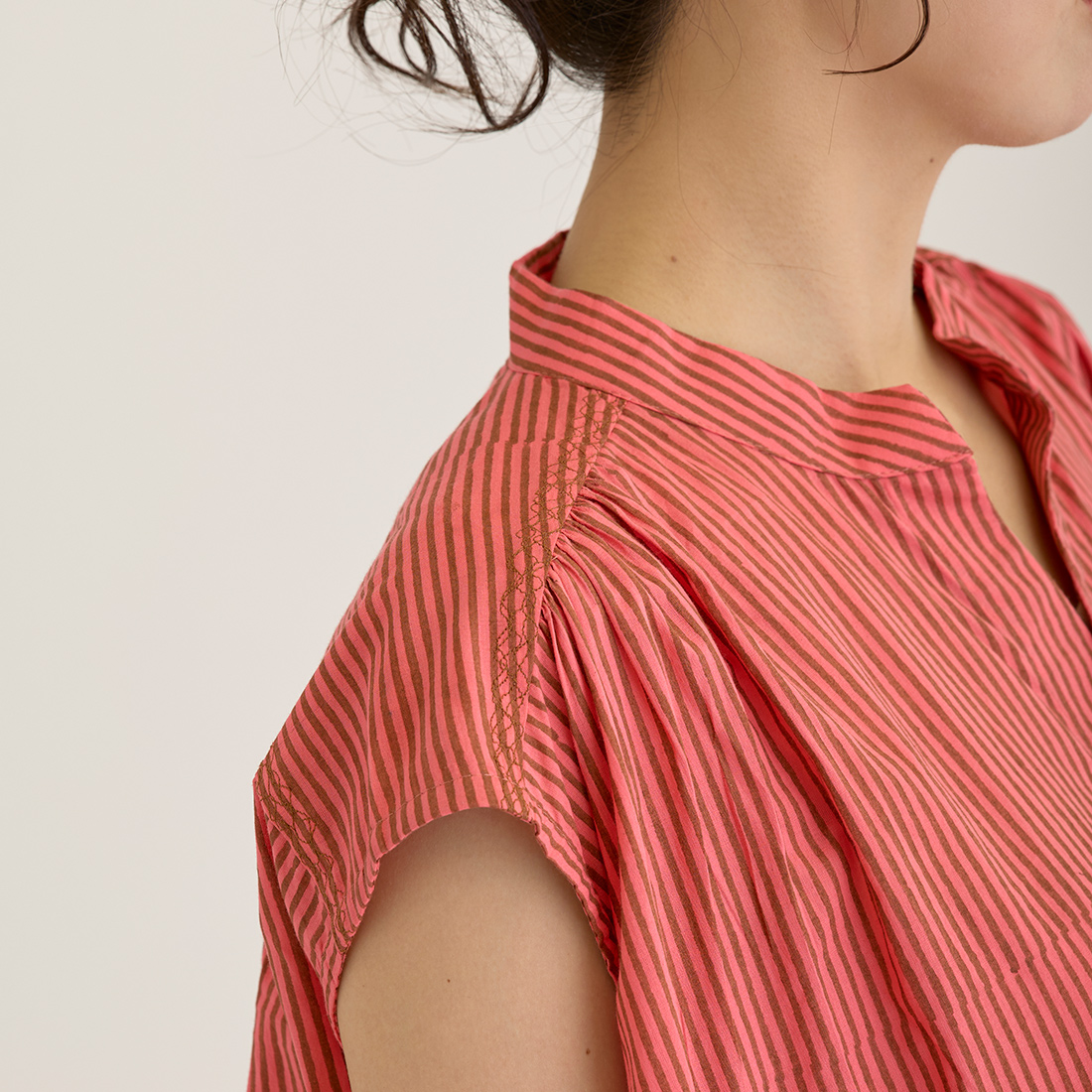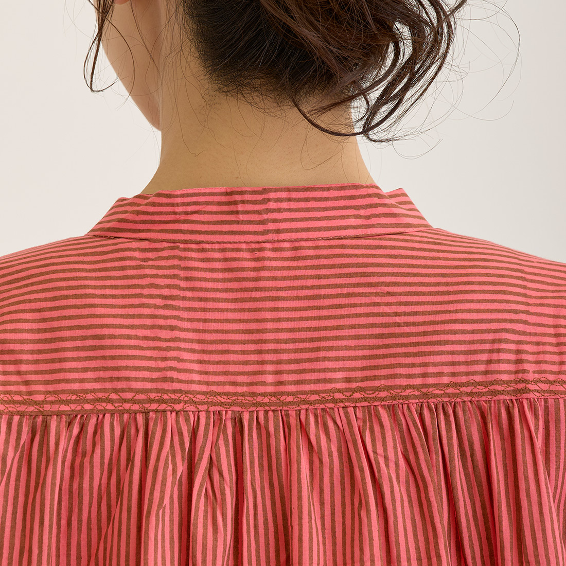 コットン生地にやさしい風合いの細幅ストライプのブロックプリントをのせ、軽やかで抜け感のあるスタイルに仕上げました。