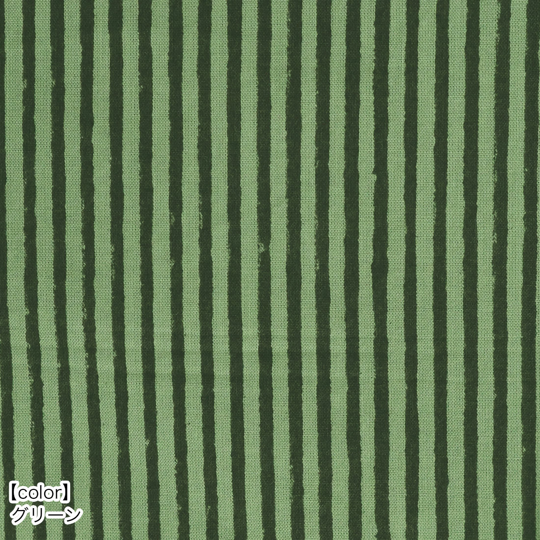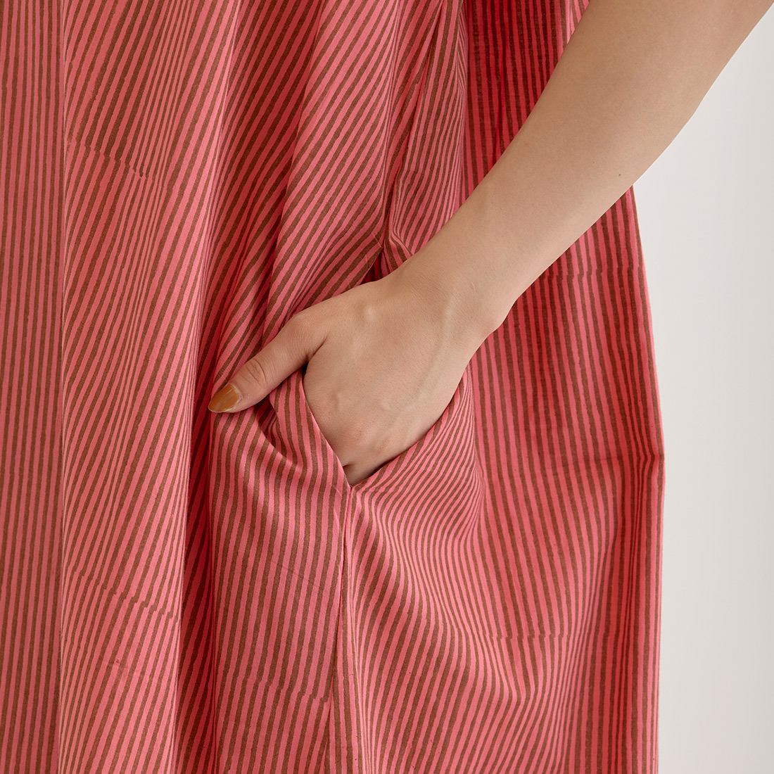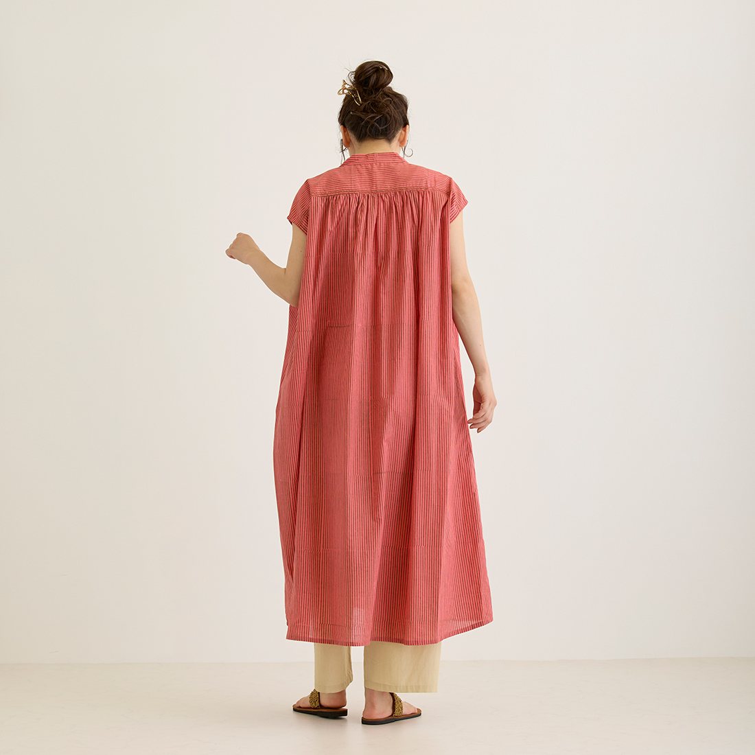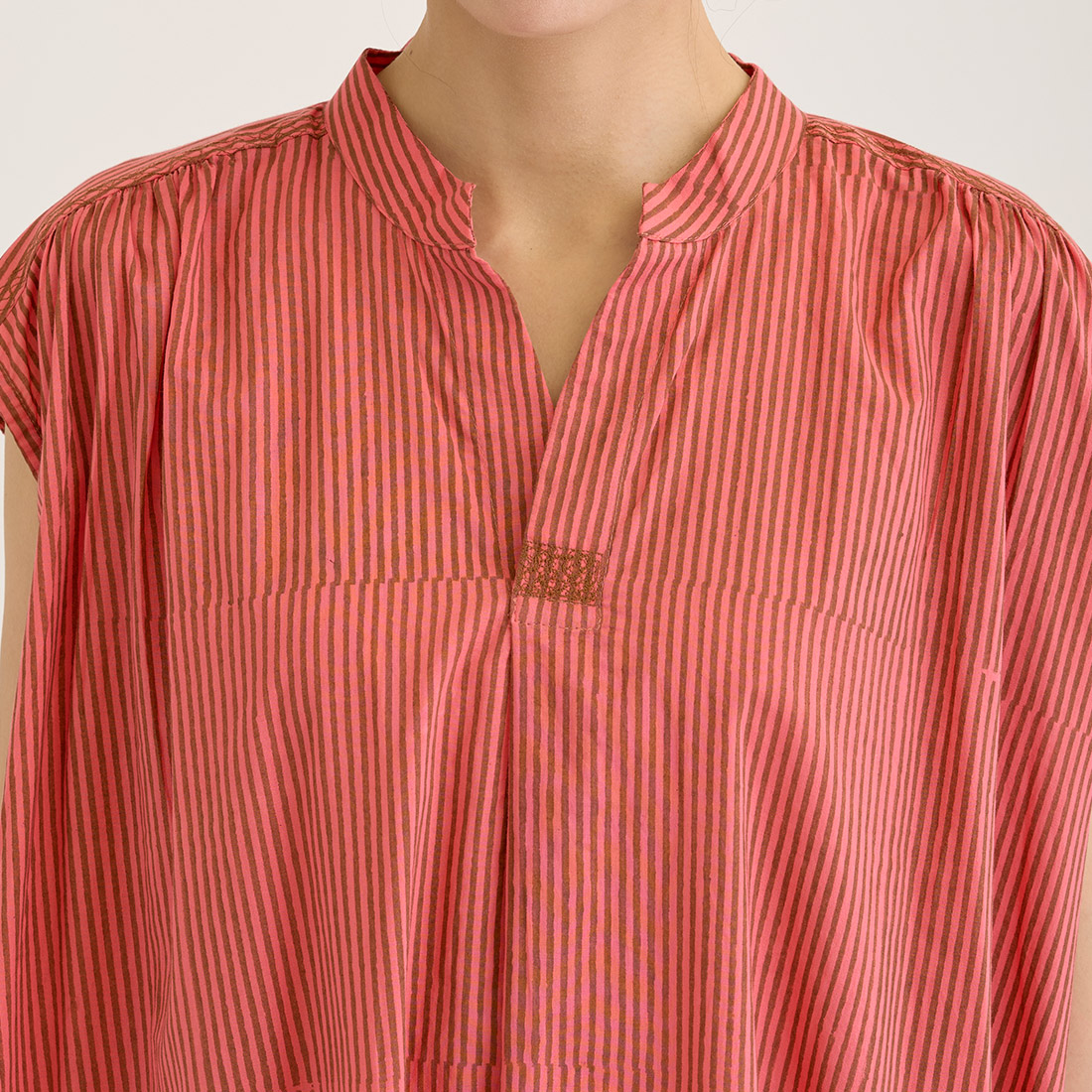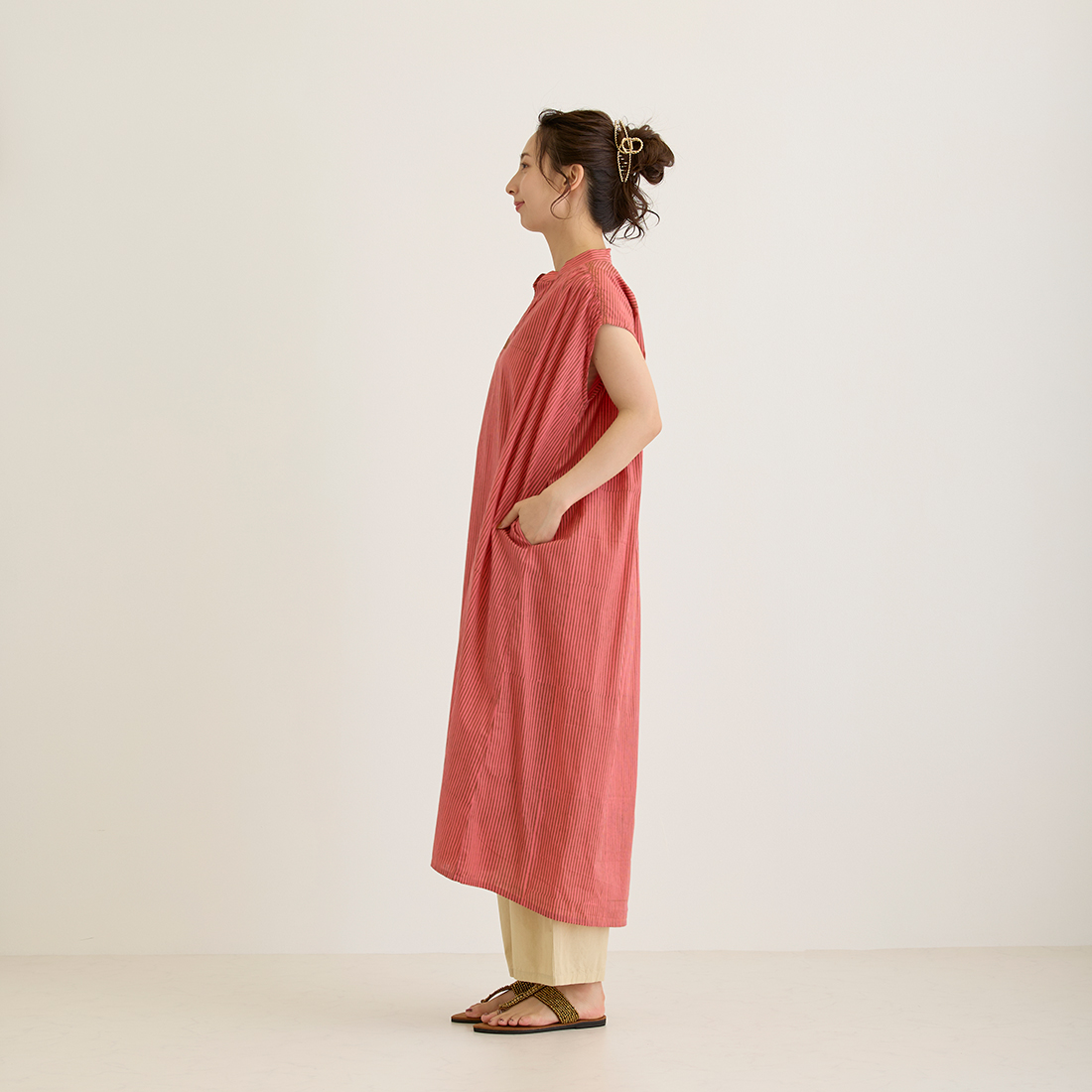 コットン生地にやさしい風合いの細幅ストライプのブロックプリントをのせ、軽やかで抜け感のあるスタイルに仕上げました。