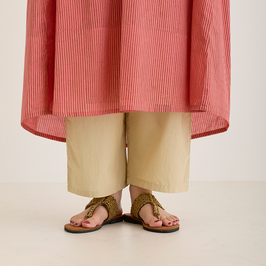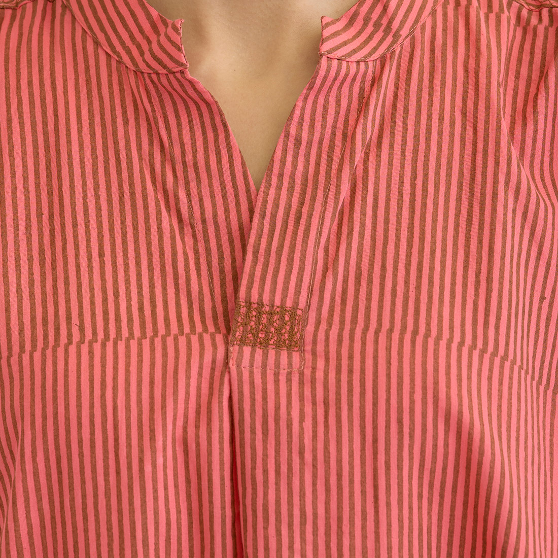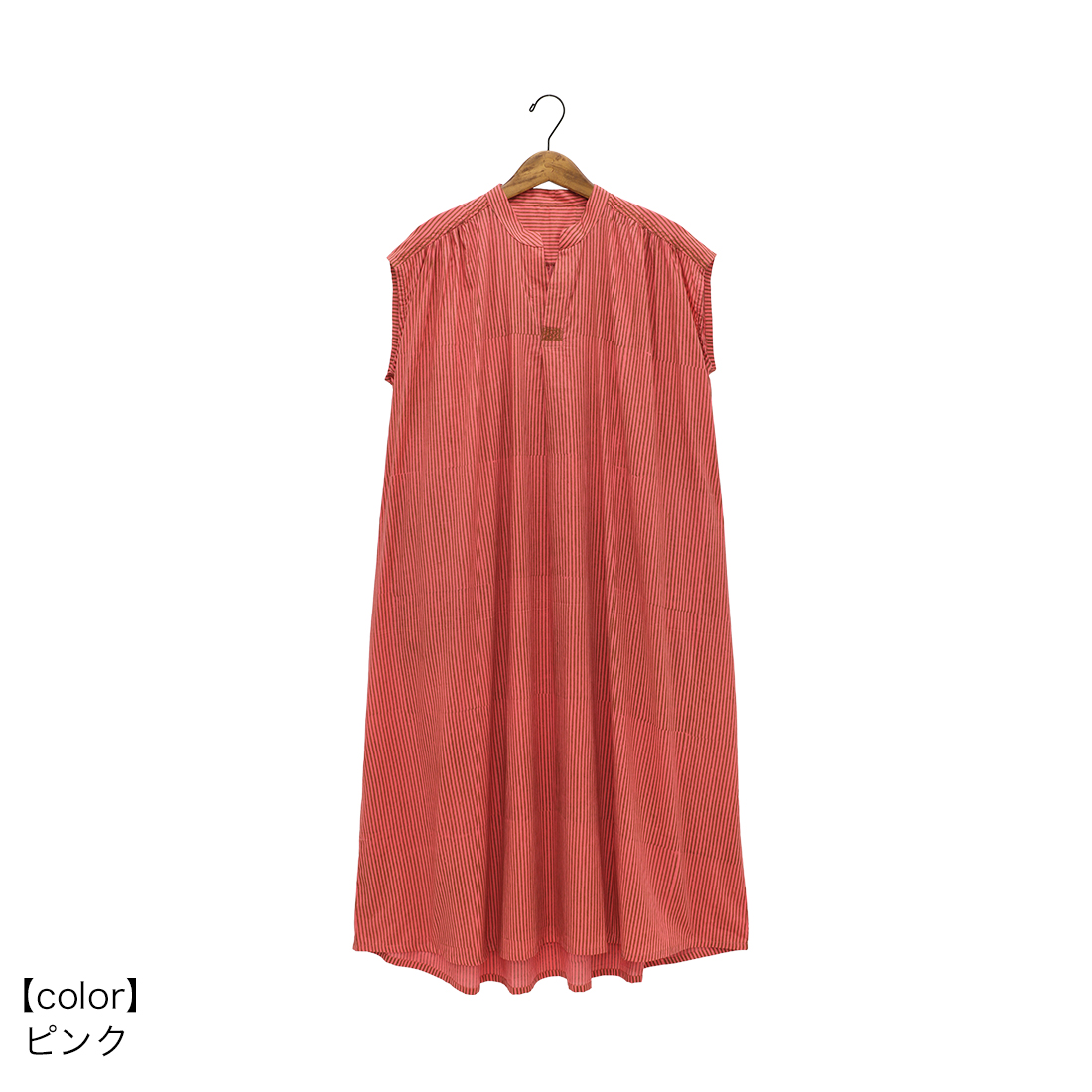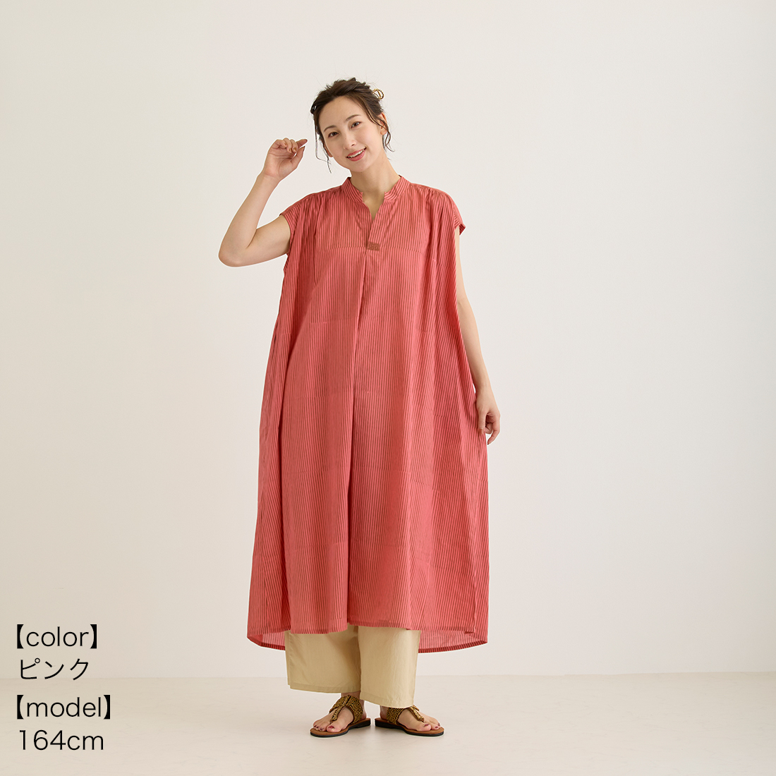 コットン生地にやさしい風合いの細幅ストライプのブロックプリントをのせ、軽やかで抜け感のあるスタイルに仕上げました。