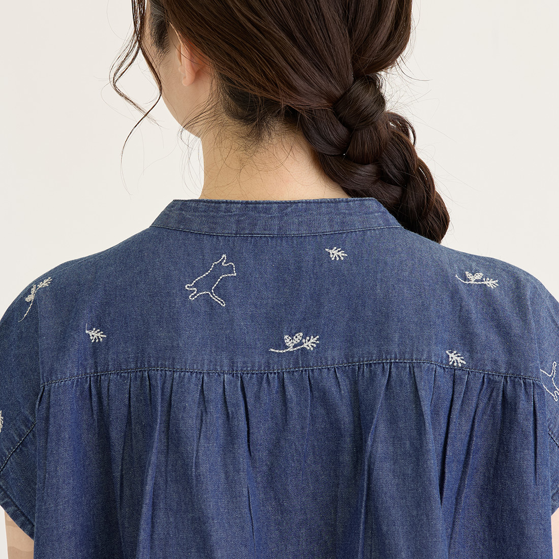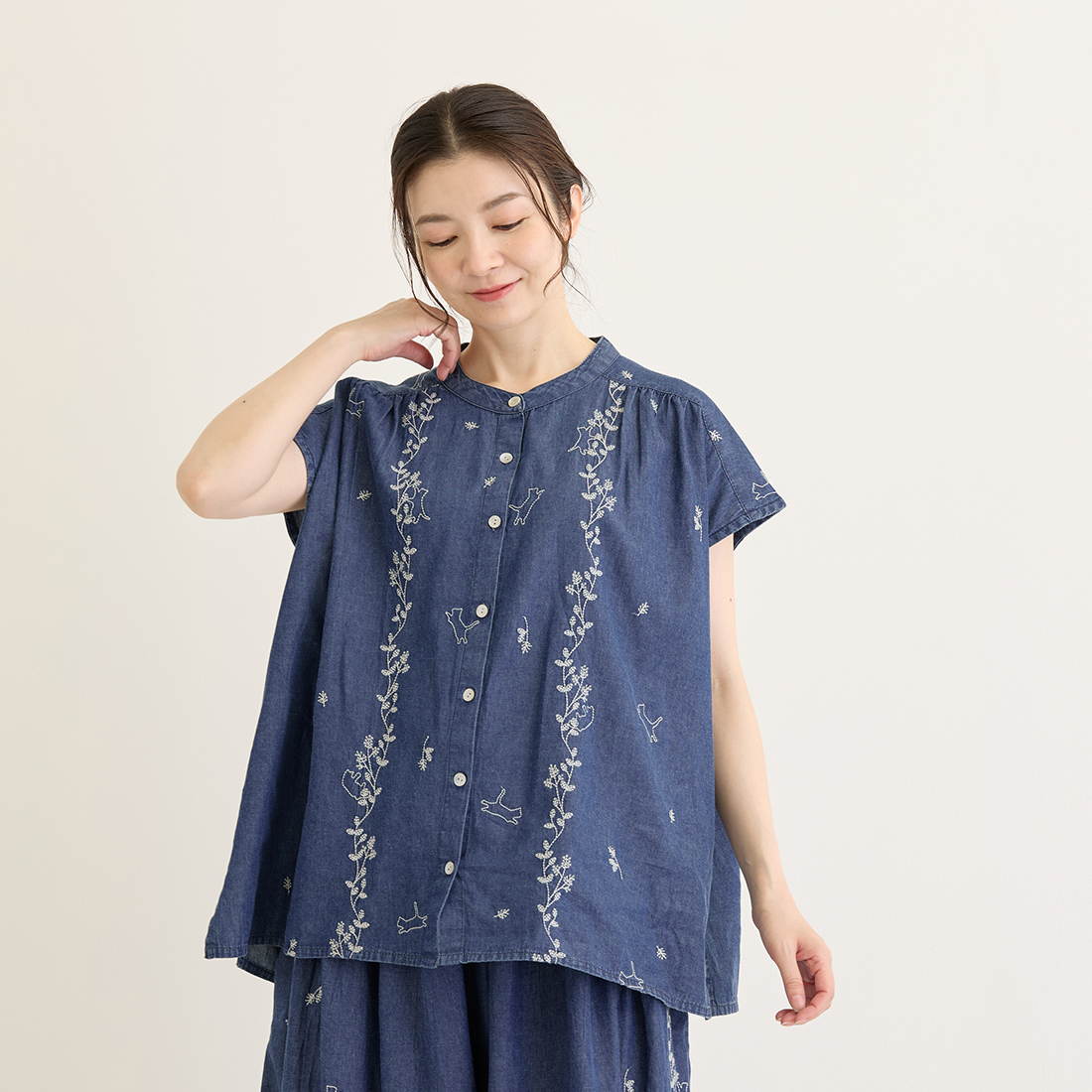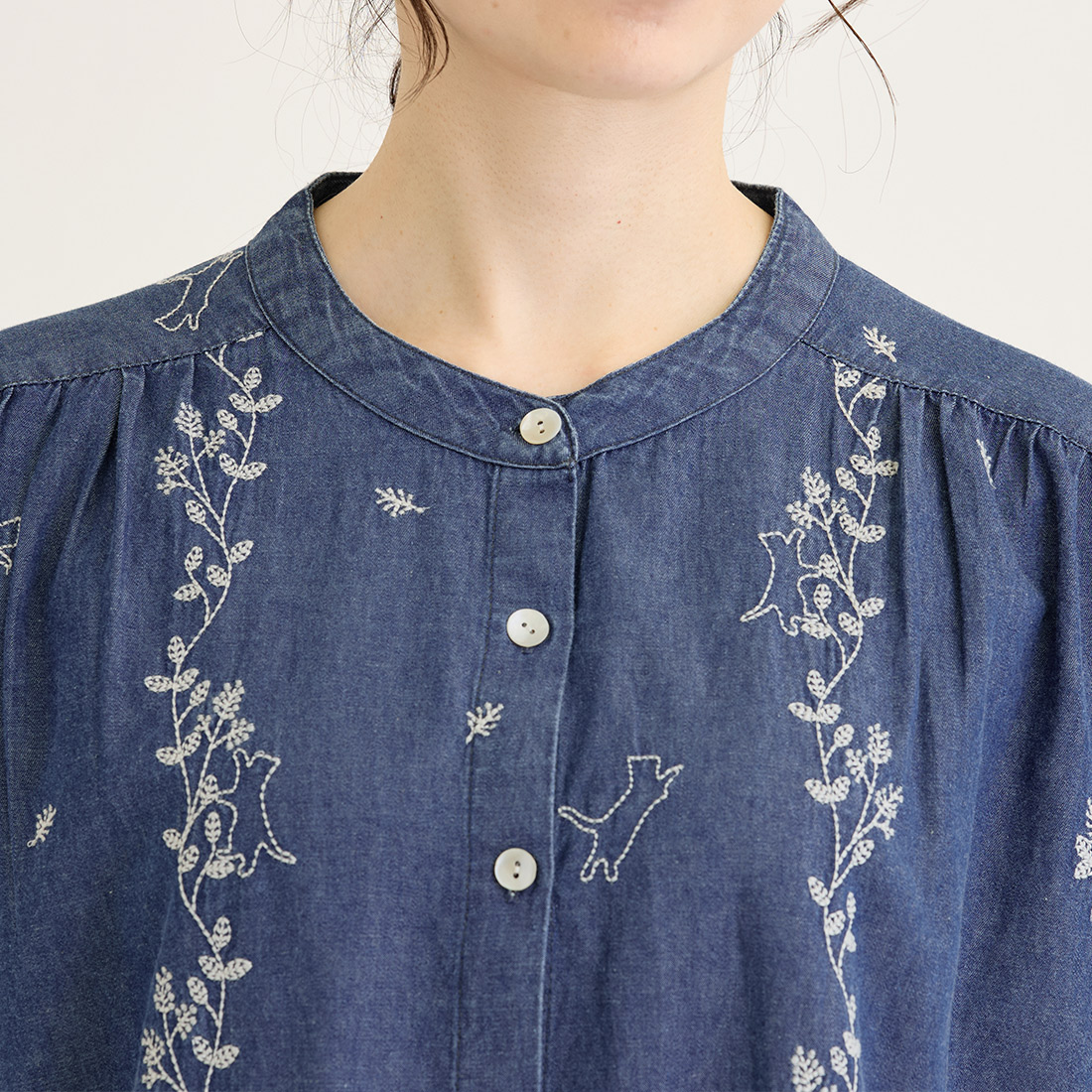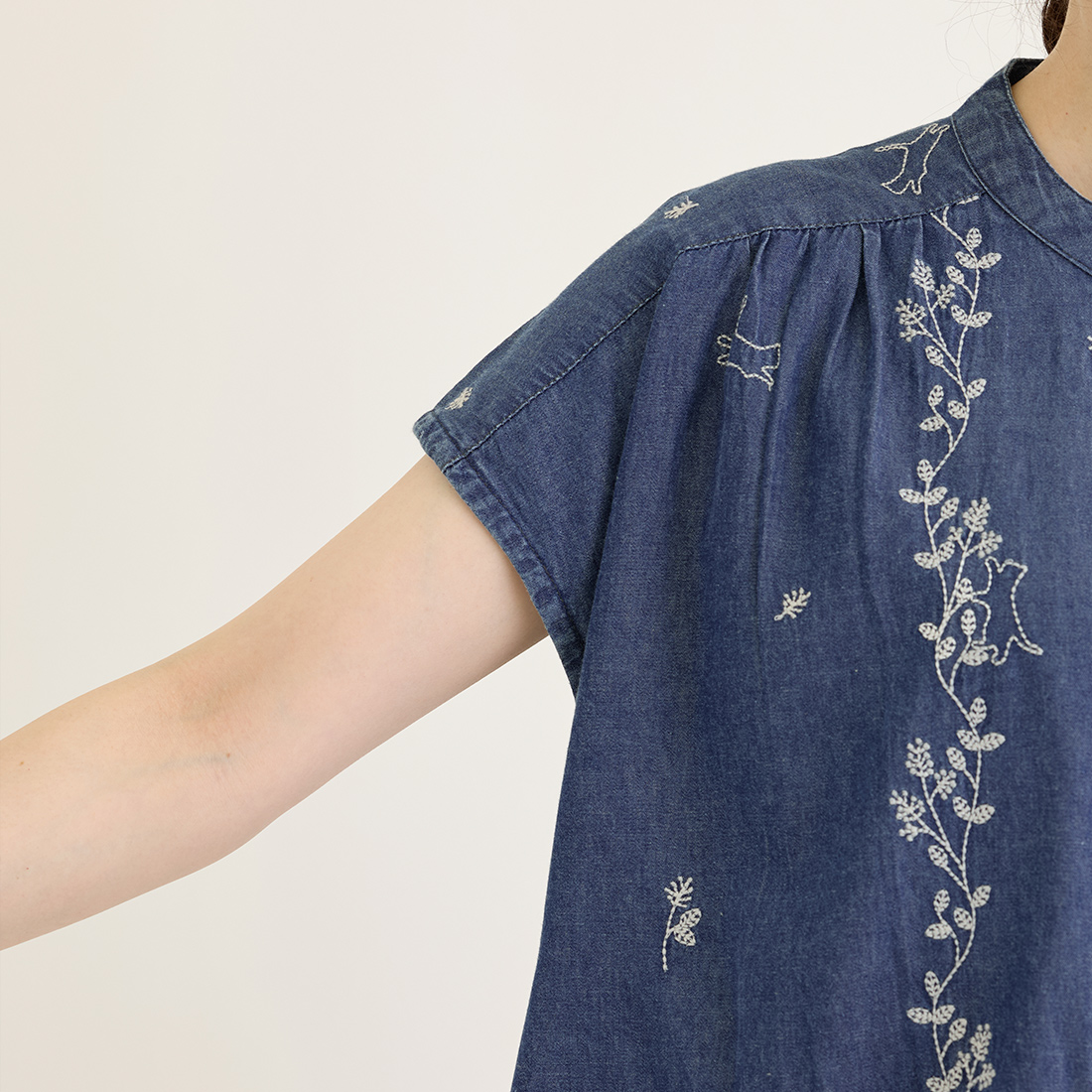 ネコたちがのびのびと過ごす様子の刺繍で、シンプルな型にもさりげない遊び心をプラスしました。