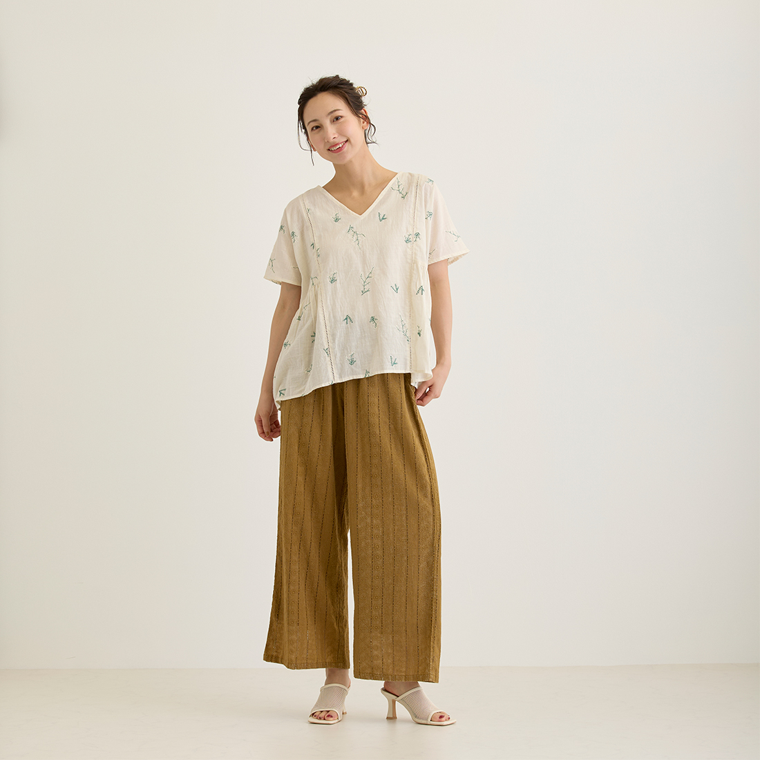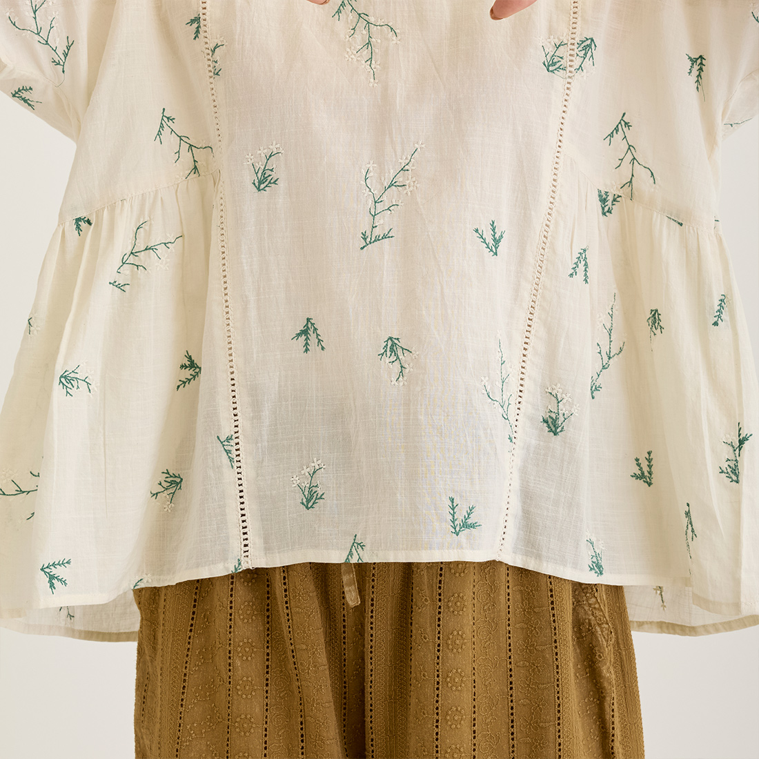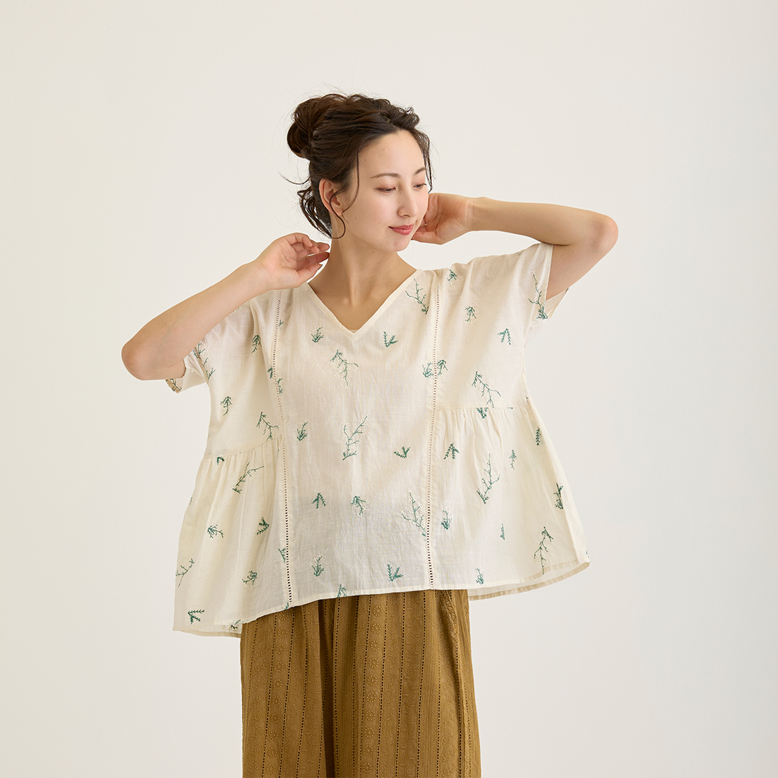 味のあるコットンスラブに、ハーブのような刺繍を贅沢に施しました。