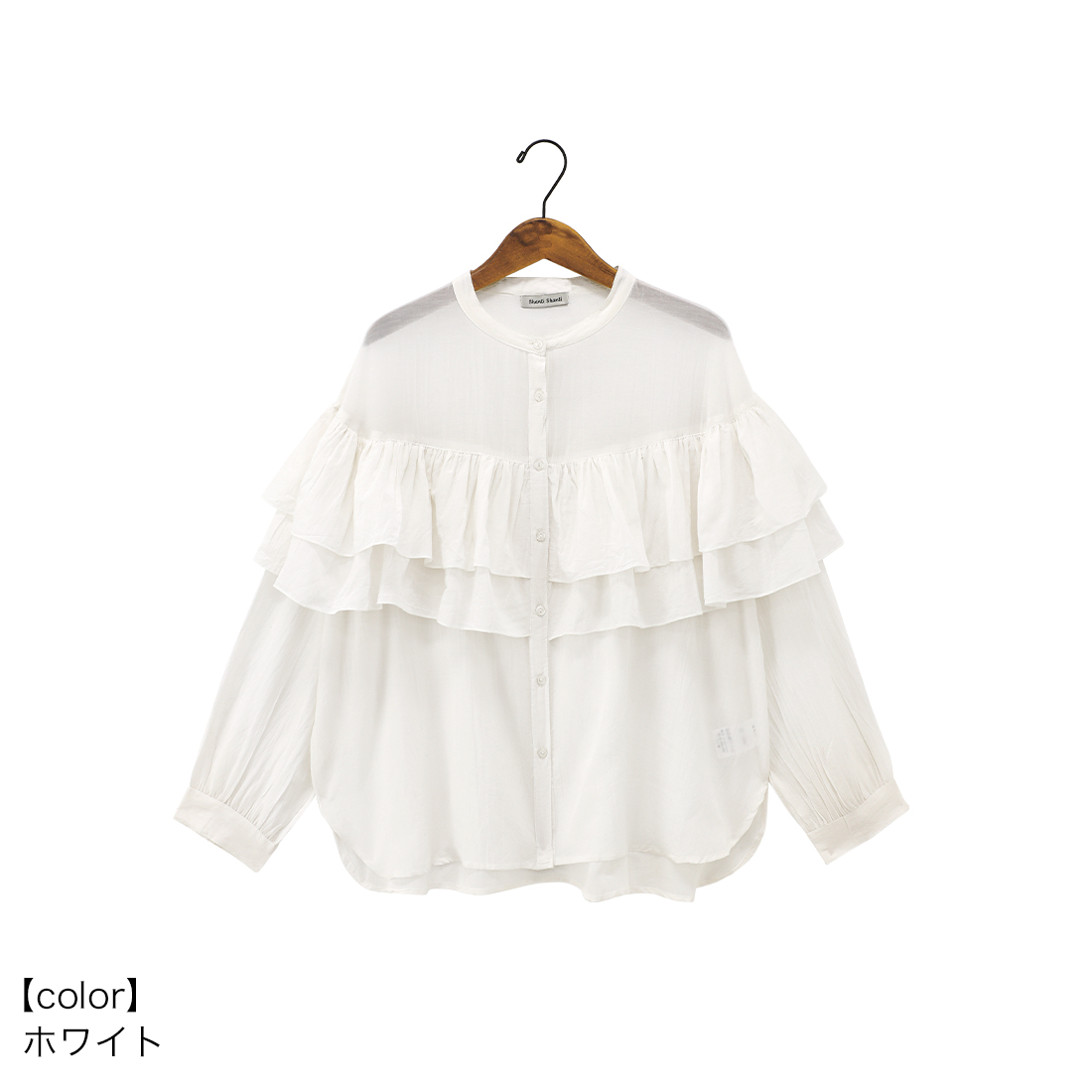 透け感のあるオーガンジーにたっぷりフリルをあしらい、軽やかで華やかなブラウスに仕上げました。