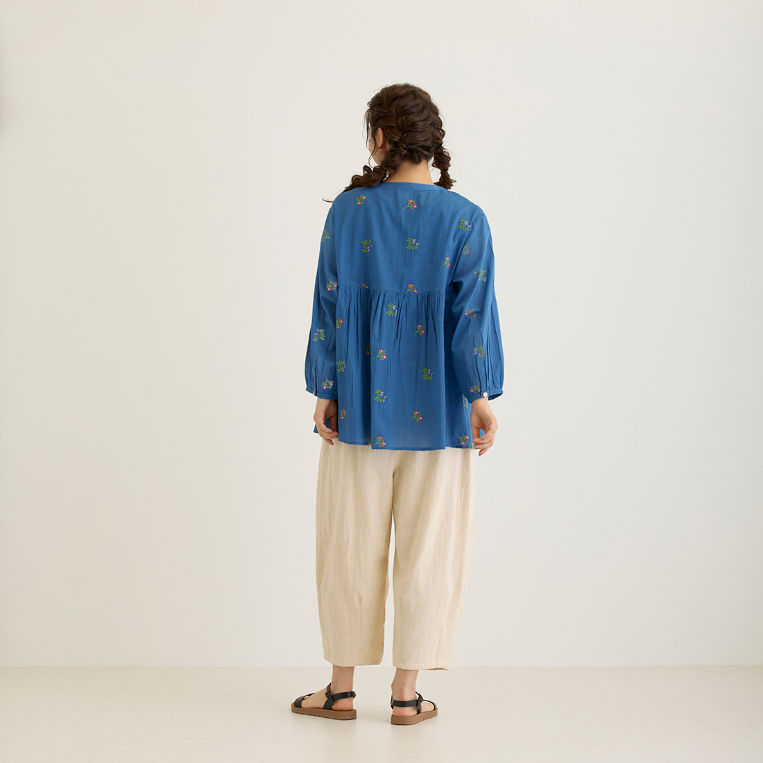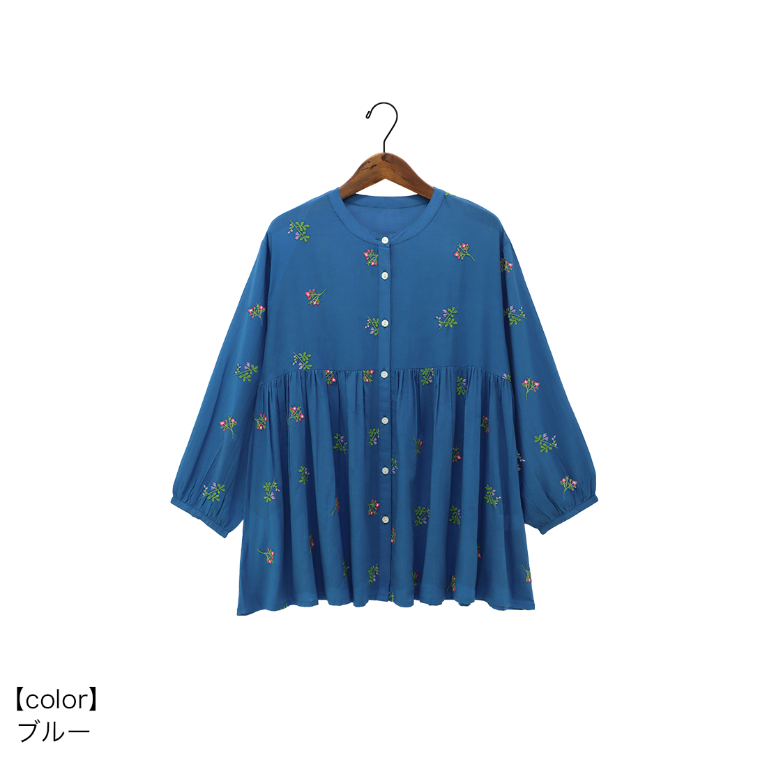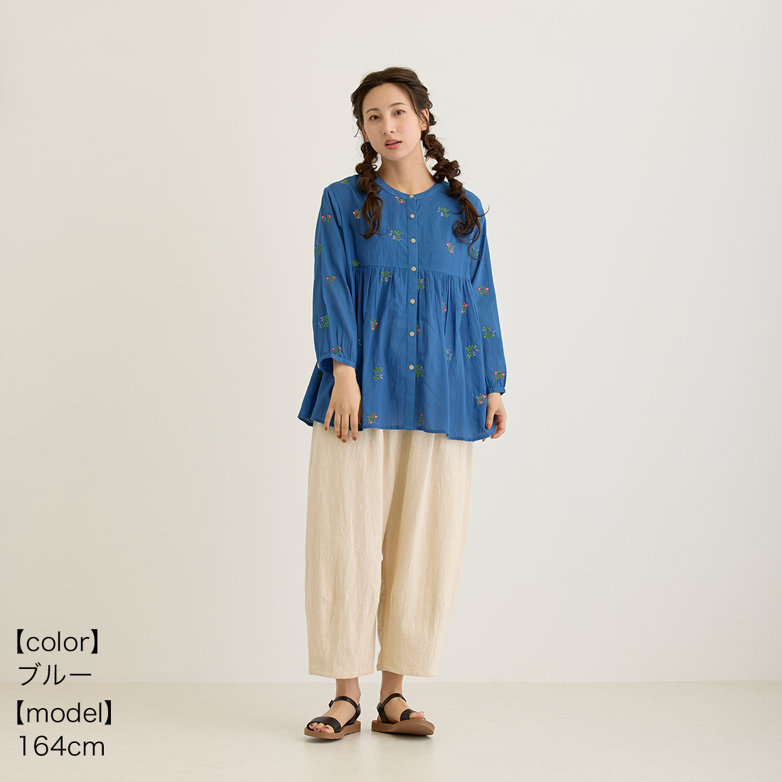 前開きタイプのブラウスは着脱しやすく、夏の羽織や日よけにも使える万能アイテムです。