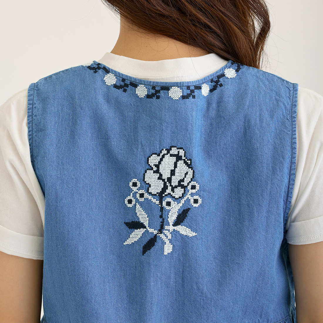 襟元からボタンの両脇に続く縦のラインの刺しゅうが全体をすっきり見せてくれます。