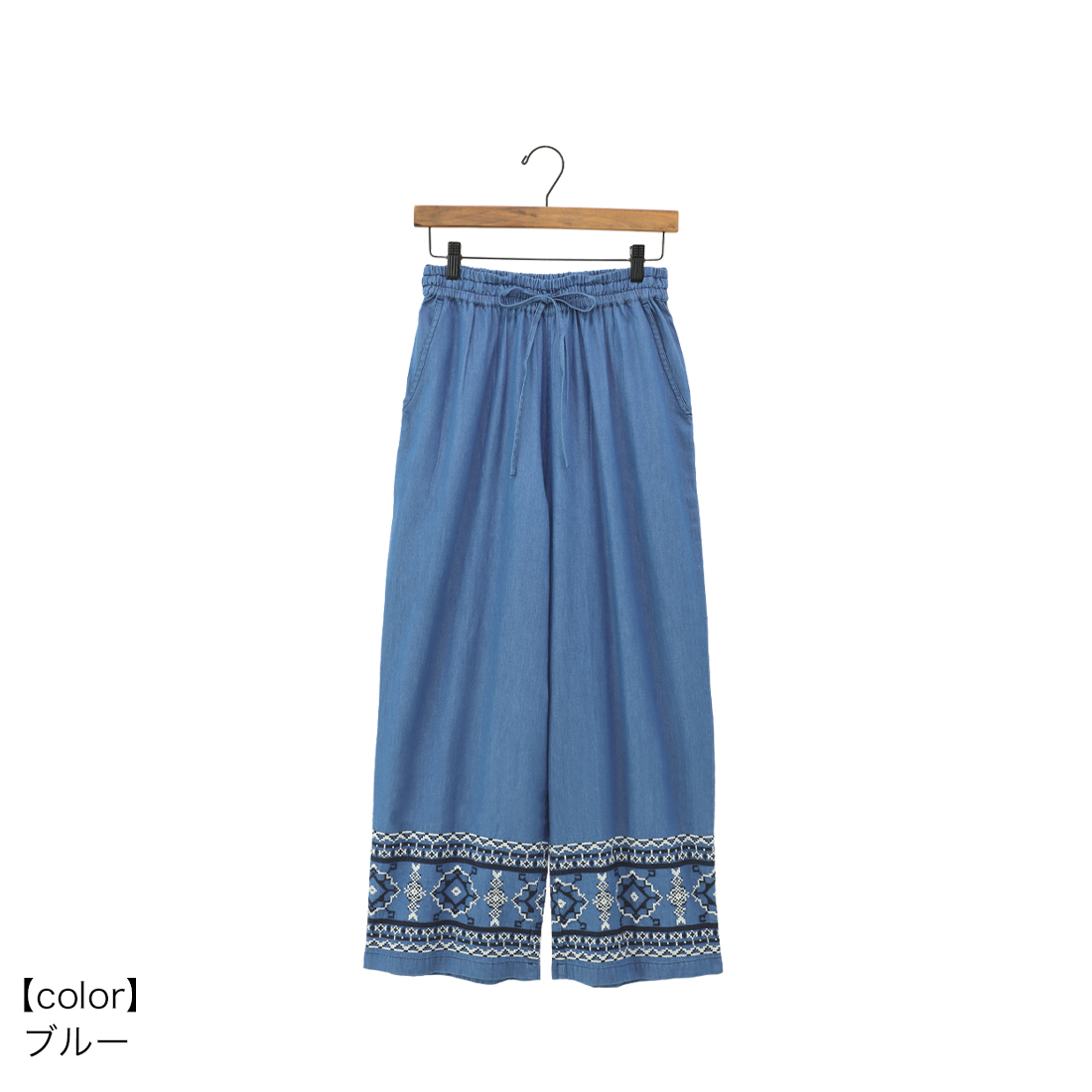 パンツの裾に幾何学的な刺しゅうを施しました。