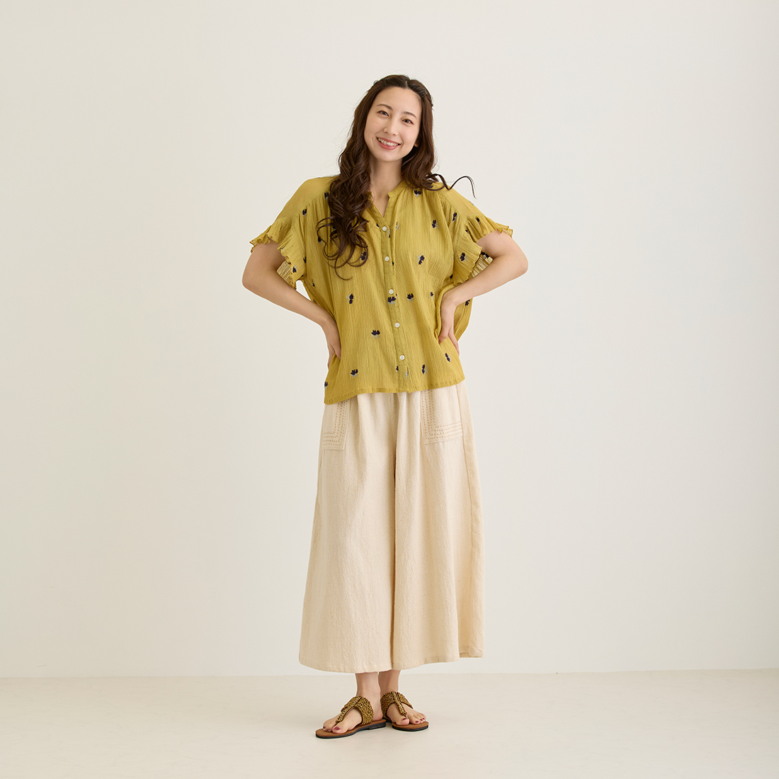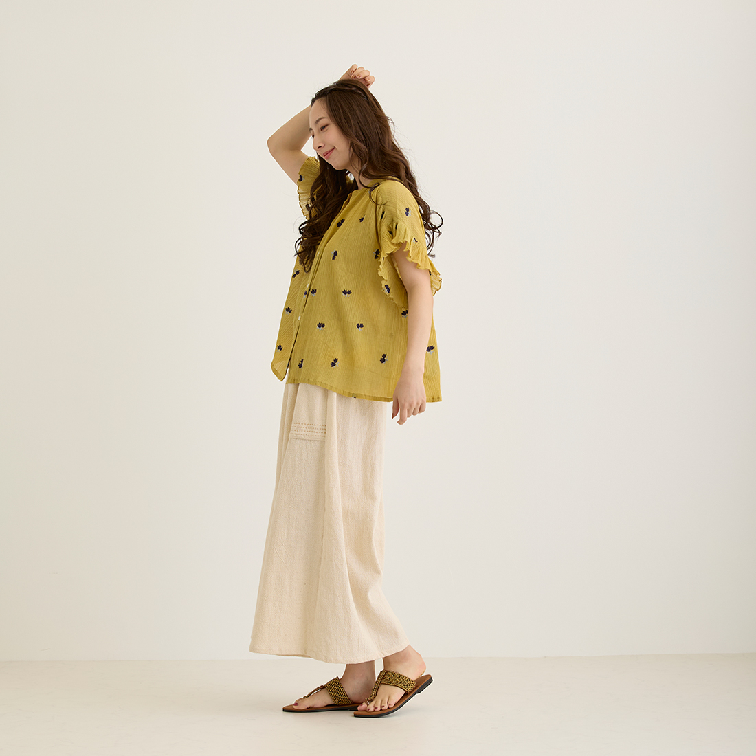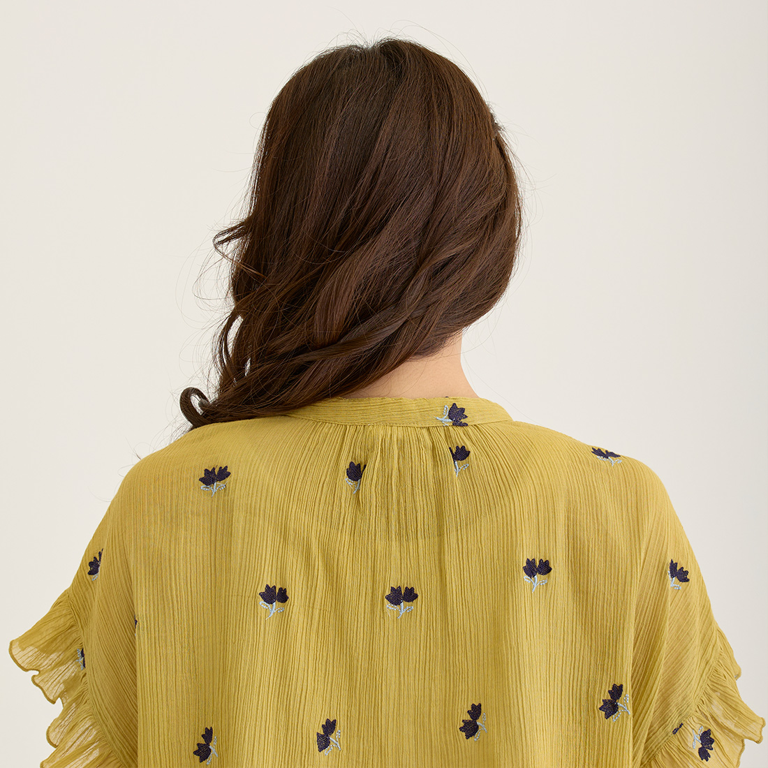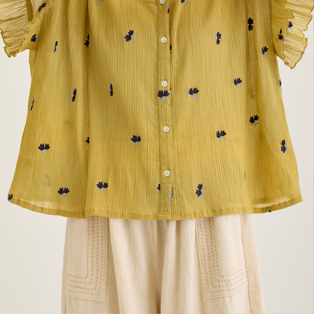 花の刺繍が映えるコットンクレープで、ナチュラルで可愛らしい印象に仕上げました。