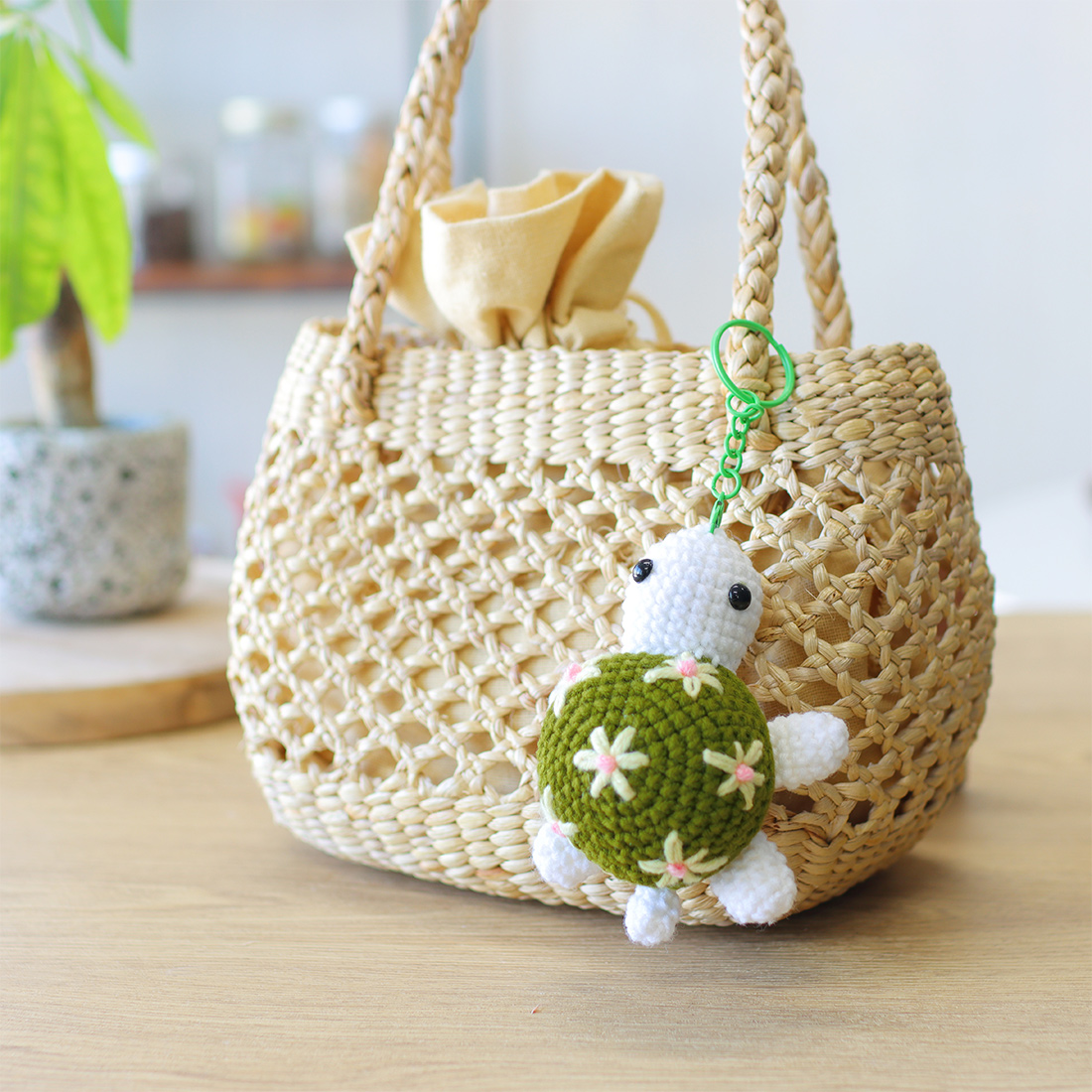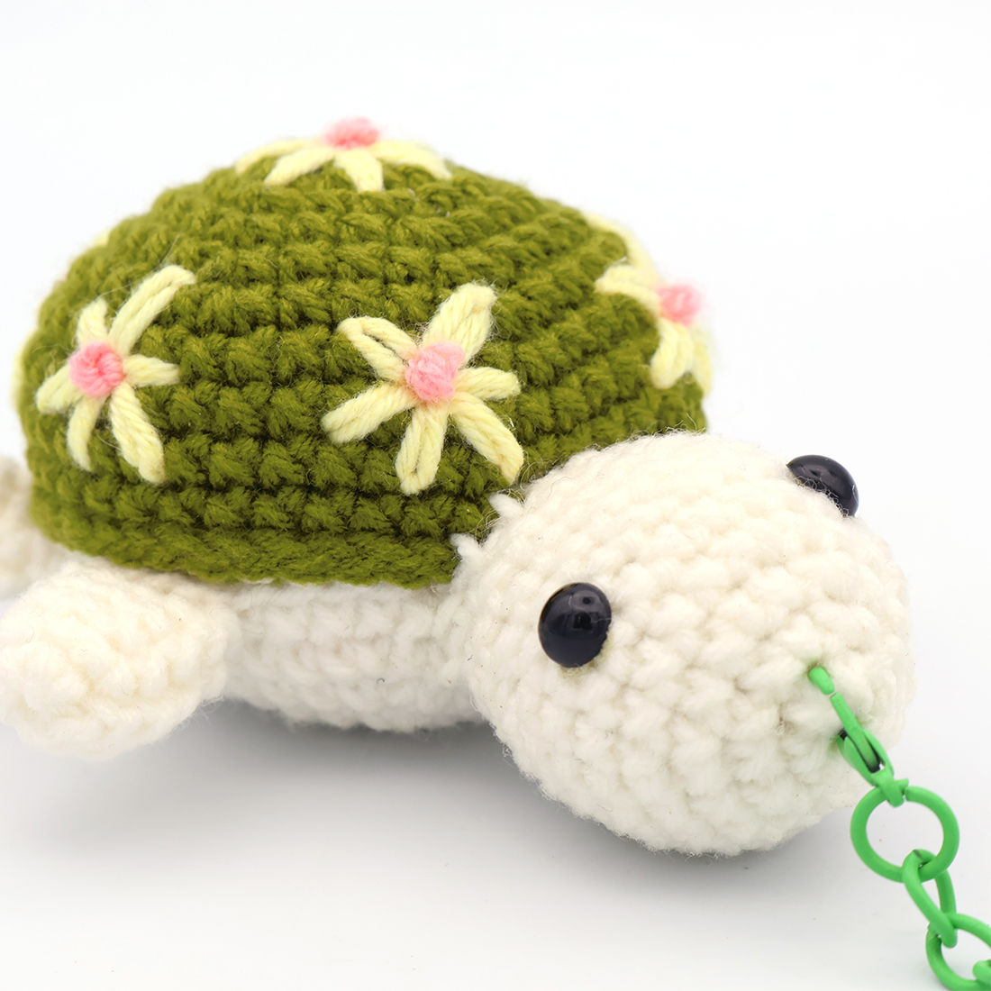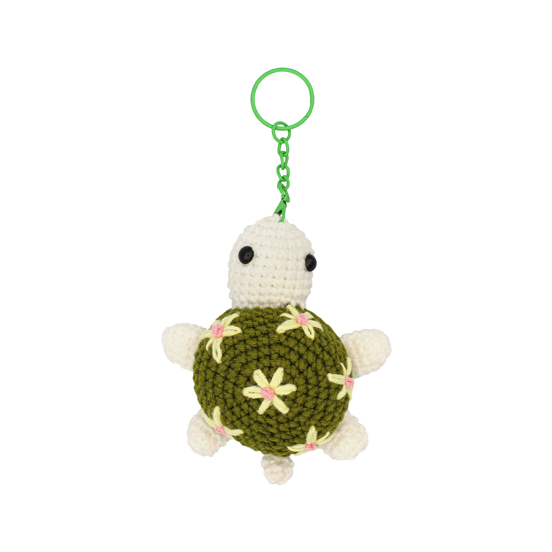 バッグや鍵、ポーチに付けるだけで、愛らしく温かみのあるアクセントをプラスします。甲羅には可愛らしいフラワーモチーフをあしらいました。