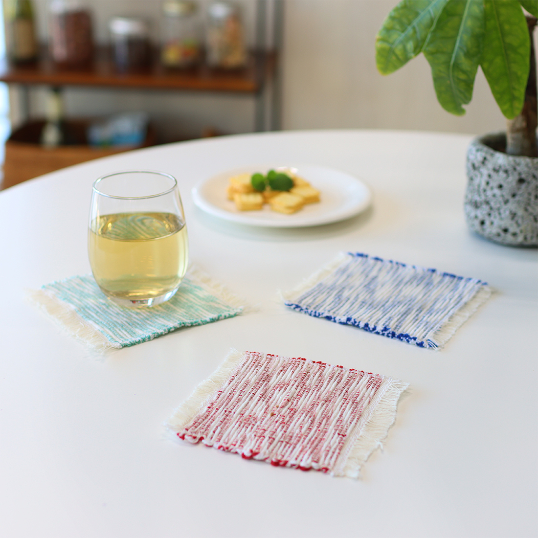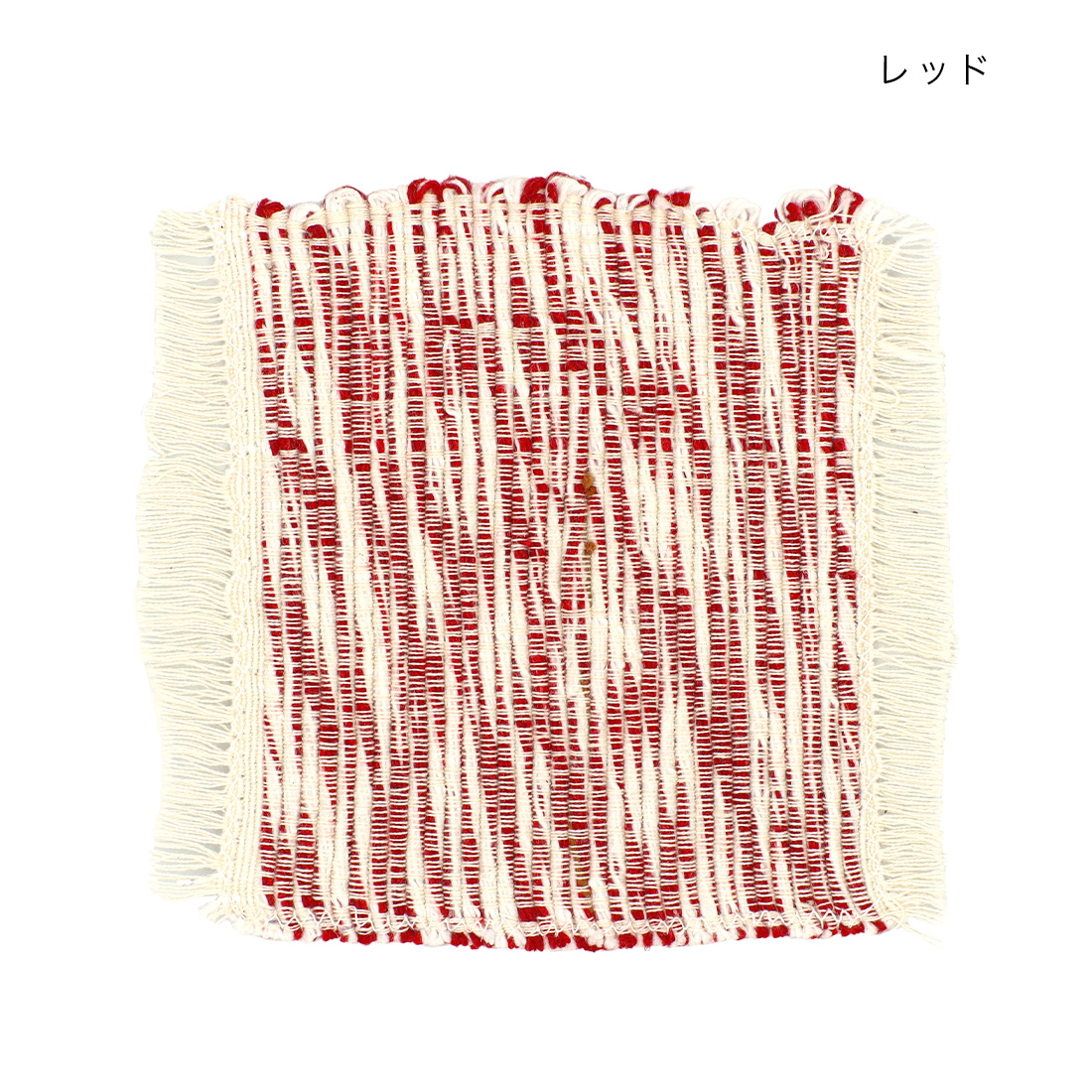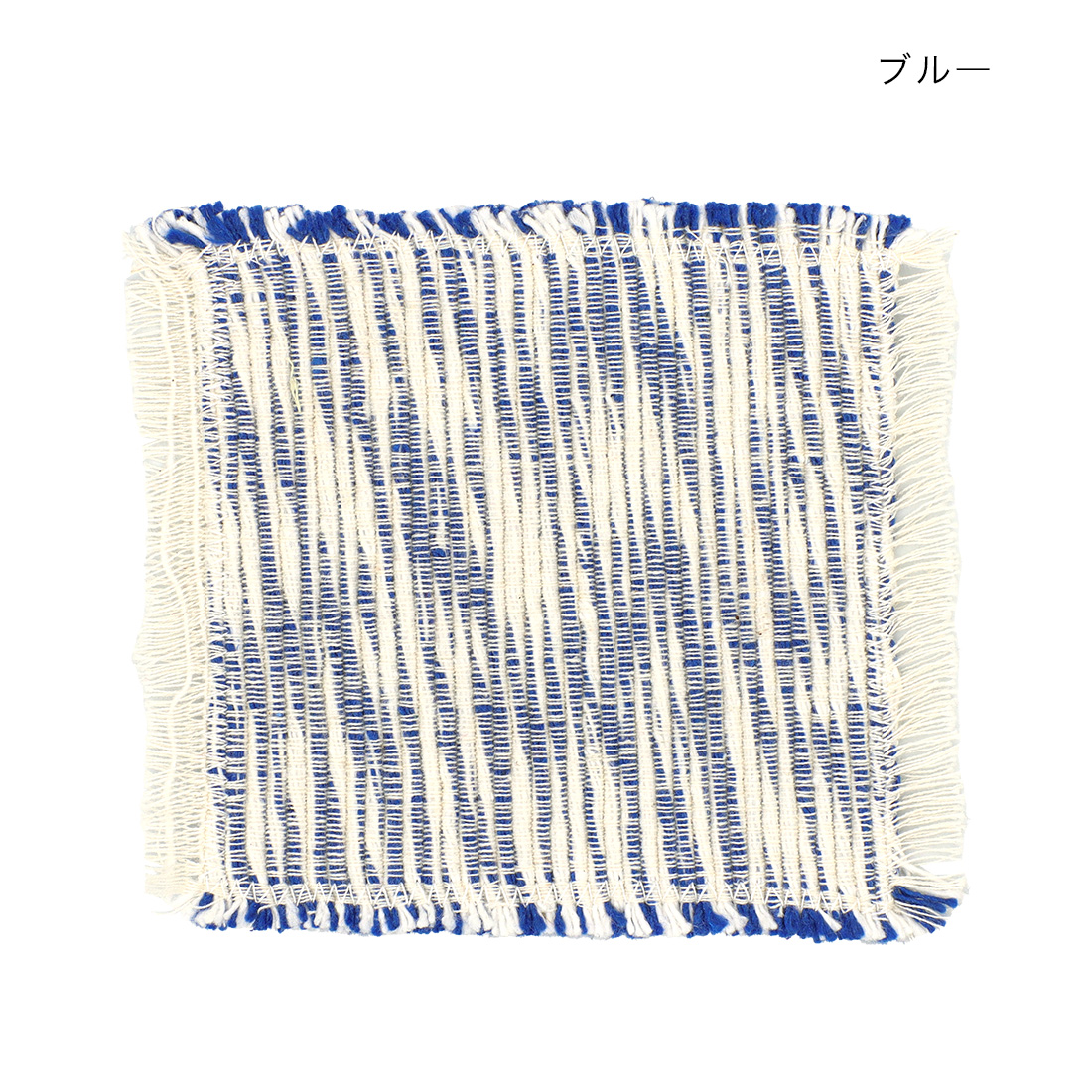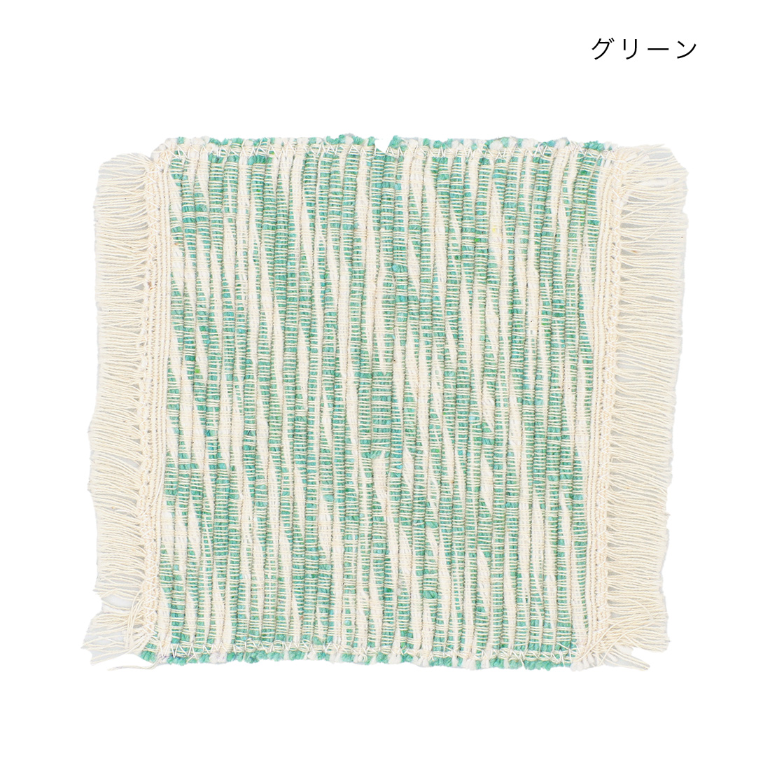 綿100%のやさしい風合いが魅力の、織り柄コースターです。端にはフリンジをあしらい、ナチュラルな雰囲気に仕上げました。同シリーズのランチマットと揃えて使っても◎。