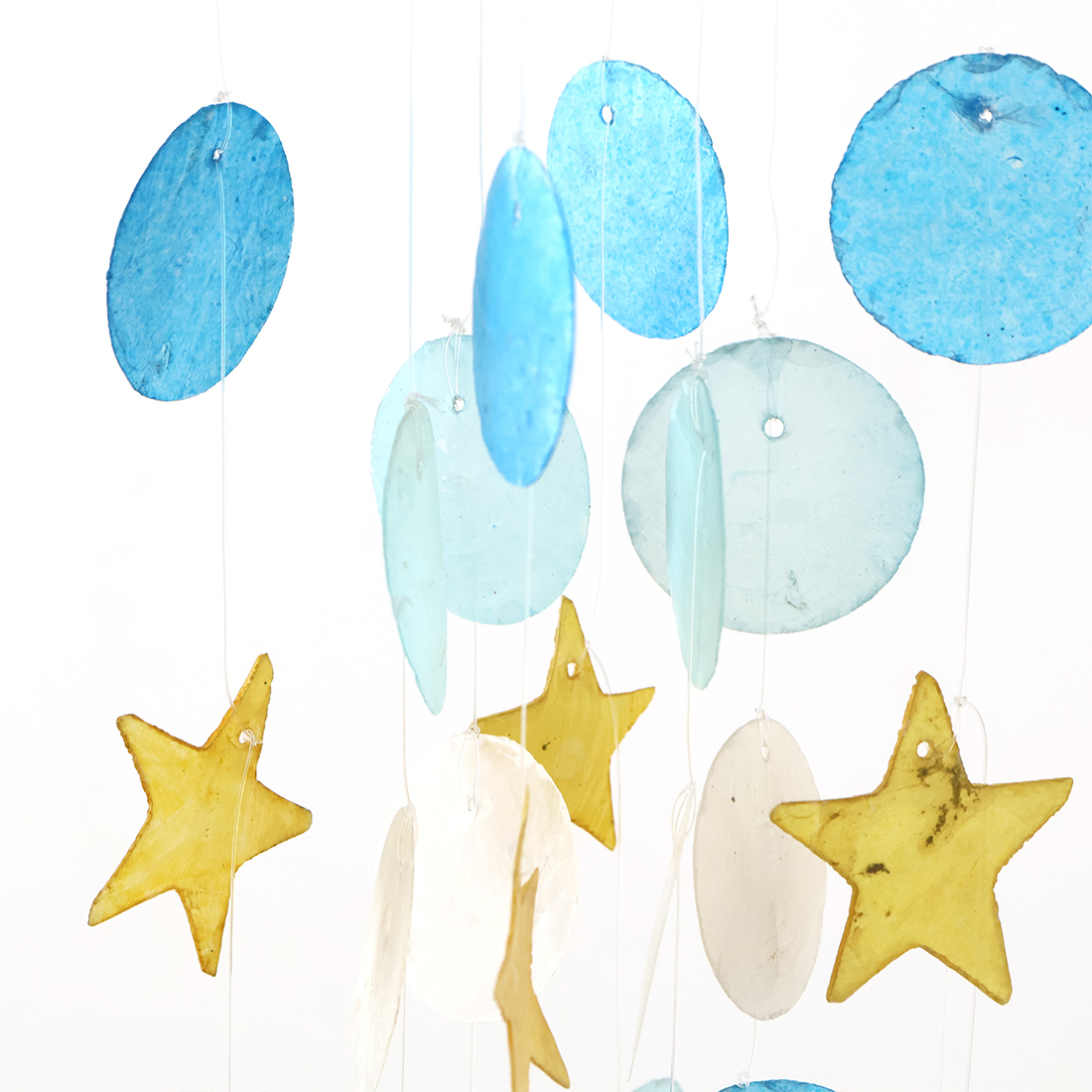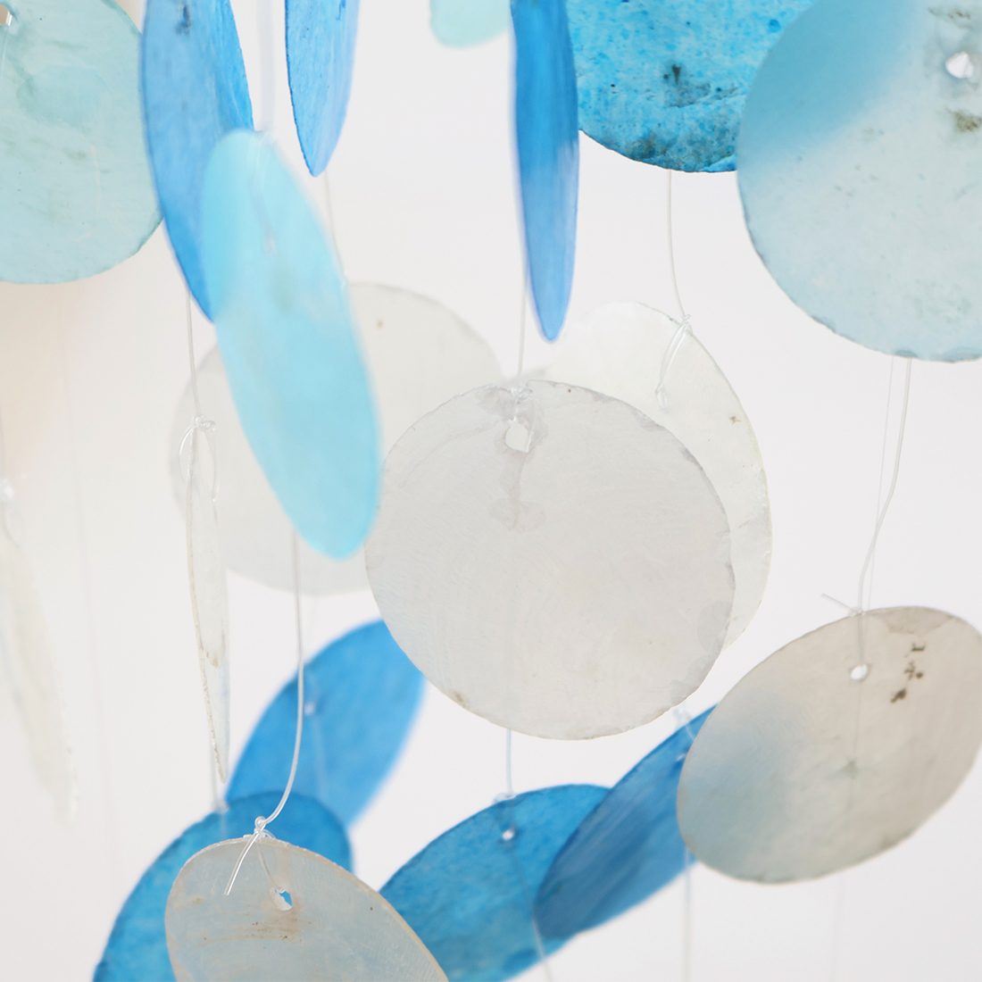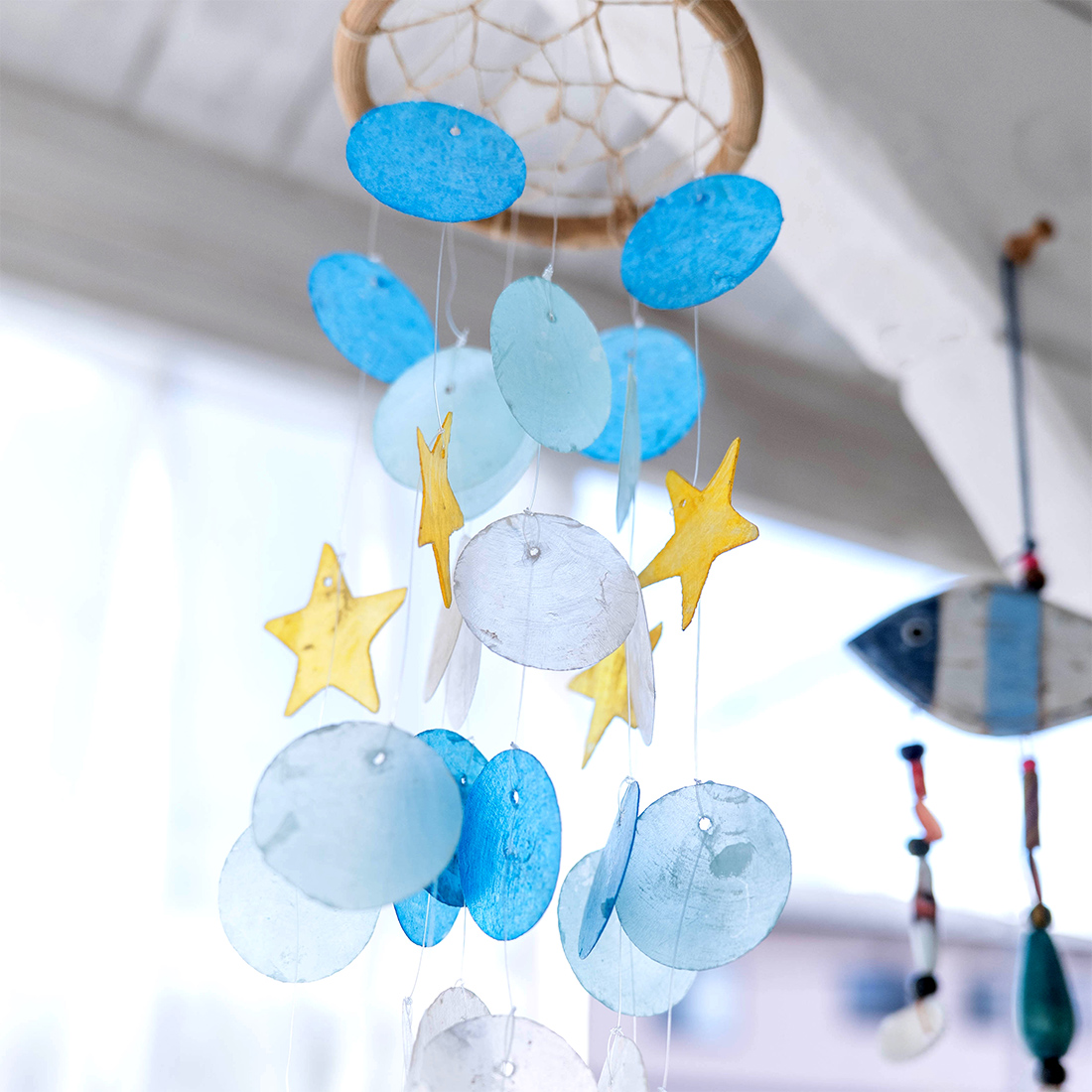 フィリピンの海で取れたカピス貝を加工して作られたオーナメントです。爽やかなカラーとカピスが重なり合って聞こえる音色で夏らしい雰囲気に。窓辺で光を浴びたカピス貝はとても綺麗で目を奪われてしまいます。