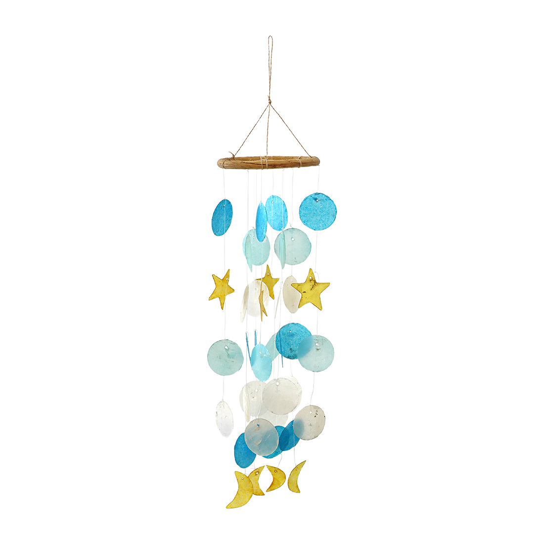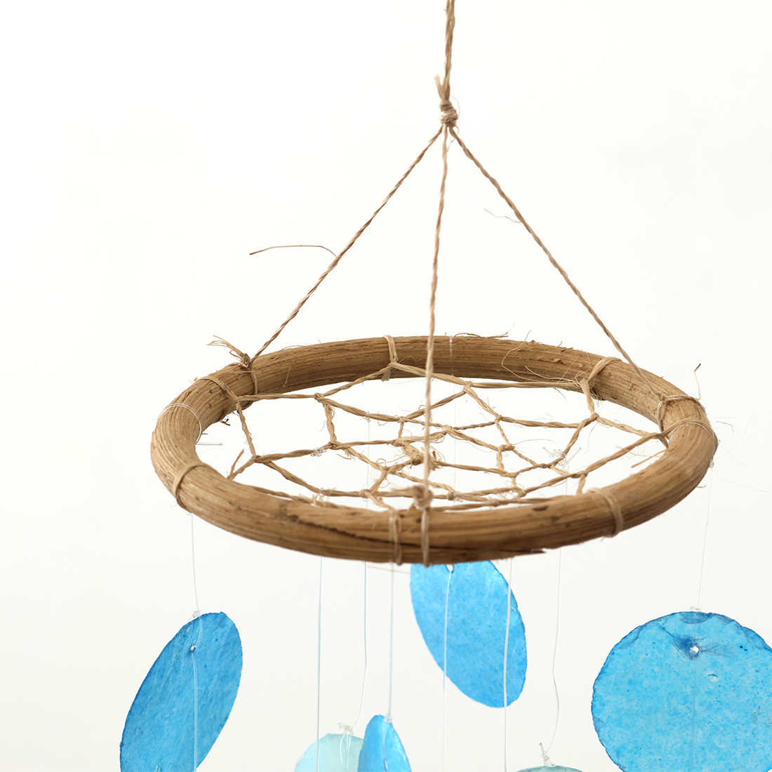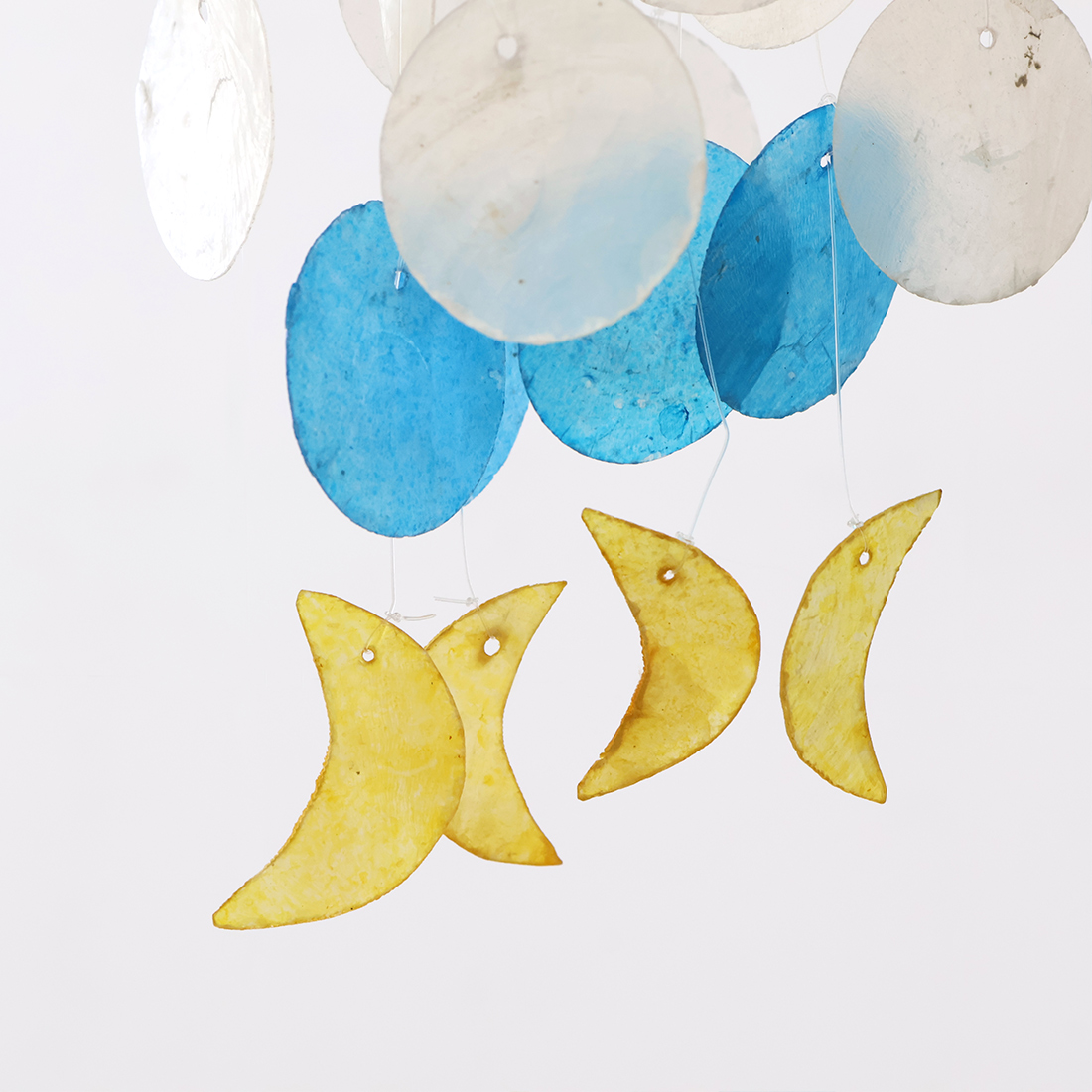 フィリピンの海で取れたカピス貝を加工して作られたオーナメントです。爽やかなカラーとカピスが重なり合って聞こえる音色で夏らしい雰囲気に。窓辺で光を浴びたカピス貝はとても綺麗で目を奪われてしまいます。