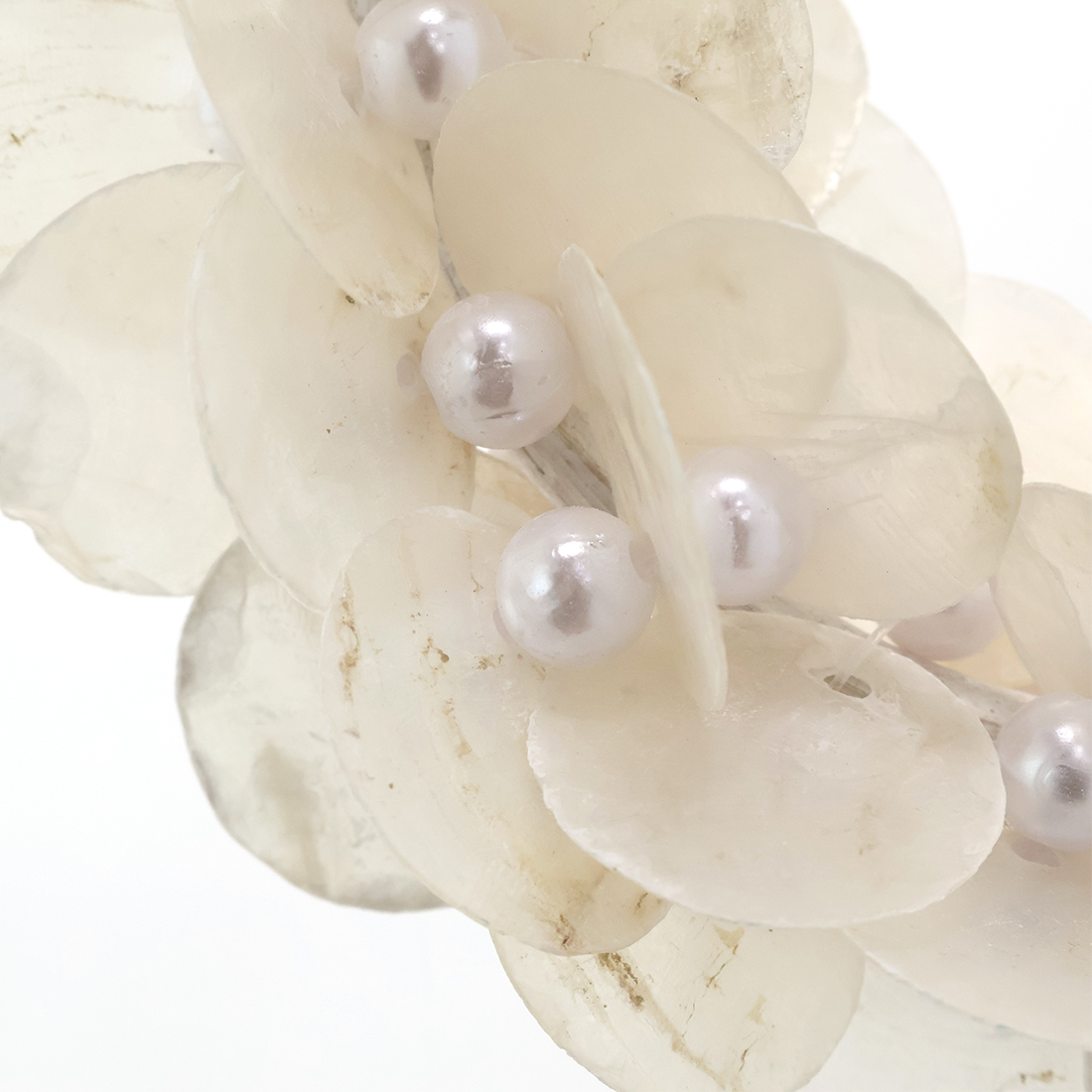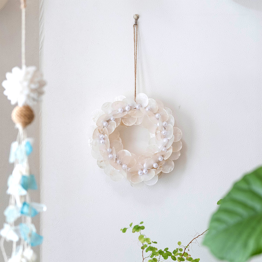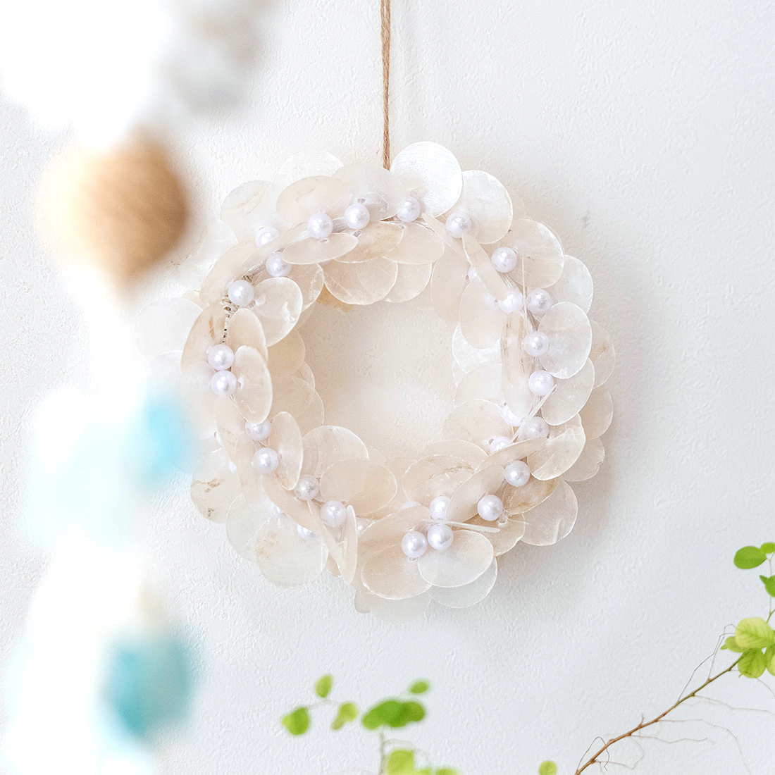 フィリピンの海で取れたカピス貝を加工して作られたリースです。パールを飾り、エレガントなお花のリースのようにデザインしました。 ※天然の貝を加工しているため、不揃いであったり少々欠けている場合があります。