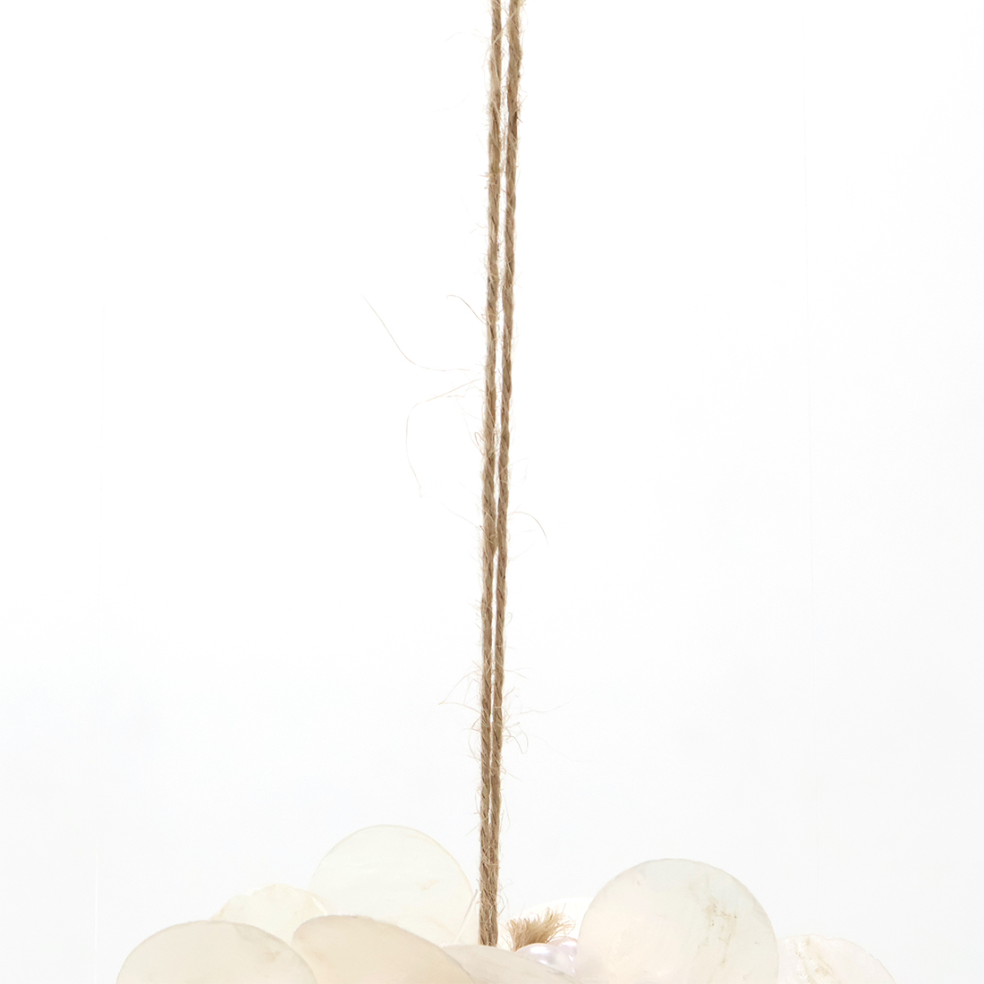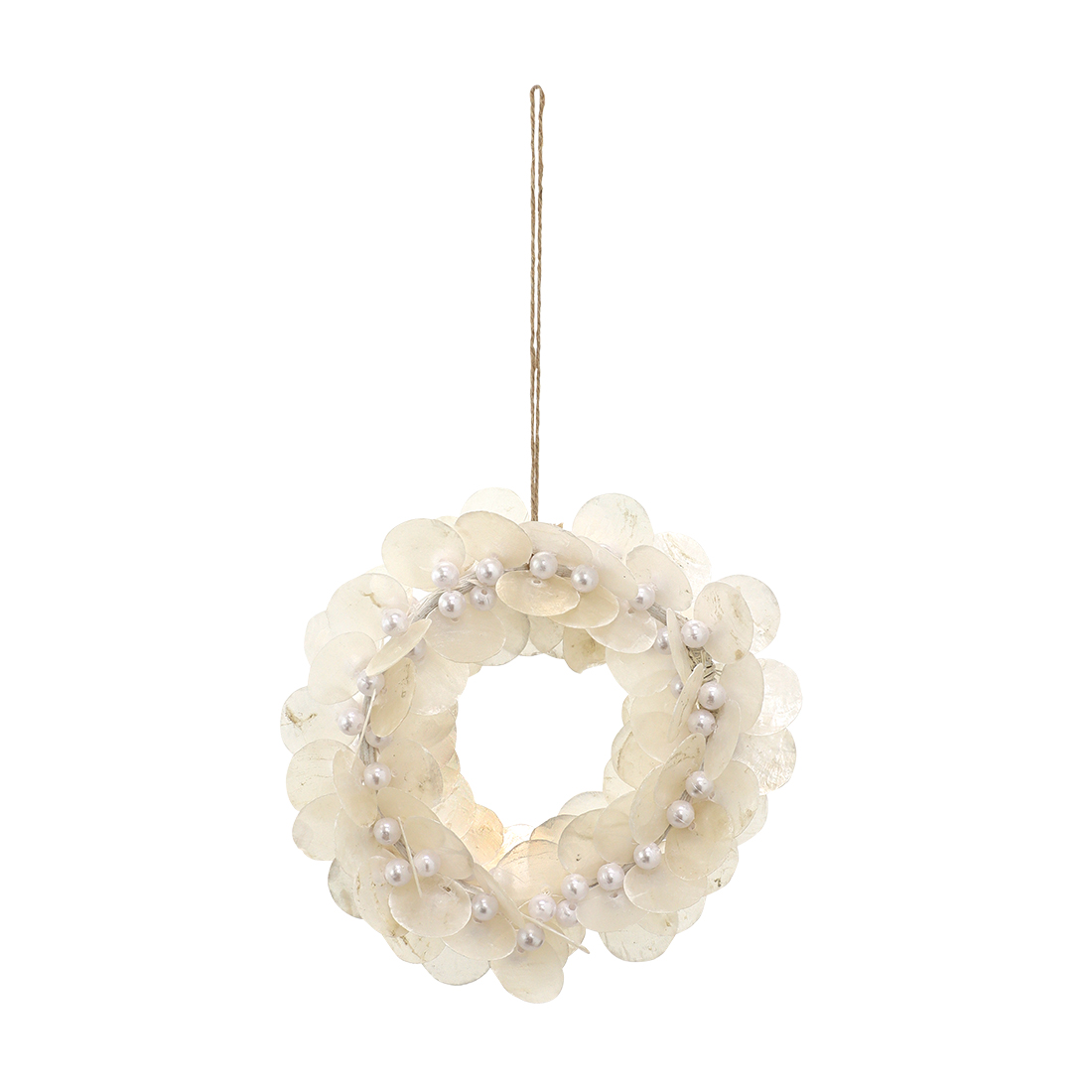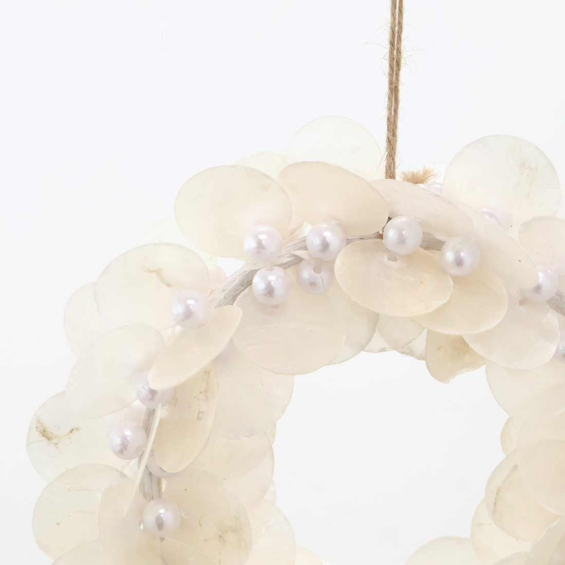 フィリピンの海で取れたカピス貝を加工して作られたリースです。パールを飾り、エレガントなお花のリースのようにデザインしました。 ※天然の貝を加工しているため、不揃いであったり少々欠けている場合があります。