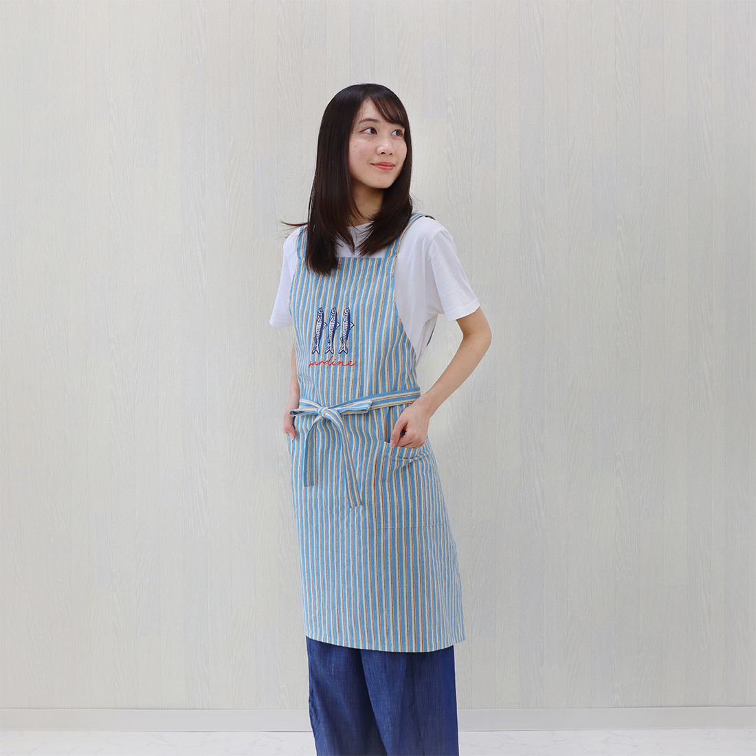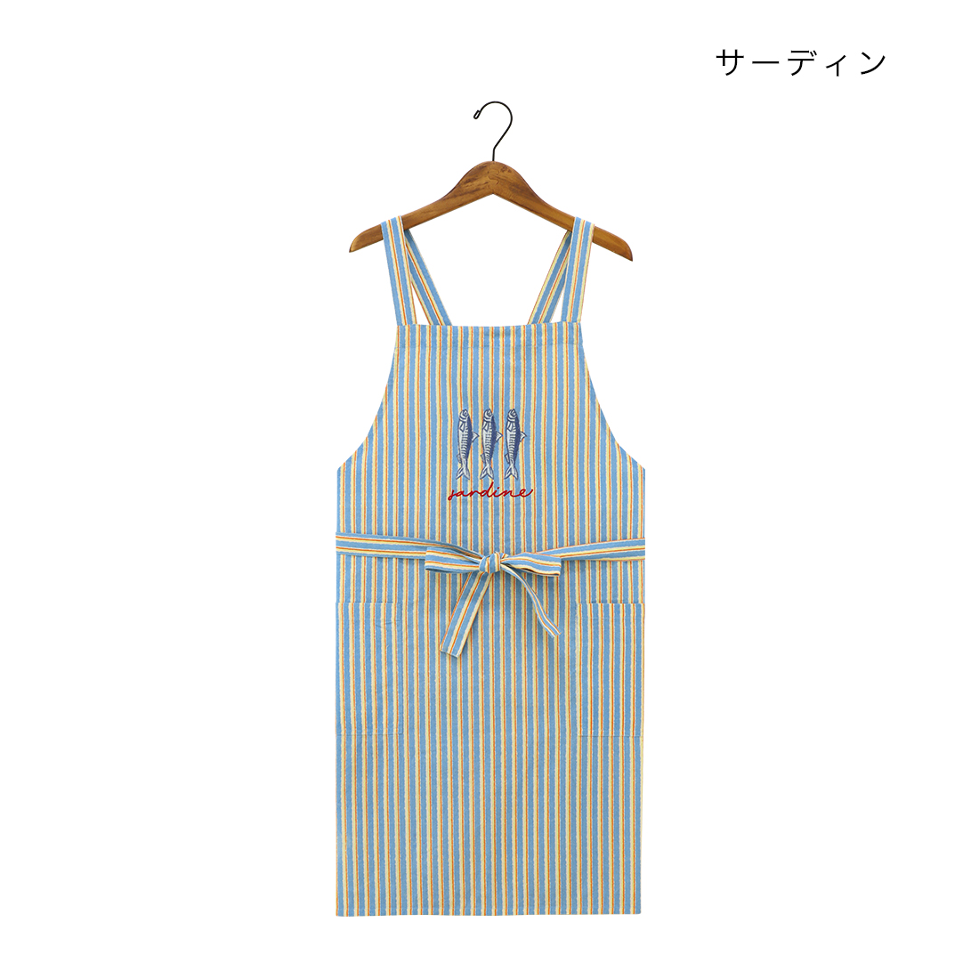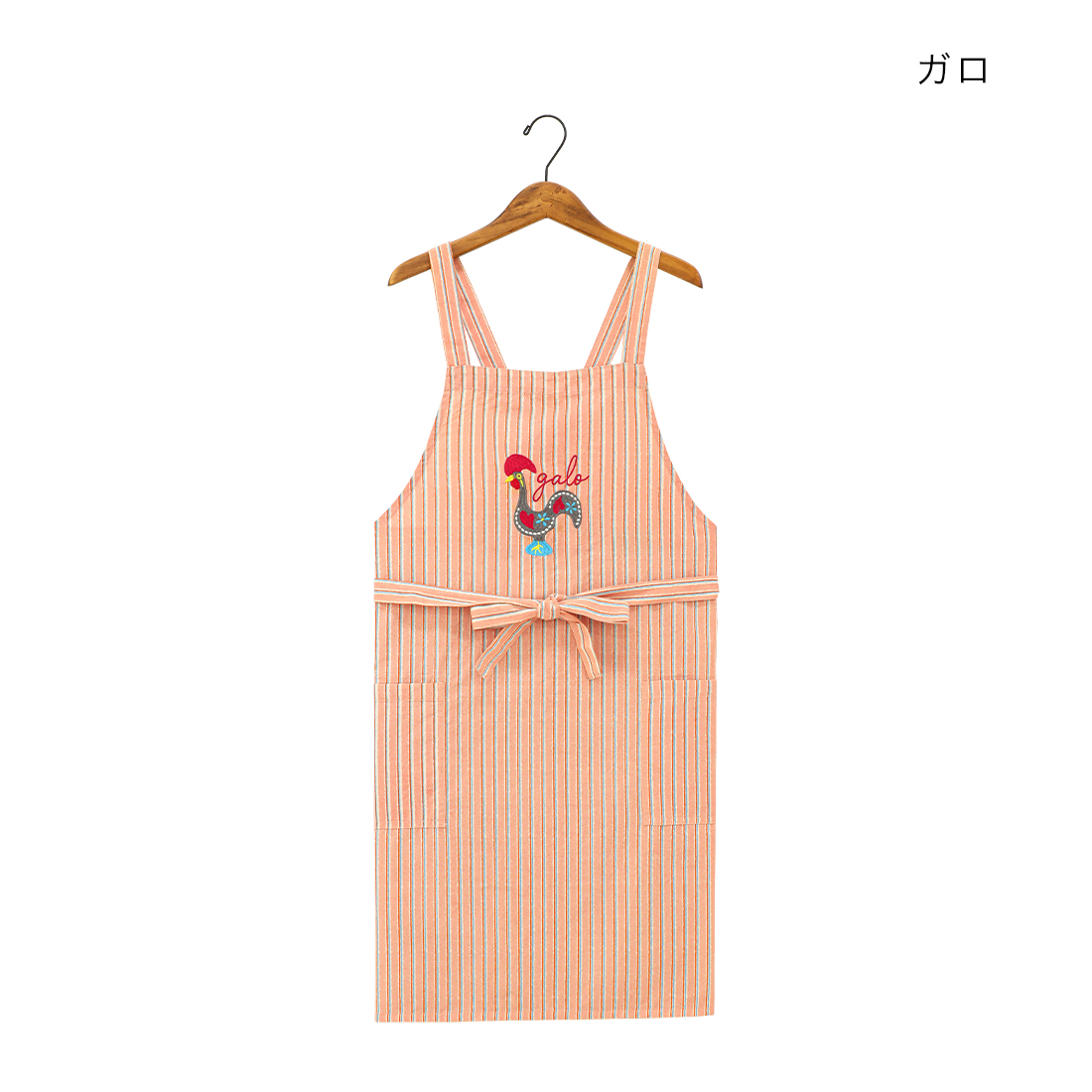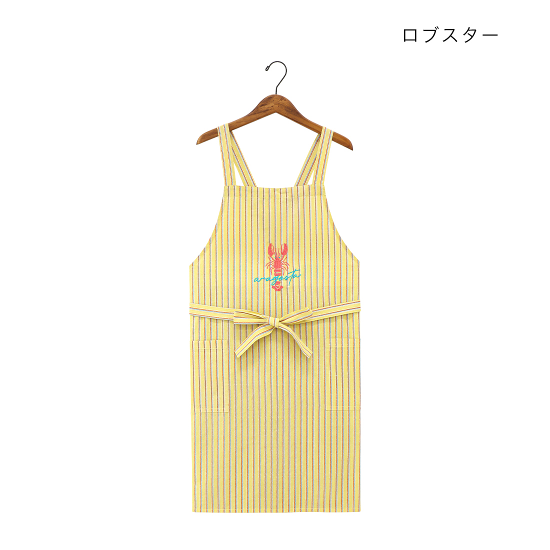 爽やかなストライプに南欧テイストを感じるエプロン。心が明るく元気になるような可愛いカラーとユニークな絵柄がポイント♪お料理が楽しくなりそうです。