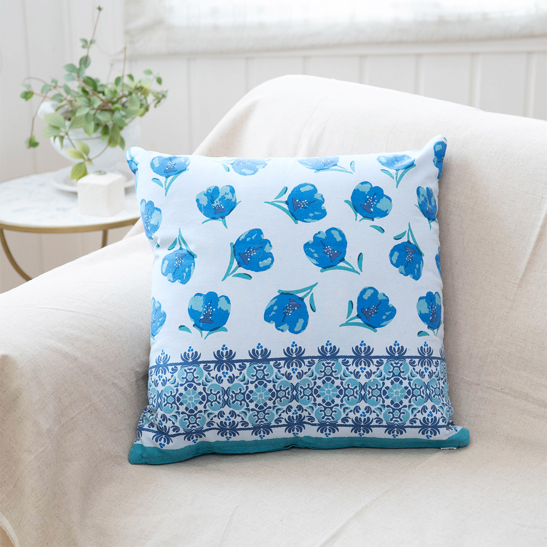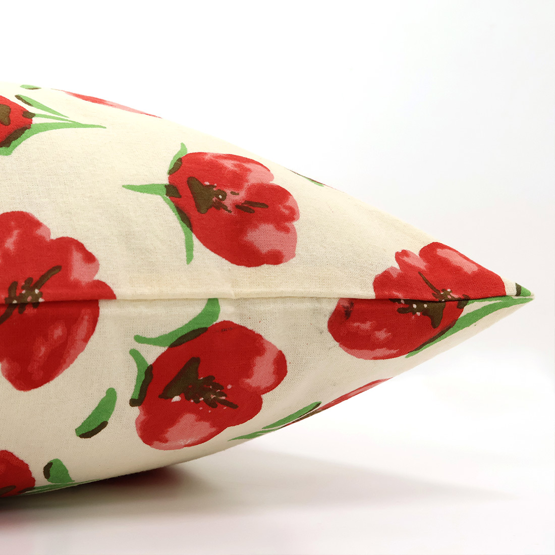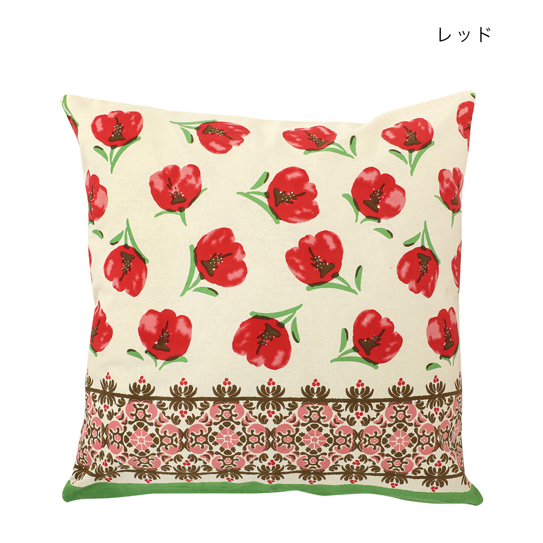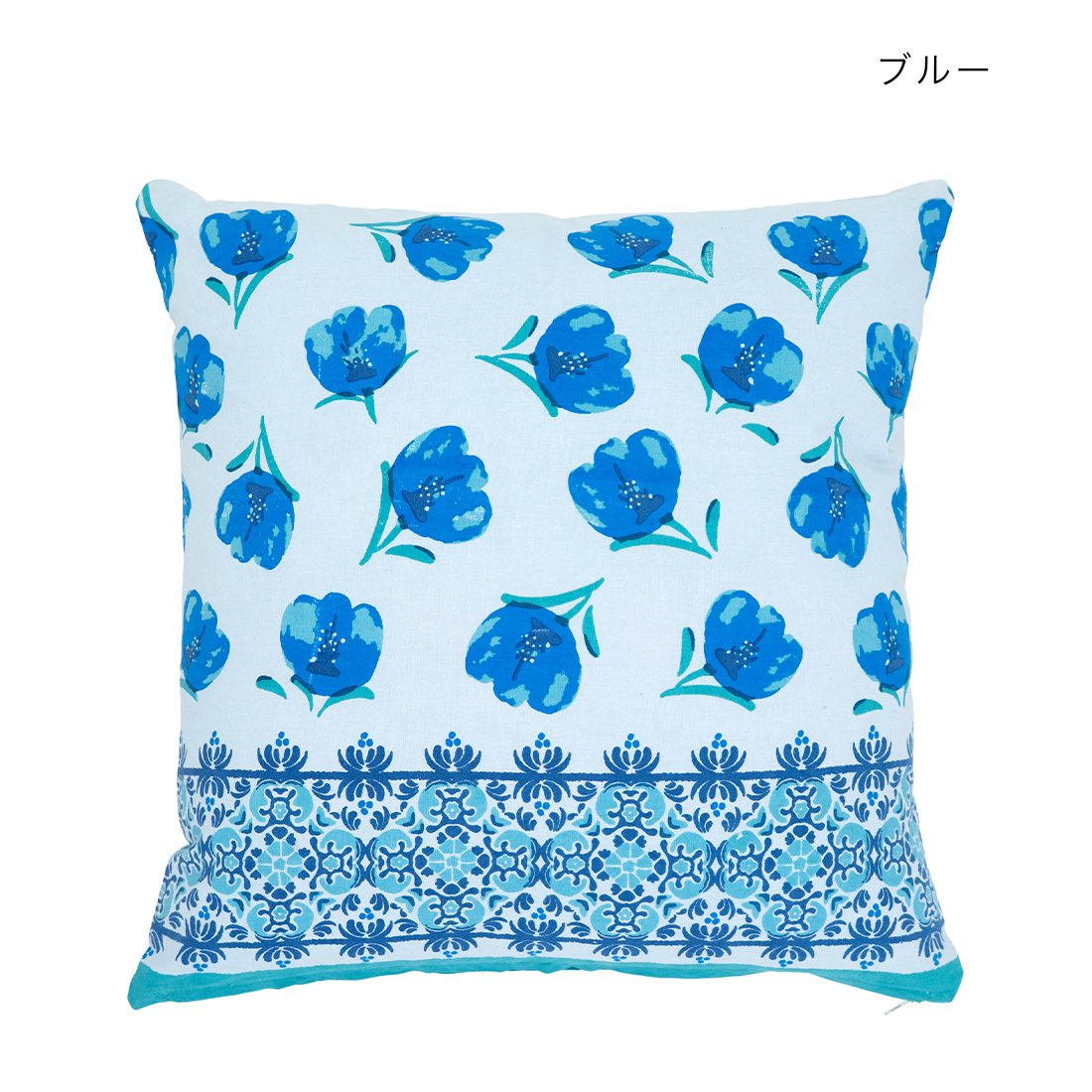 スペイン・アンダルシア地方の陶器をモチーフにしたポピー柄クッションカバー。日々の暮らしに華やぎを添えます。
