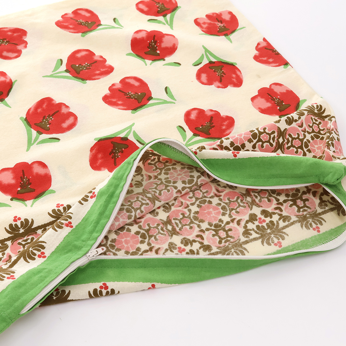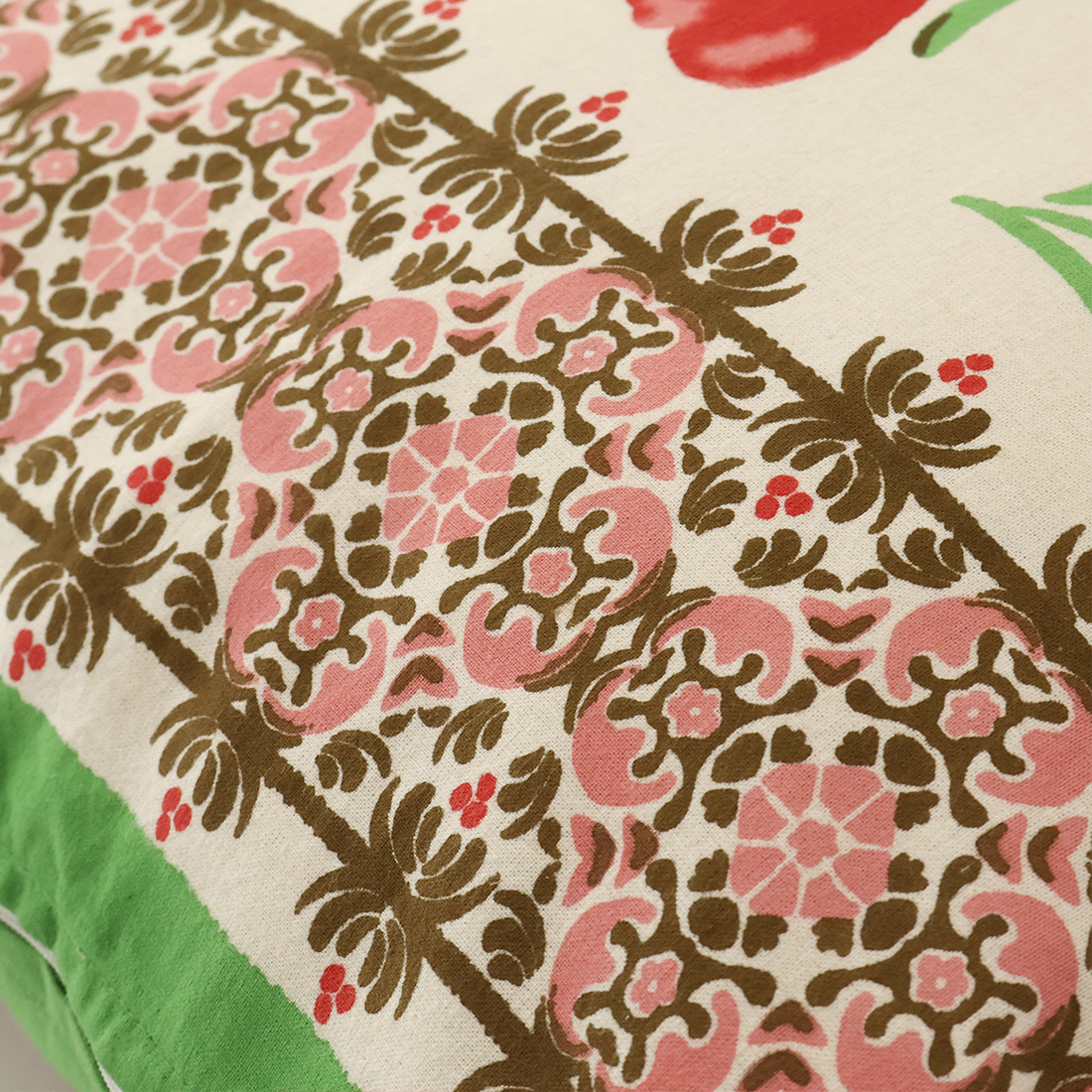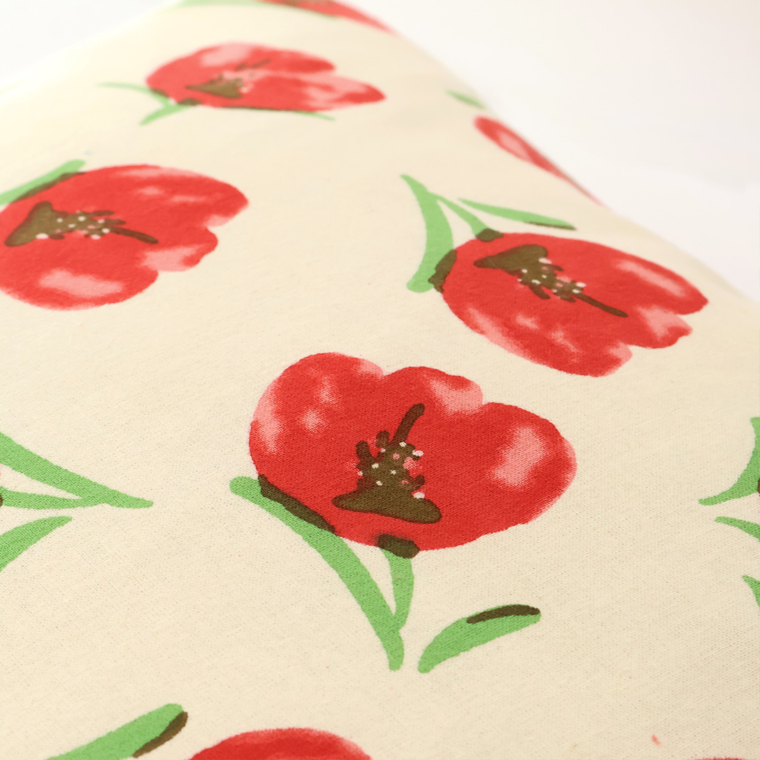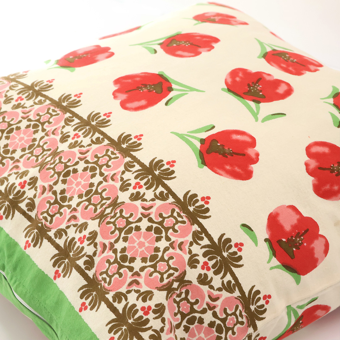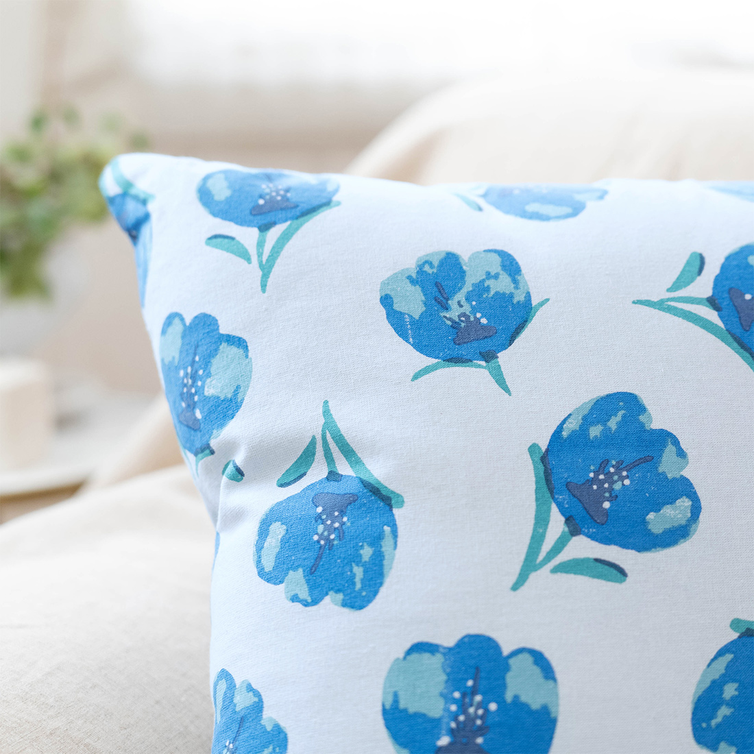 スペイン・アンダルシア地方の陶器をモチーフにしたポピー柄クッションカバー。日々の暮らしに華やぎを添えます。