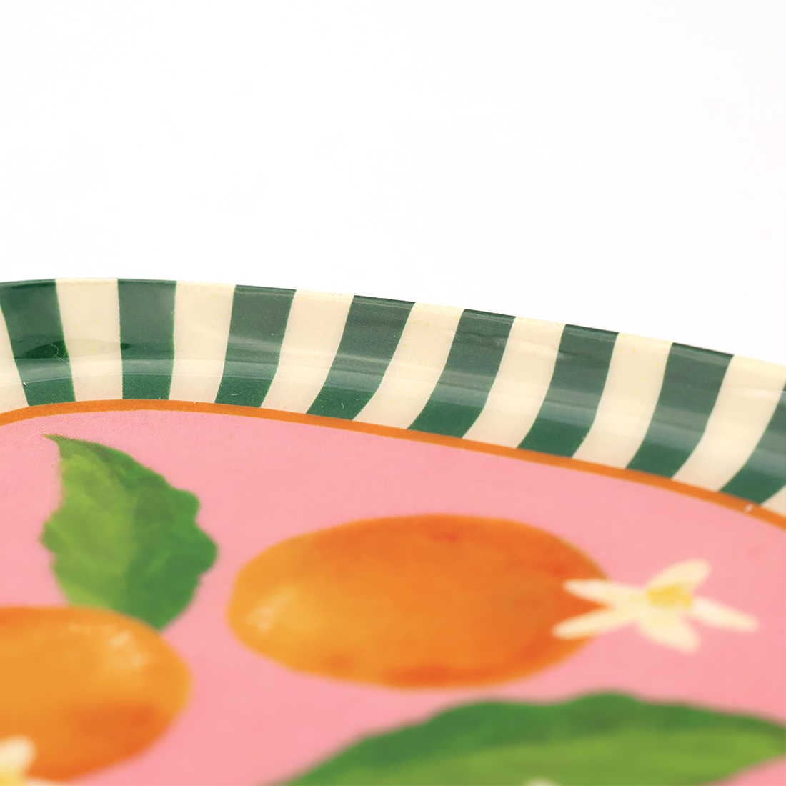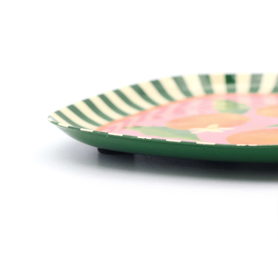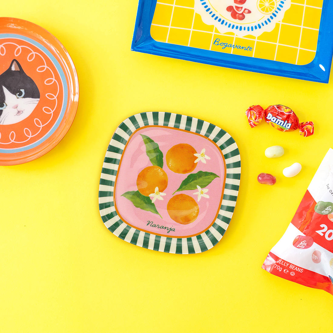 南欧をイメージしたポップな配色とモチーフが目を引く、ミニサイズのアイアントレイ。アクセサリーや鍵、コインなどの小物トレイとしてはもちろん、デスク周りや玄関の整理アイテムとしても活躍。