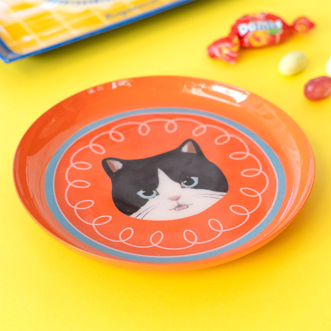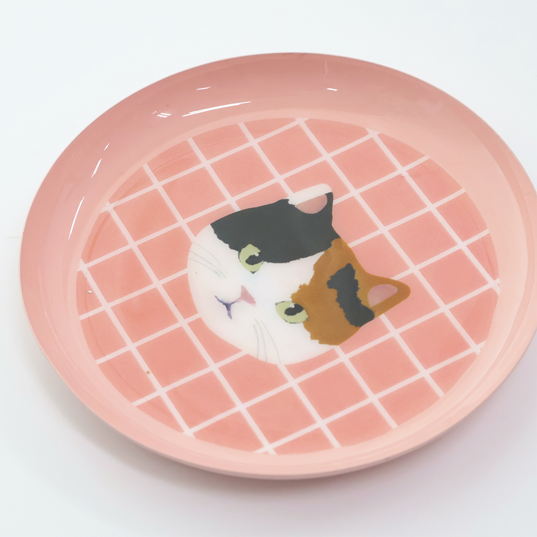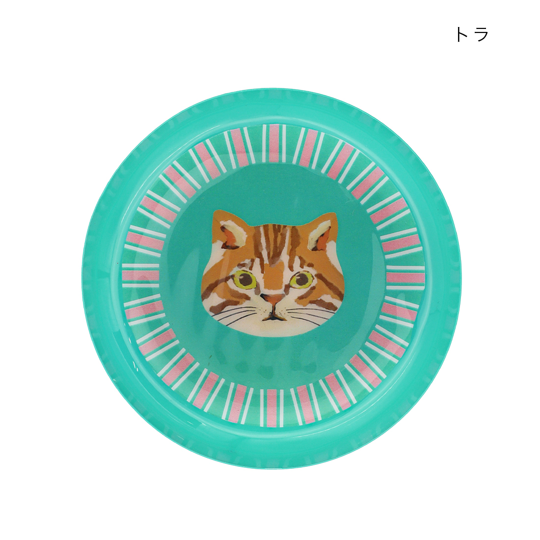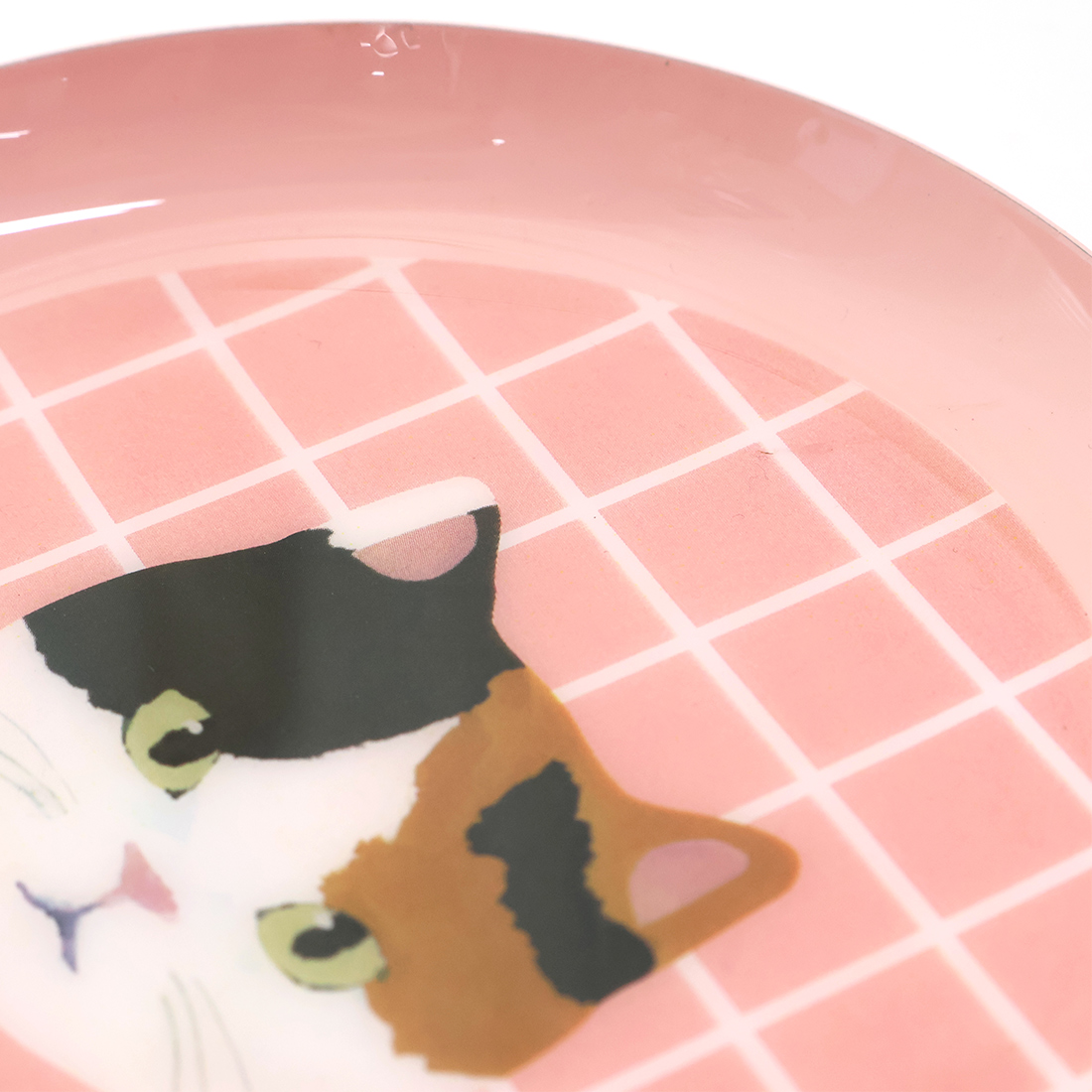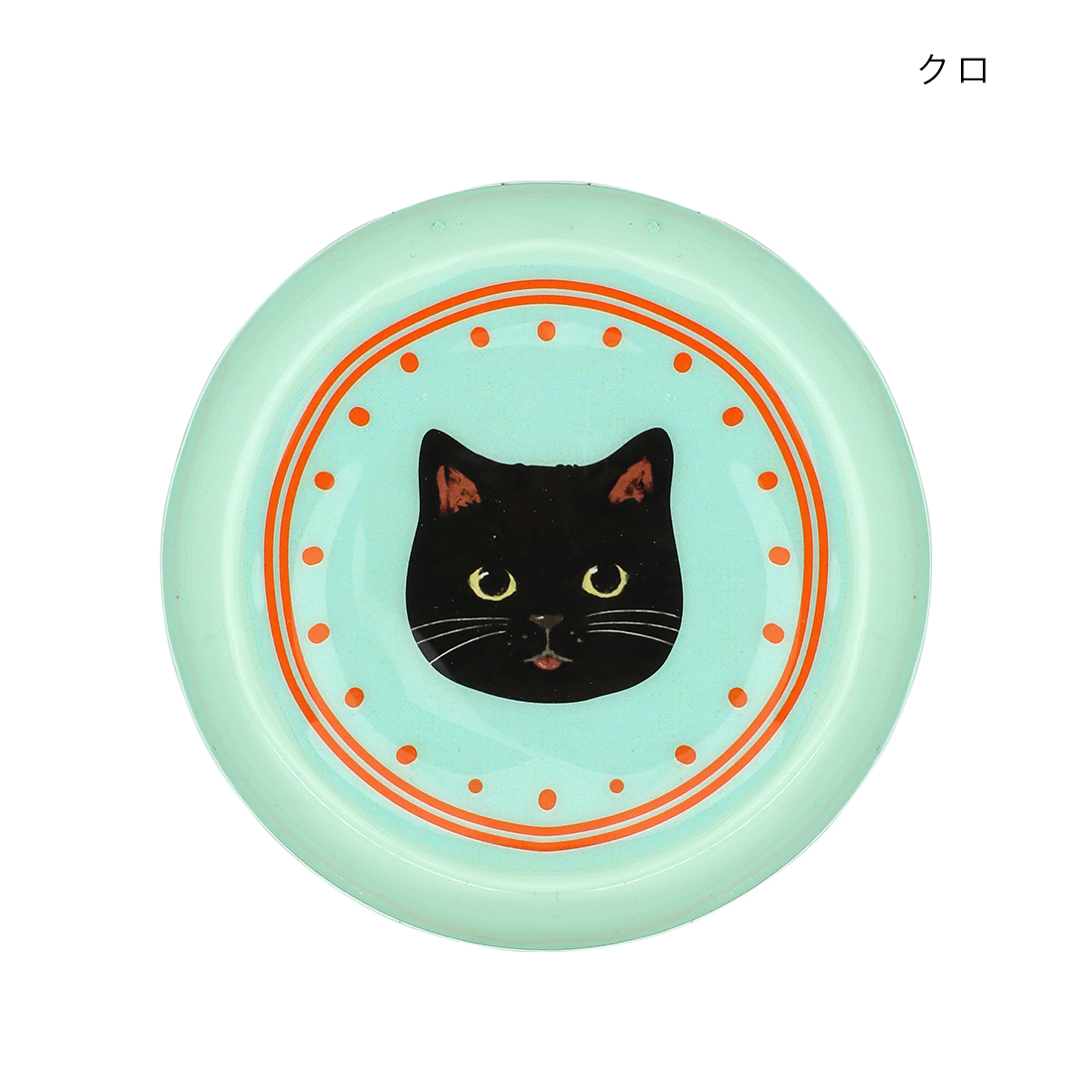ネコ好きのお客様の目を惹く、カラフルなネコデザインのアイアン製ラウンドトレイ。