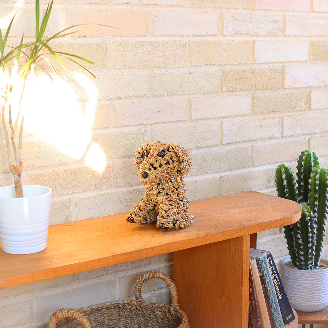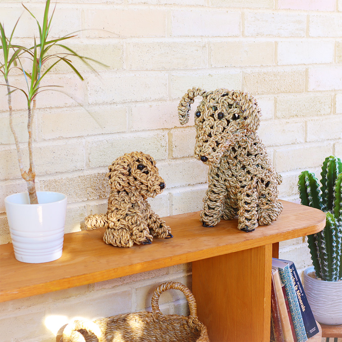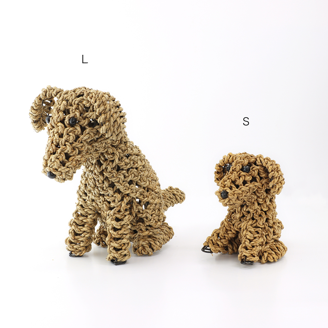 水草(シーグラス)を丁寧に編み込んで仕上げた、お座りしたドッグモチーフのハンドクラフトオブジェ。
