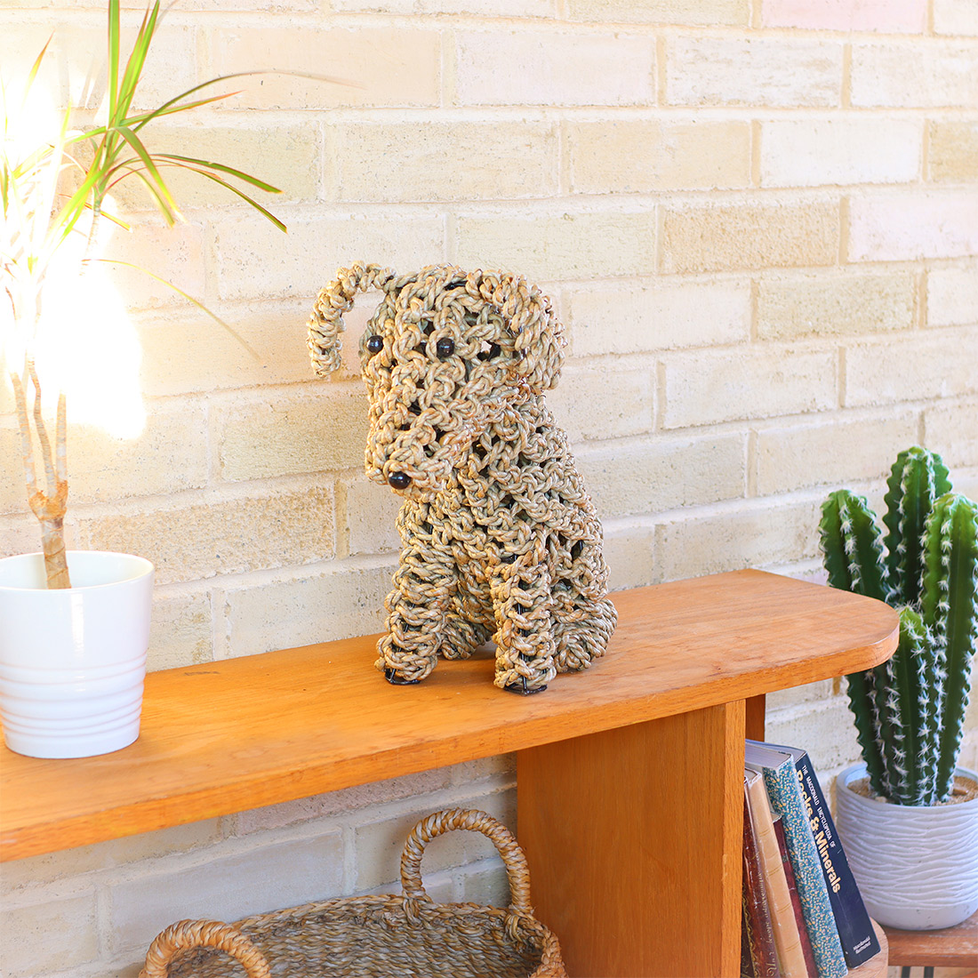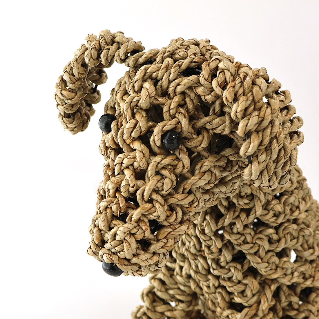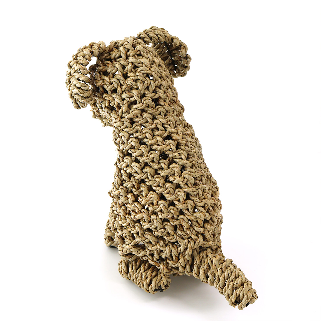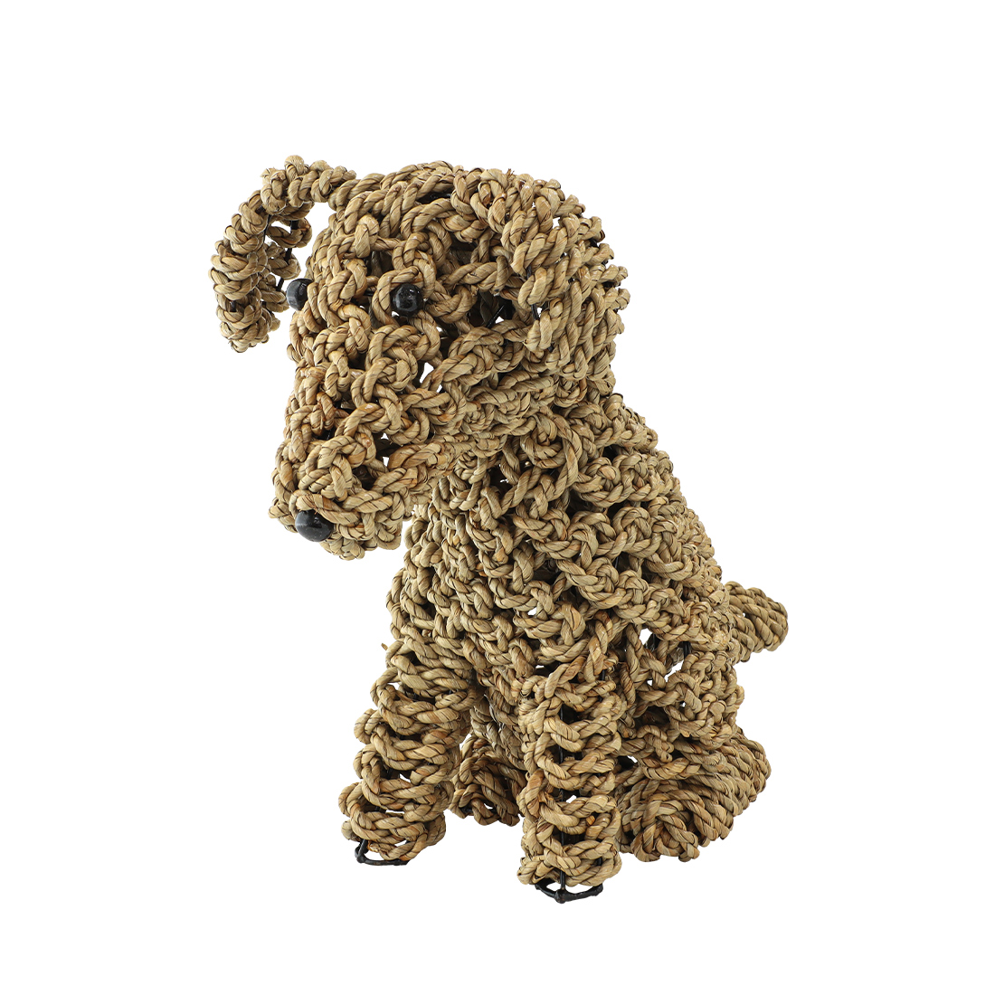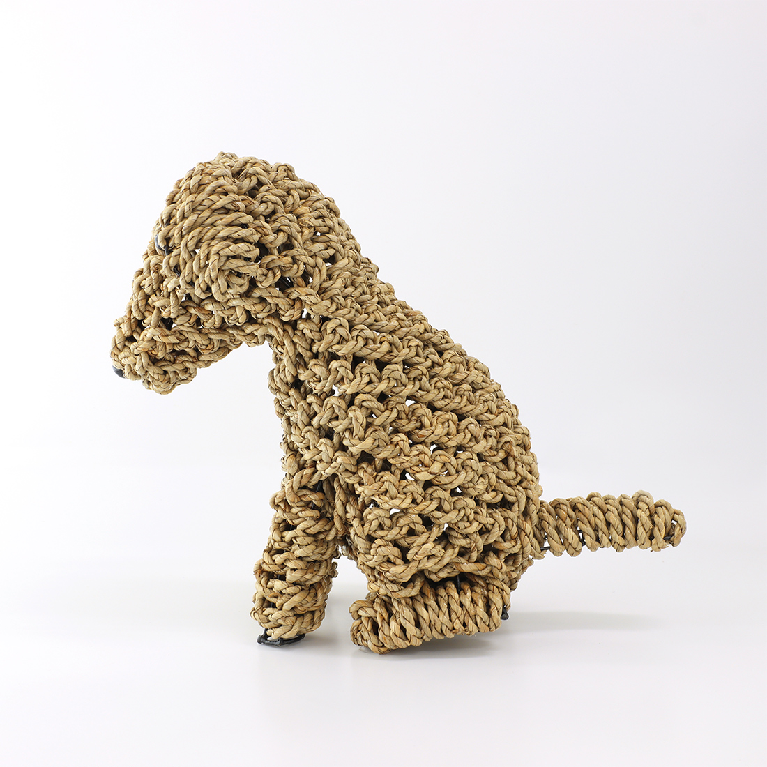 水草(シーグラス)を丁寧に編み込んで仕上げた、お座りしたドッグモチーフのハンドクラフトオブジェ。