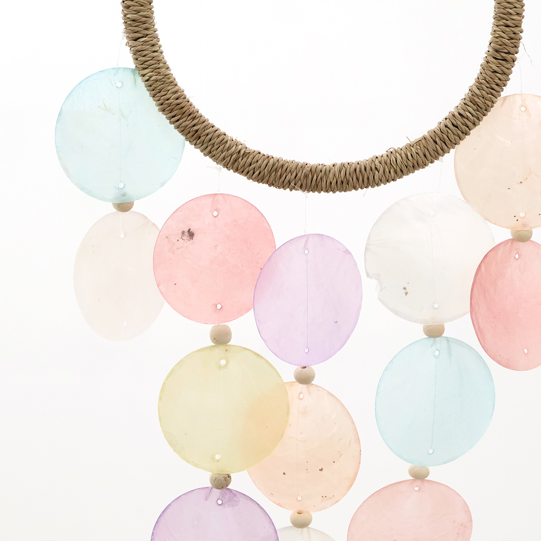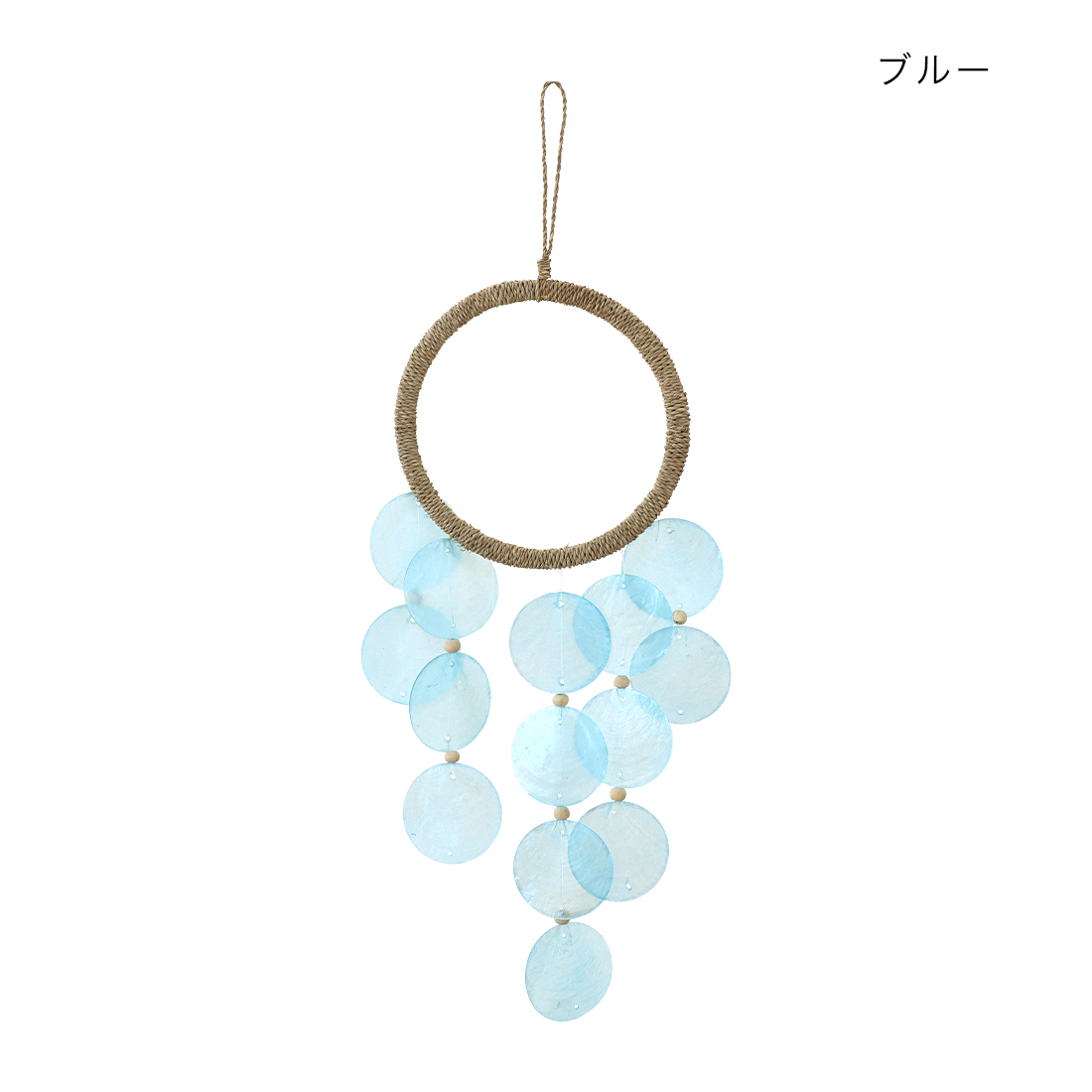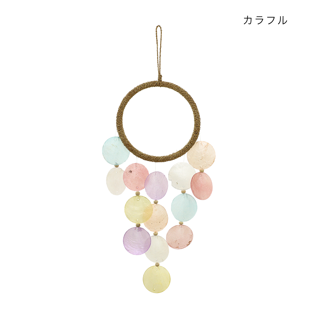 カピス貝を加工して作ったガーランド。光を浴びるとカピス貝がやさしくきらめき、空間に爽やかな印象を与えます。壁面や棚まわりの装飾に取り入れやすく、マリン・リゾート・サマー雑貨売場の演出アイテムとして最適。