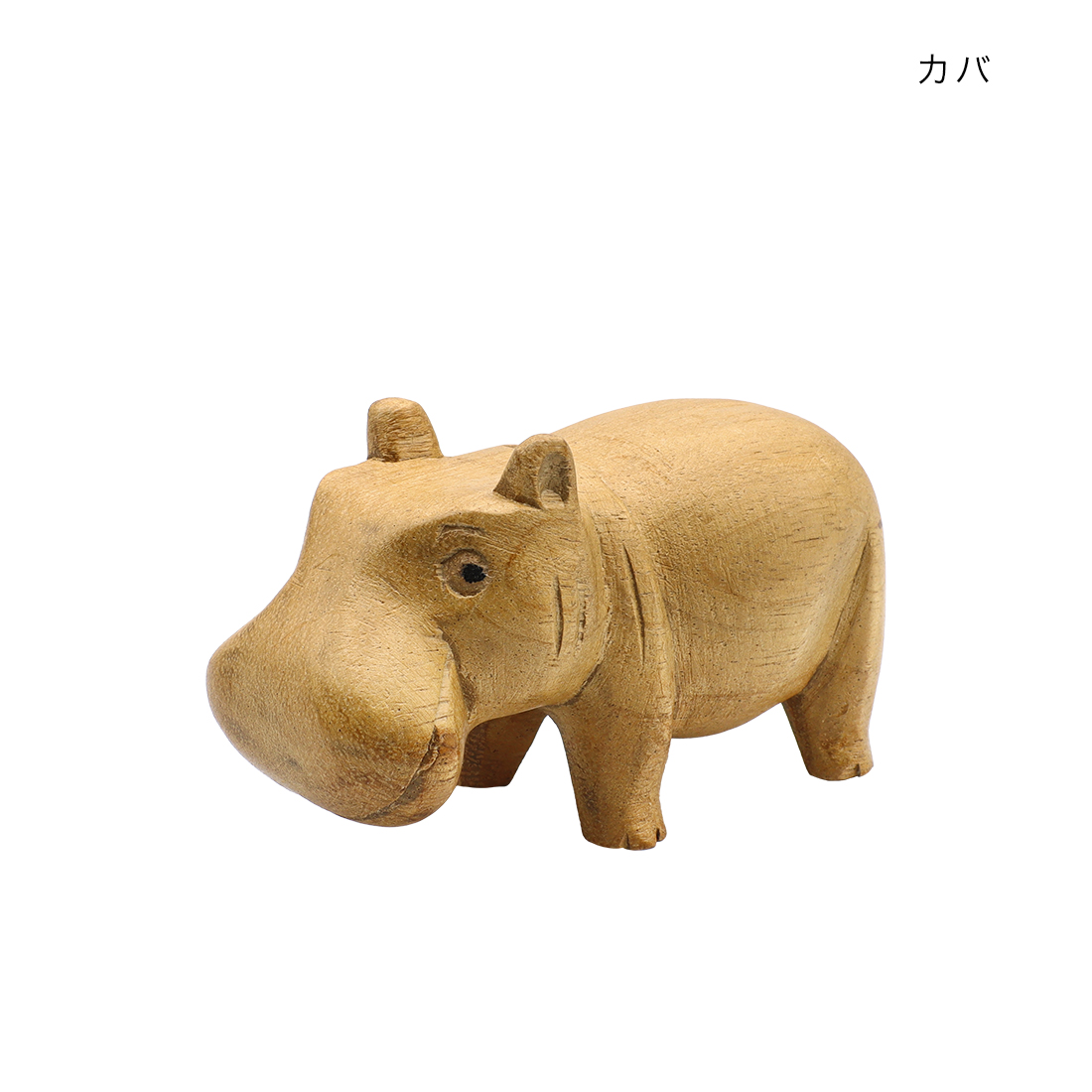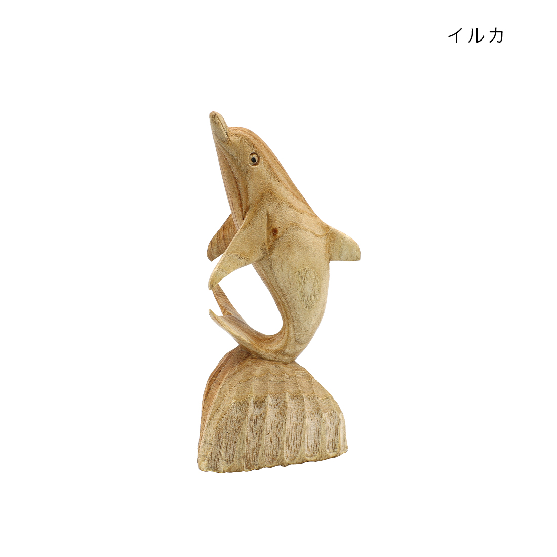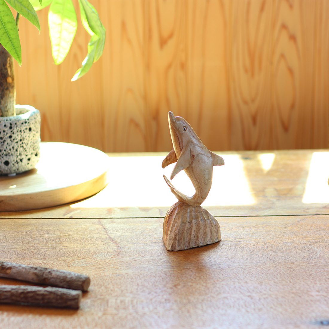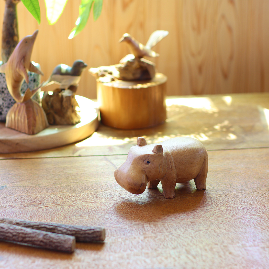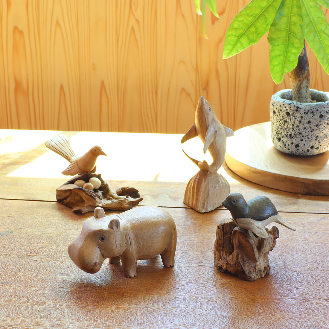 ナチュラル空間に映える、カバとイルカの木彫オブジェ