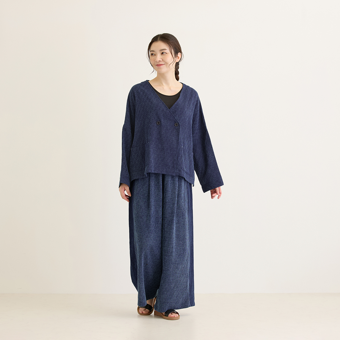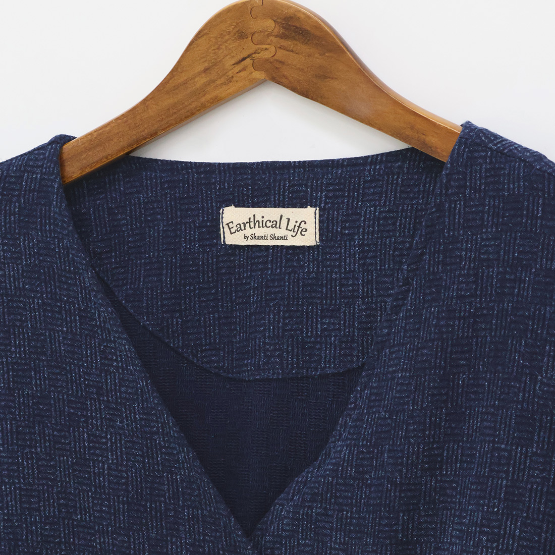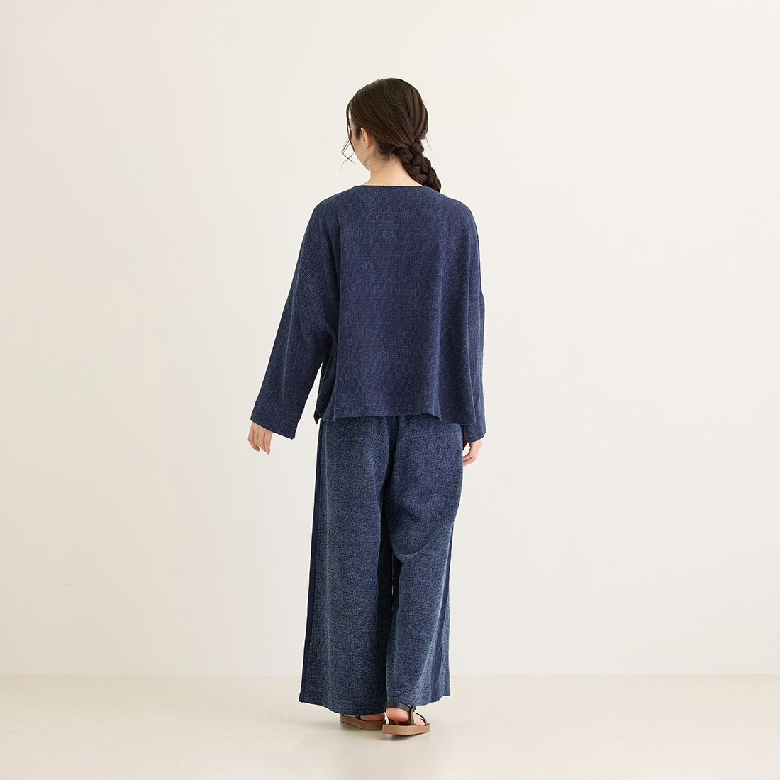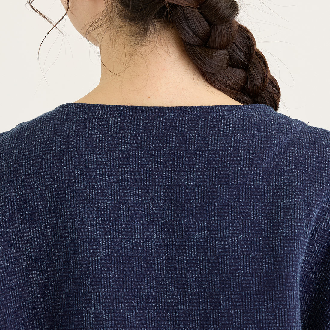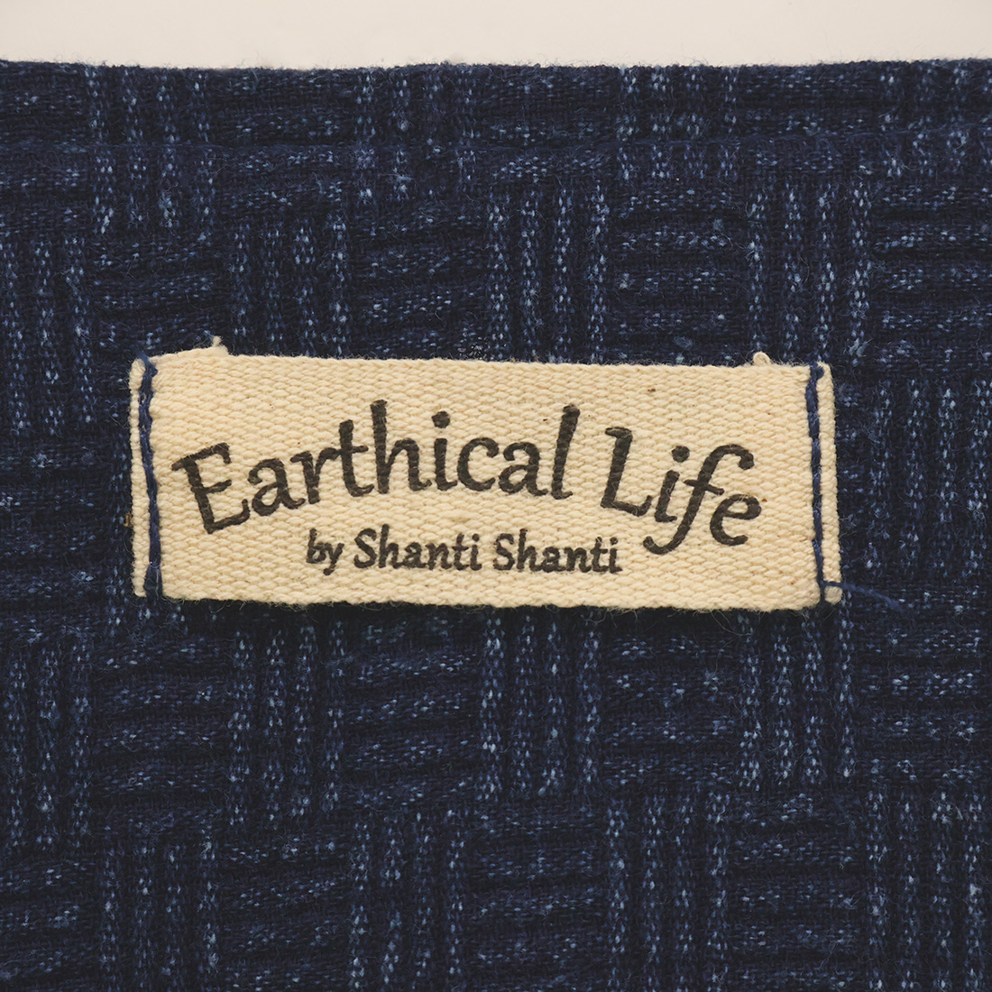 格子状の凹凸ある厚みの生地をインディゴ染めしました。